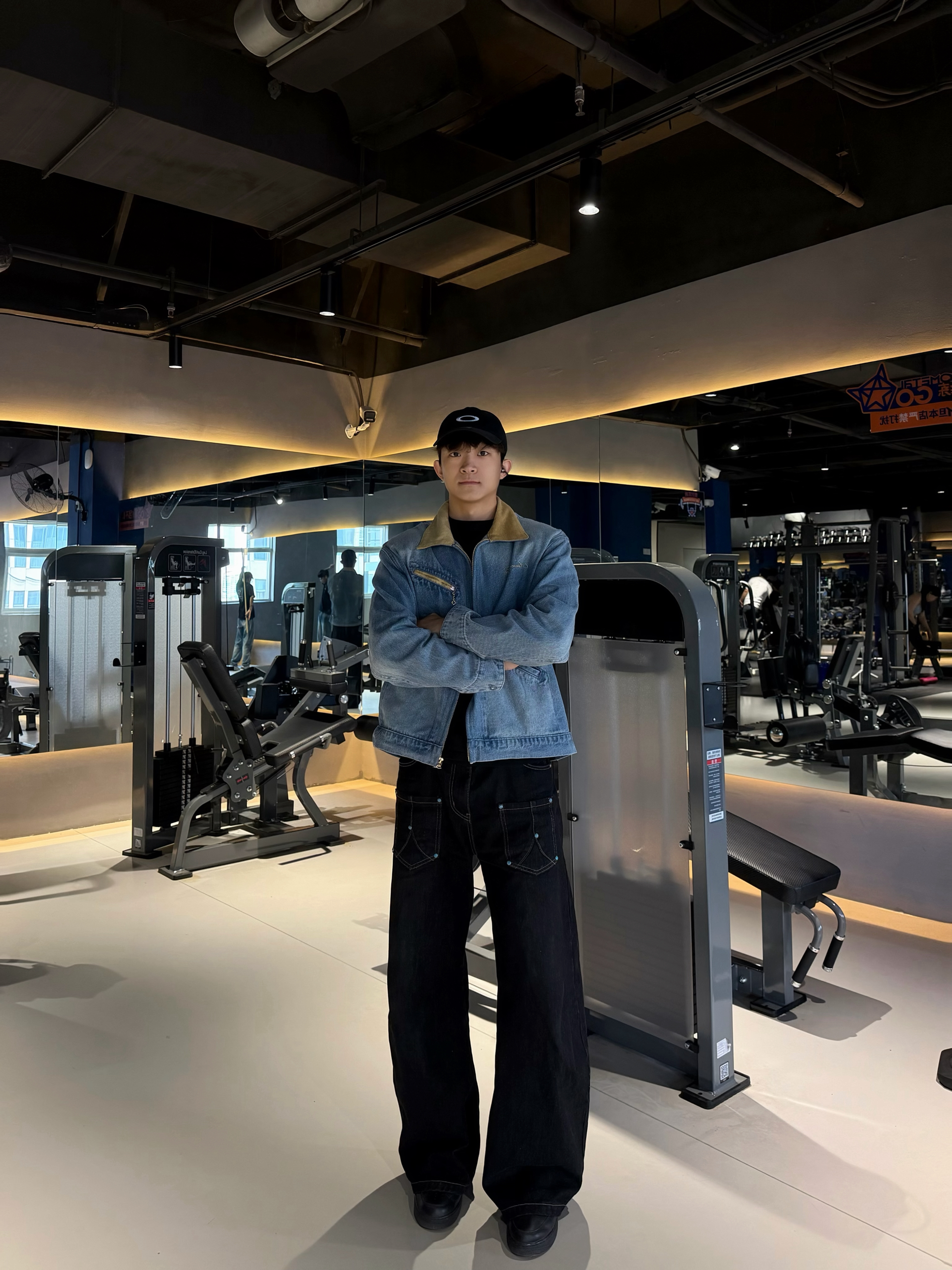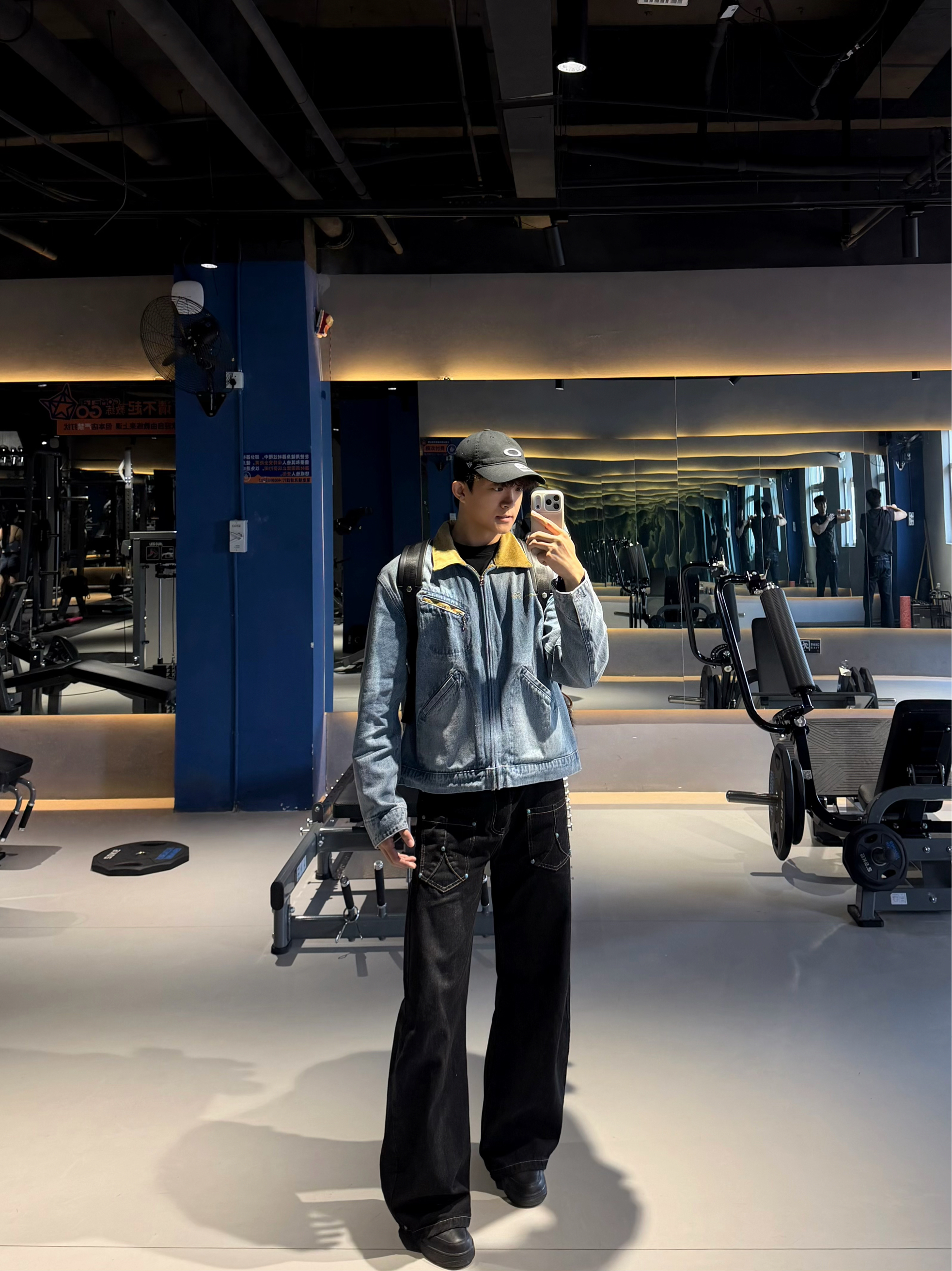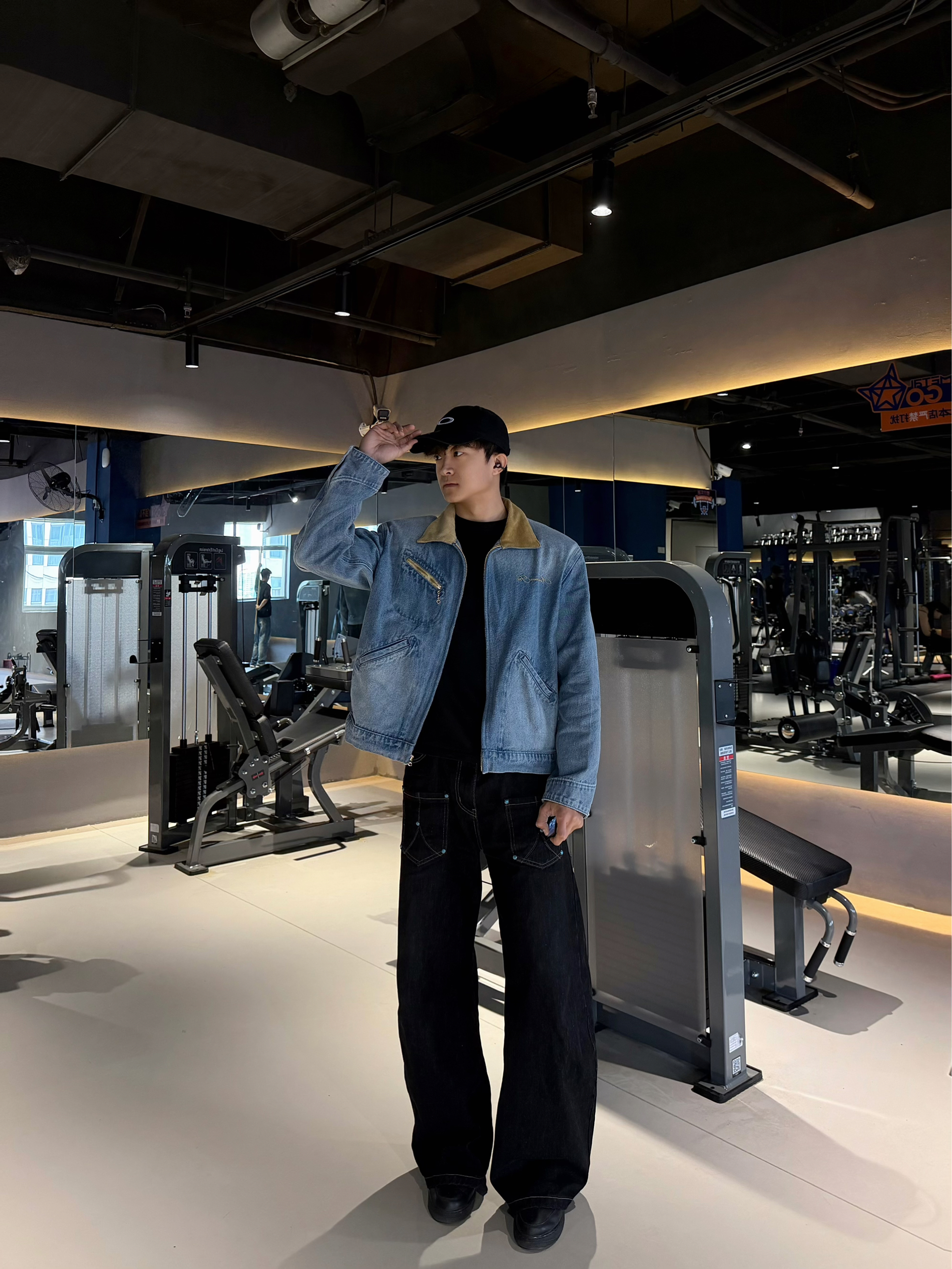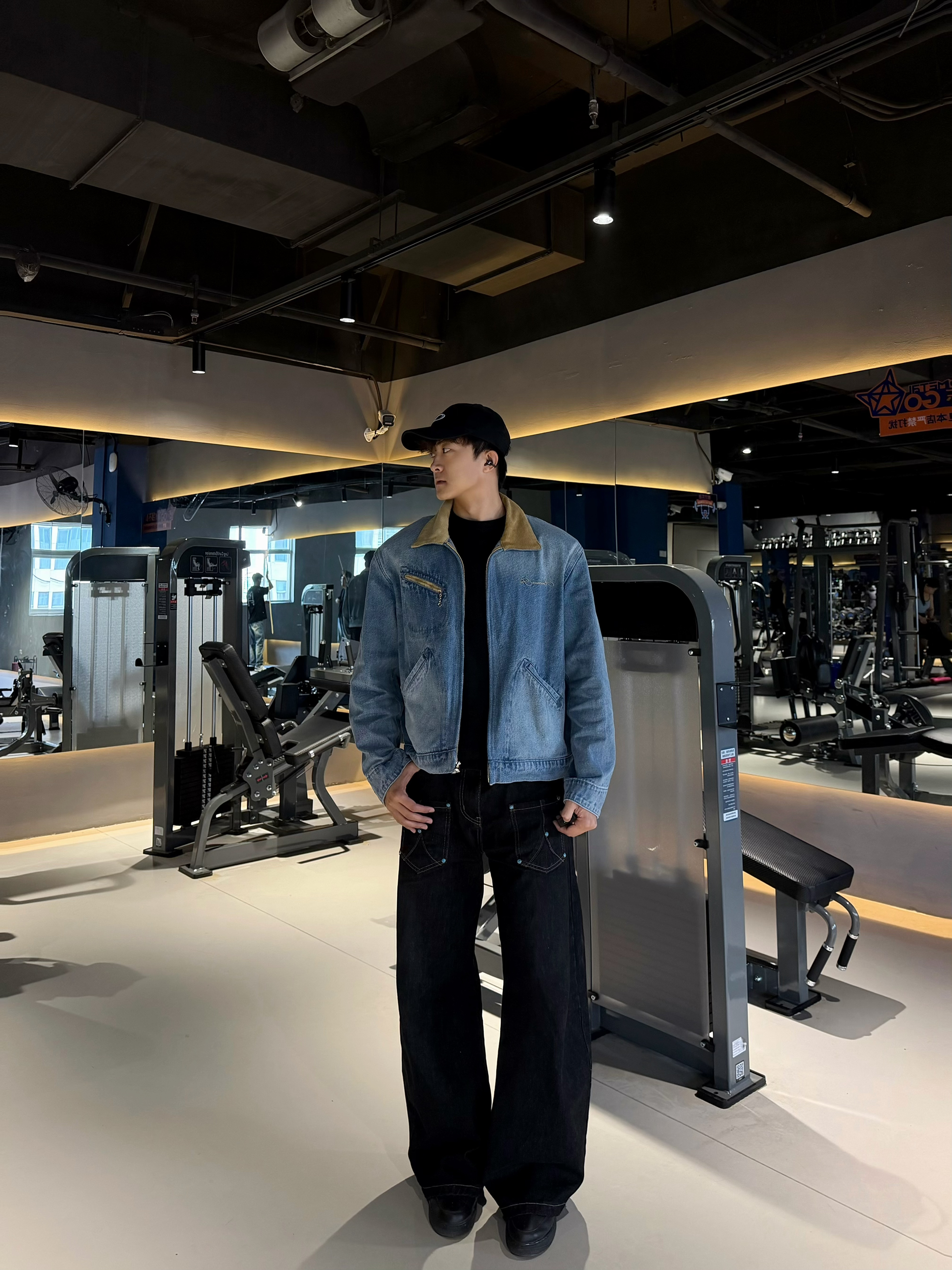 180 140|OOTD穿搭分享 👔|短款做旧牛仔夹克太显肩宽!撞色翻领自带复古滤镜,刚好卡在腰线,完美衬出健身练出的倒三角身材,做旧水洗质感拉满,单穿叠穿都很顶。 👖|黑色阔腿原牛藏肉又显腿长!