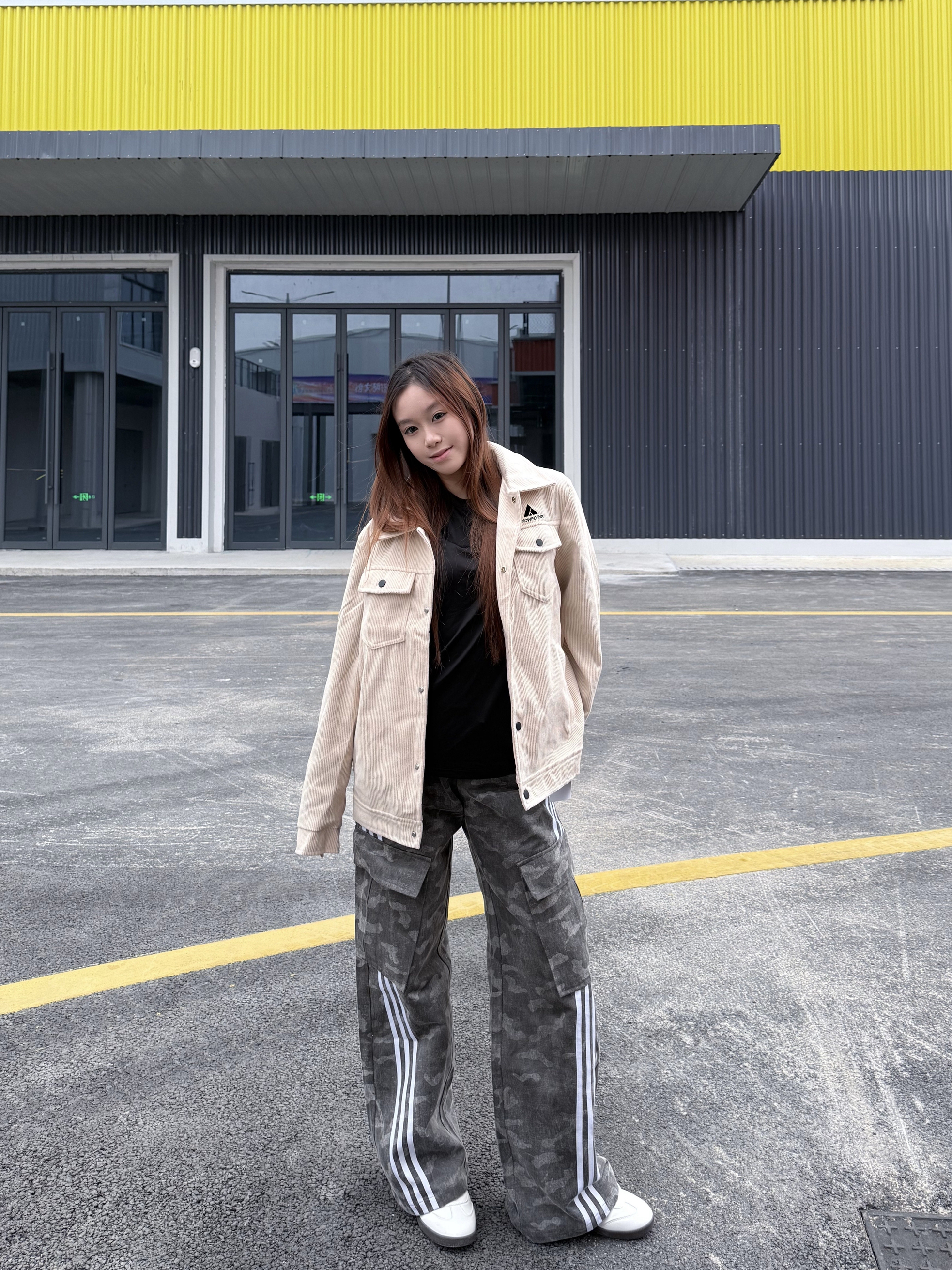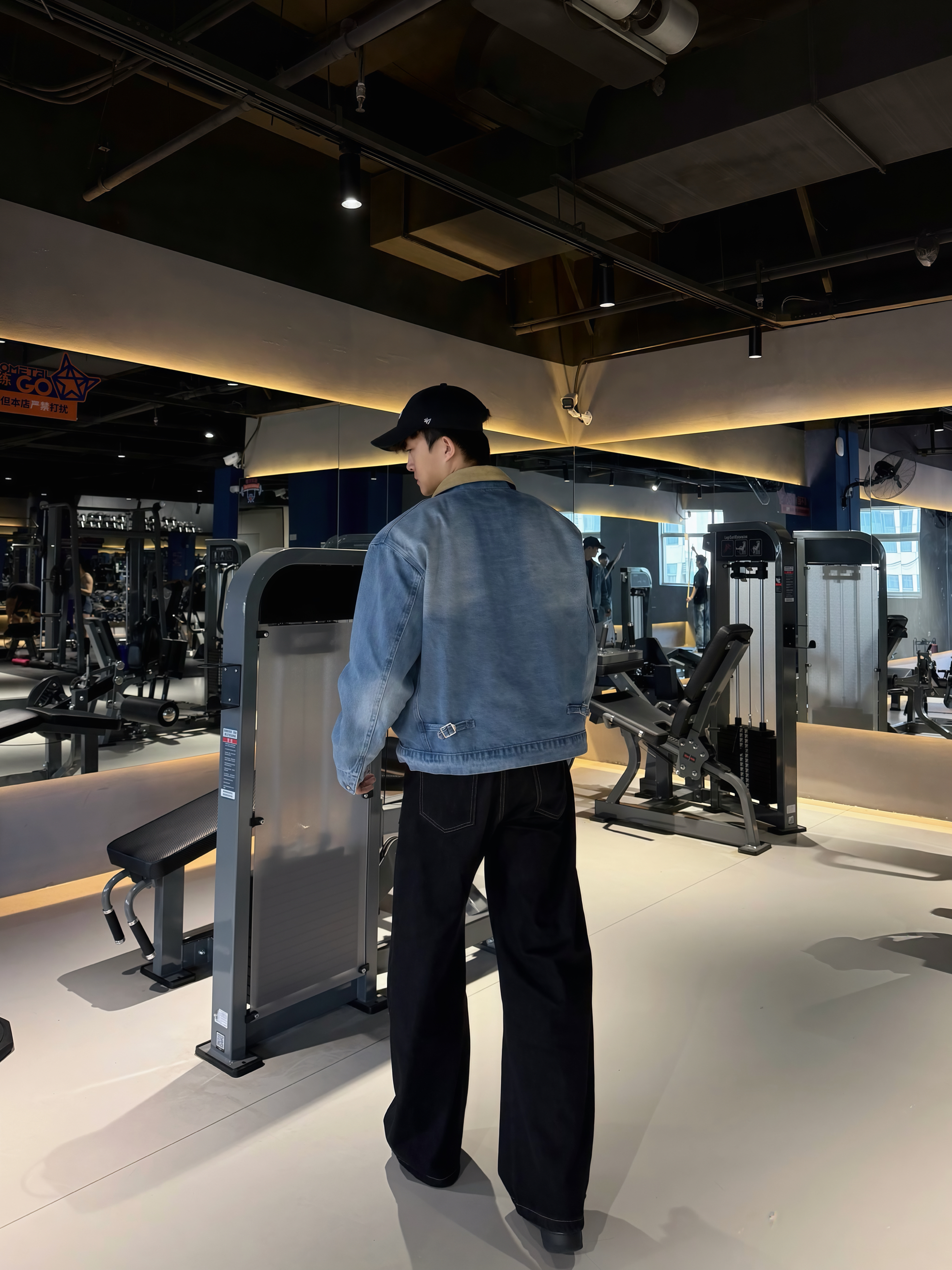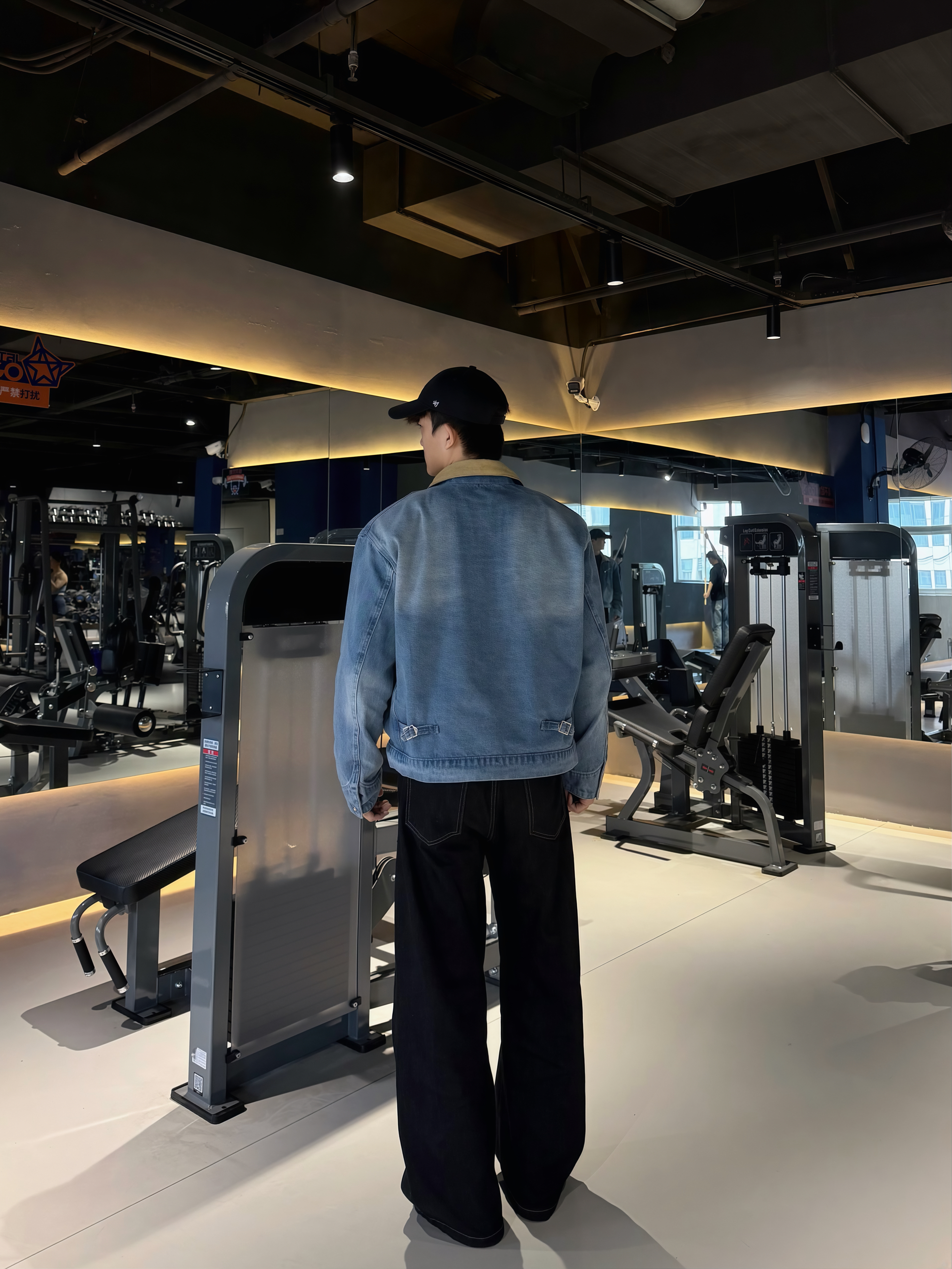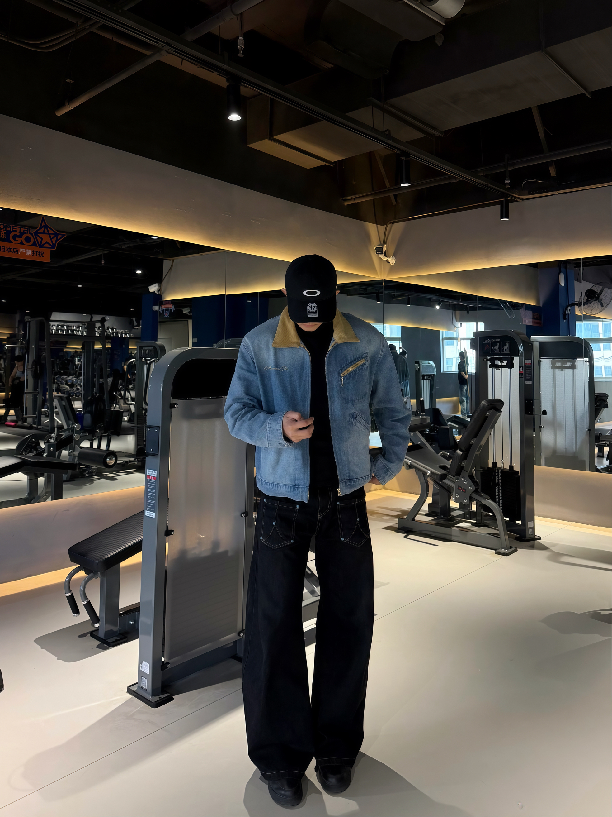 180 140|OOTD穿搭分享 👔|短款做旧牛仔夹克太显肩宽!撞色翻领自带复古滤镜,刚好卡在腰线,完美衬出健身练出的倒三角身材,做旧水洗质感拉满,单穿叠穿都很顶。 👖|黑色阔腿原牛藏肉又显腿长!