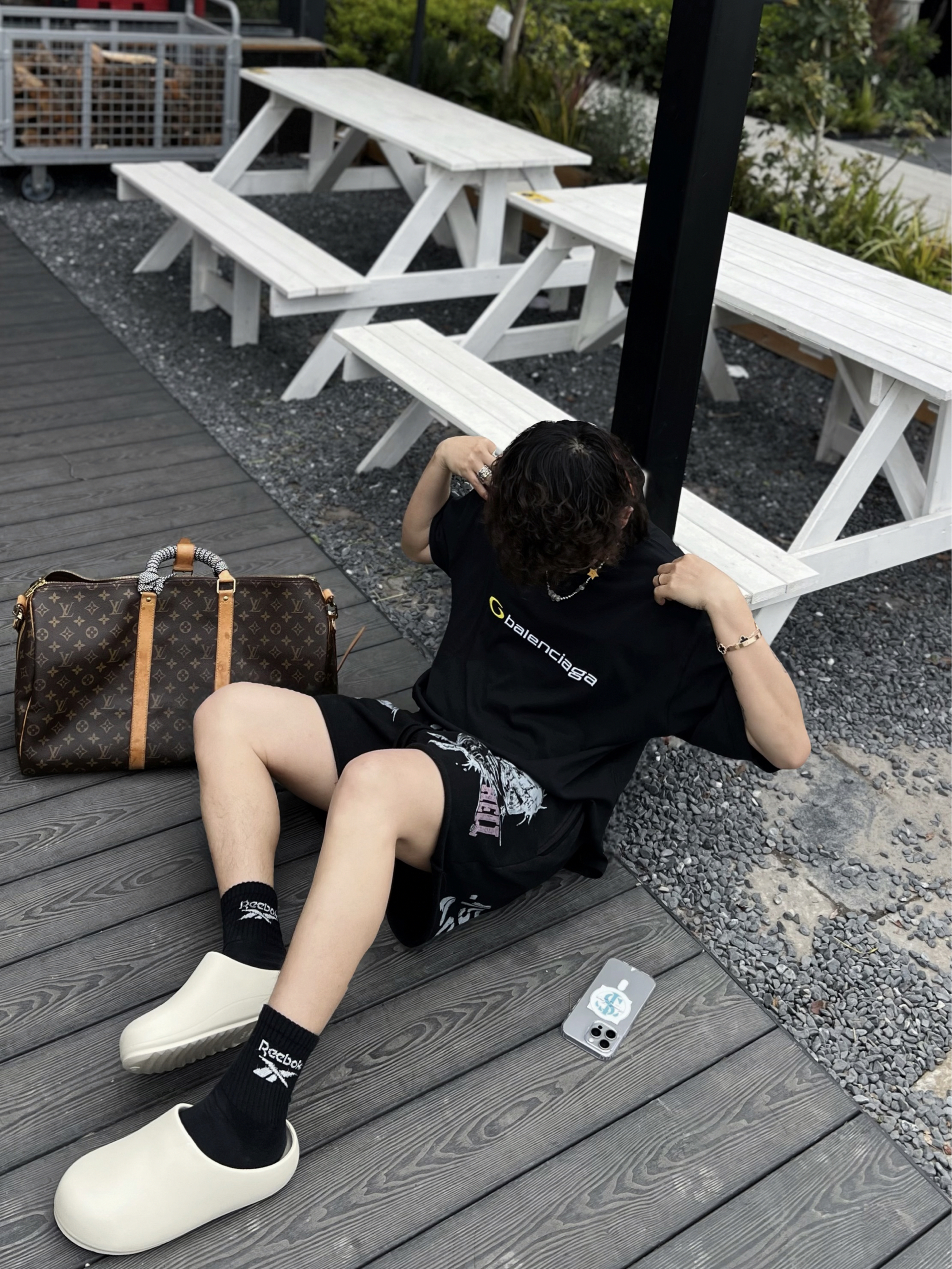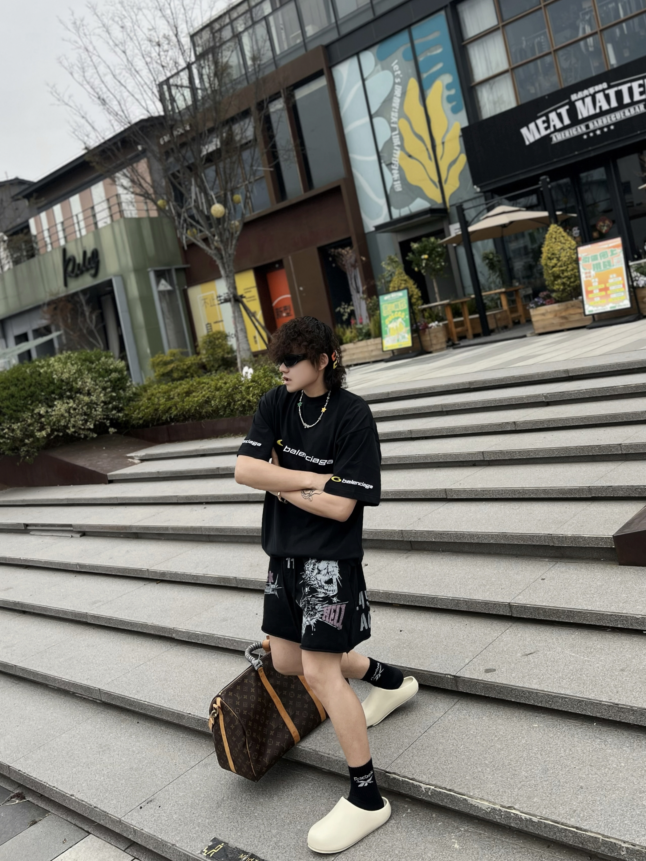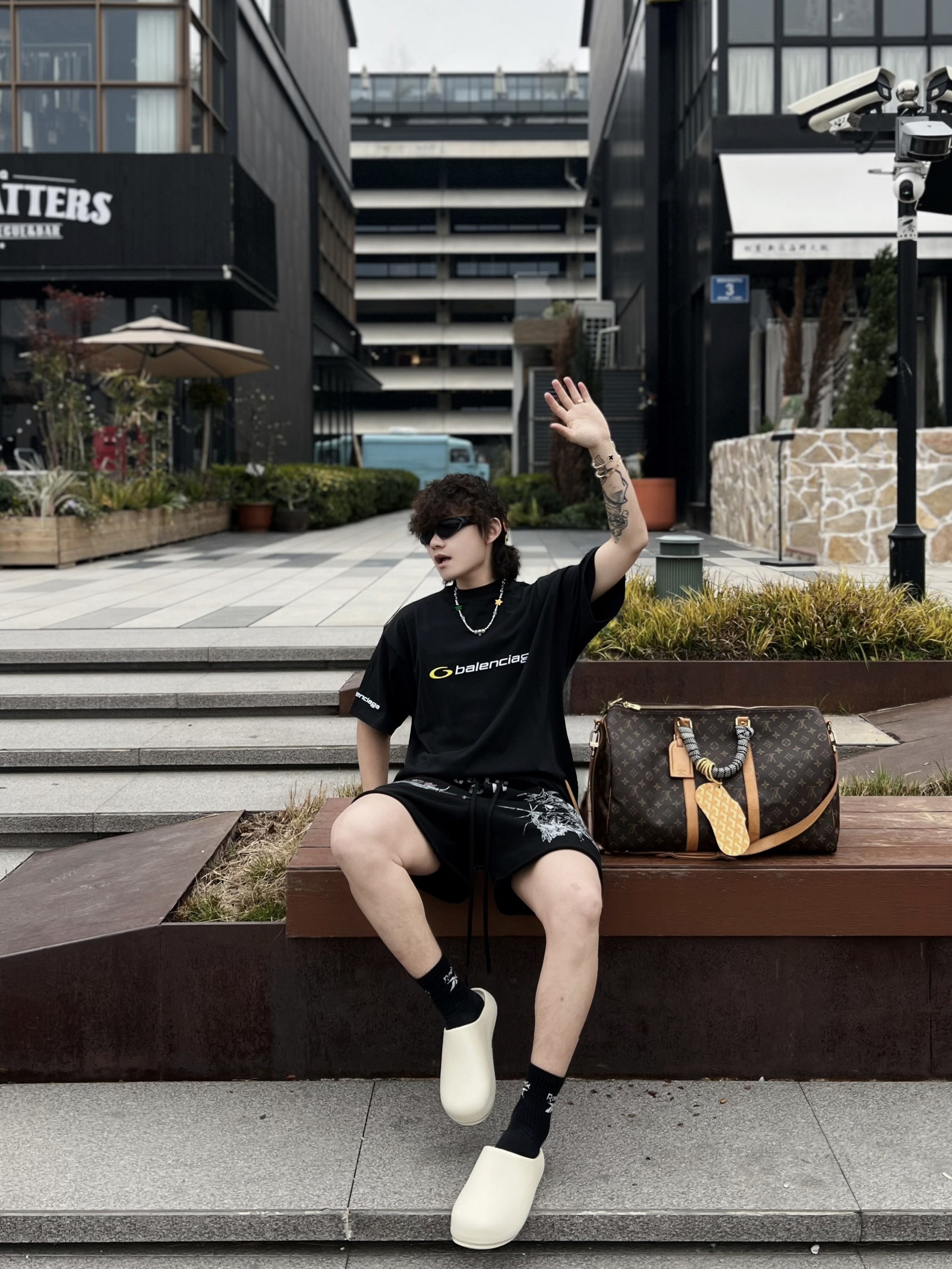 Hi、这里是有点懒的薯条🍟~ ☑️早春风还没暖透? 这套All Black穿搭直接把氛围感焊在身上! 🔘oversize黑T+骷髅印花短裤,随性又带点叛逆感,踩上半拖配黑袜,慵懒中藏着潮人小心机✨ LV旅行袋一拎,美式街头那味儿瞬间到位,出片率100%📸 👔 Balenciaga