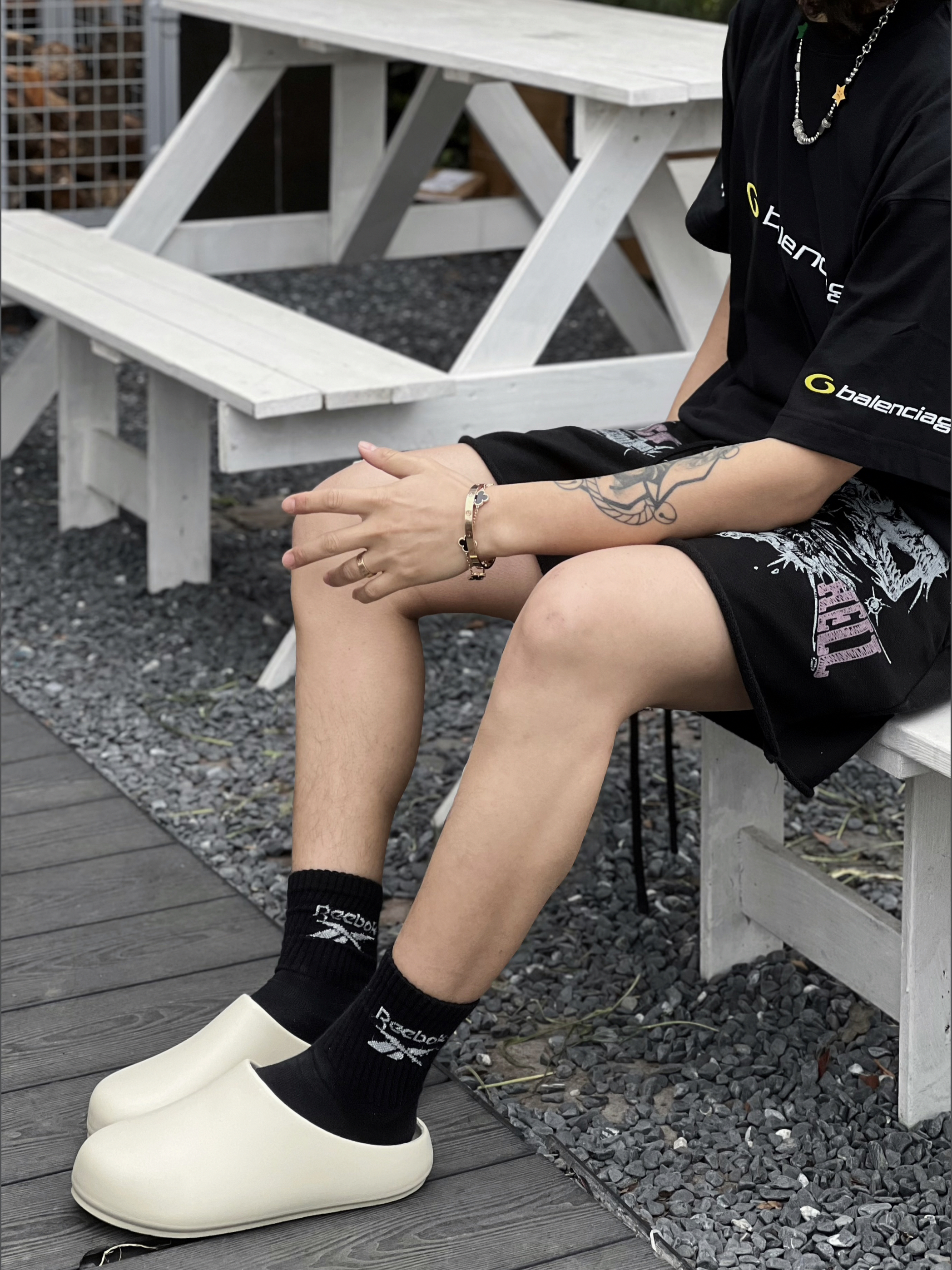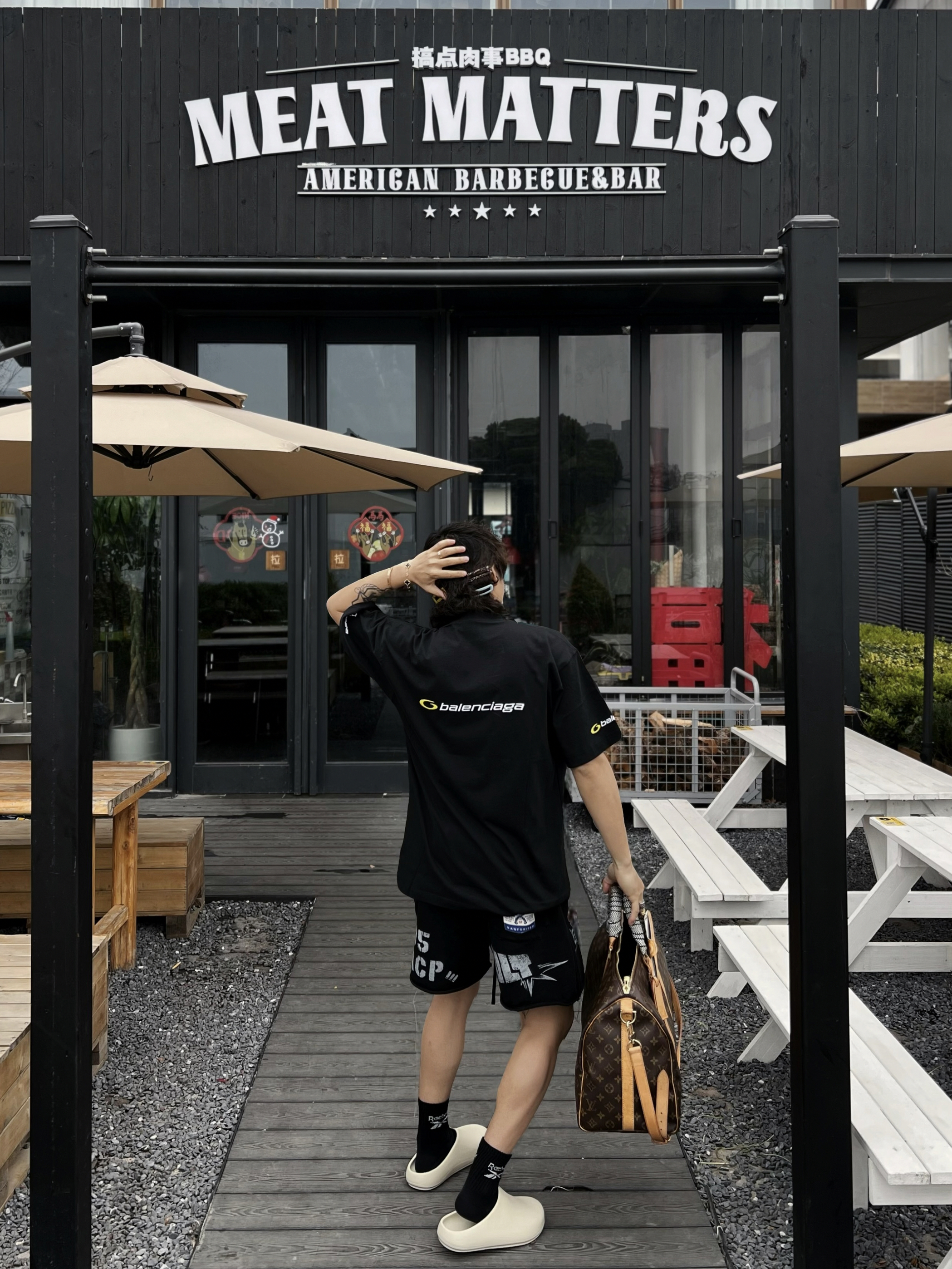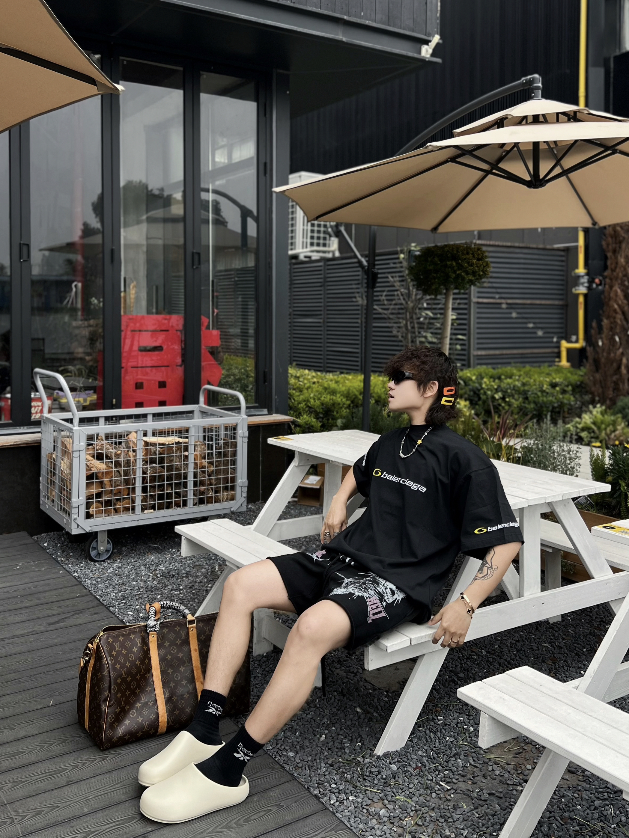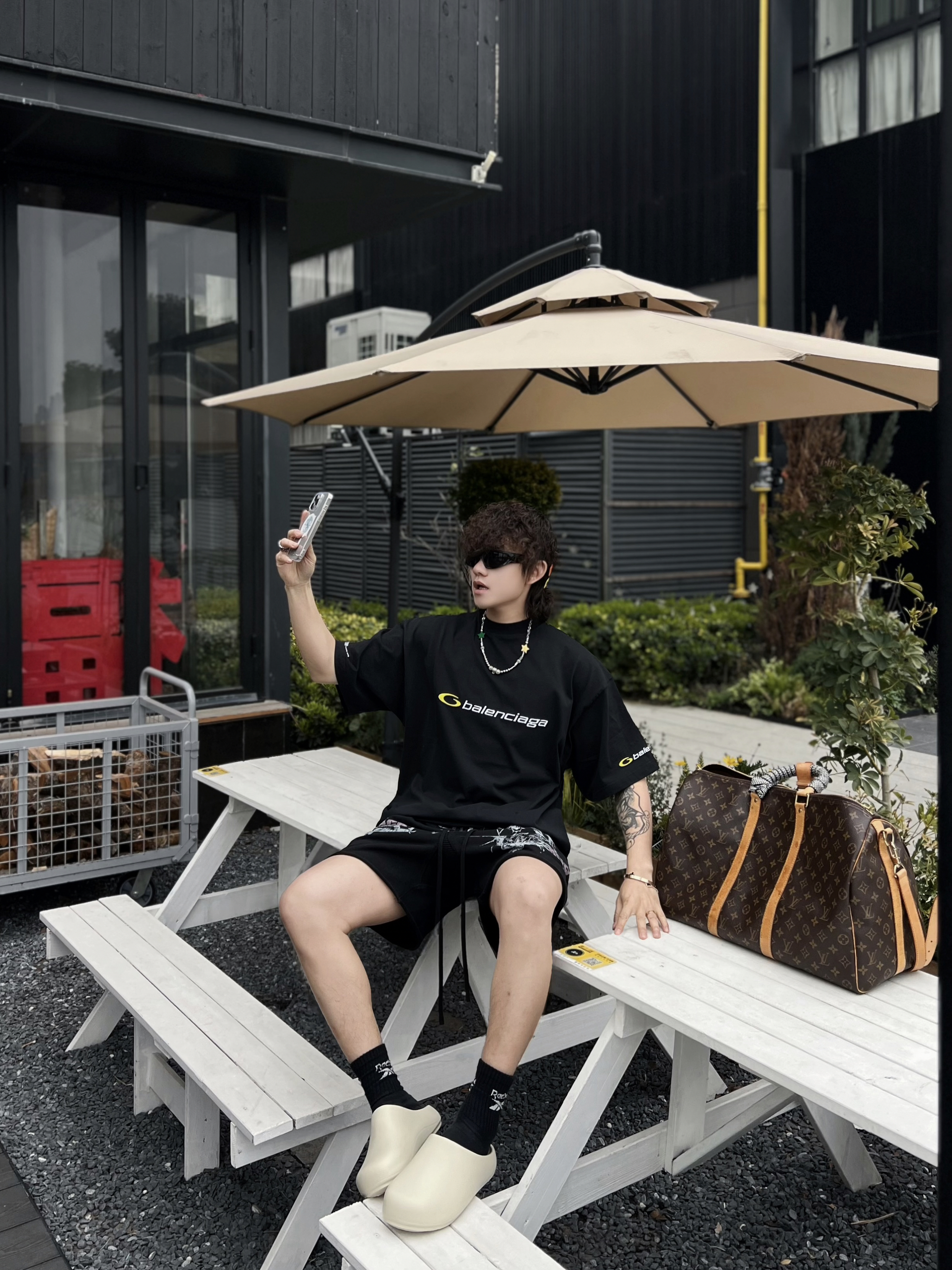 Hi、这里是有点懒的薯条🍟~ ☑️早春风还没暖透? 这套All Black穿搭直接把氛围感焊在身上! 🔘oversize黑T+骷髅印花短裤,随性又带点叛逆感,踩上半拖配黑袜,慵懒中藏着潮人小心机✨ LV旅行袋一拎,美式街头那味儿瞬间到位,出片率100%📸 👔 Balenciaga