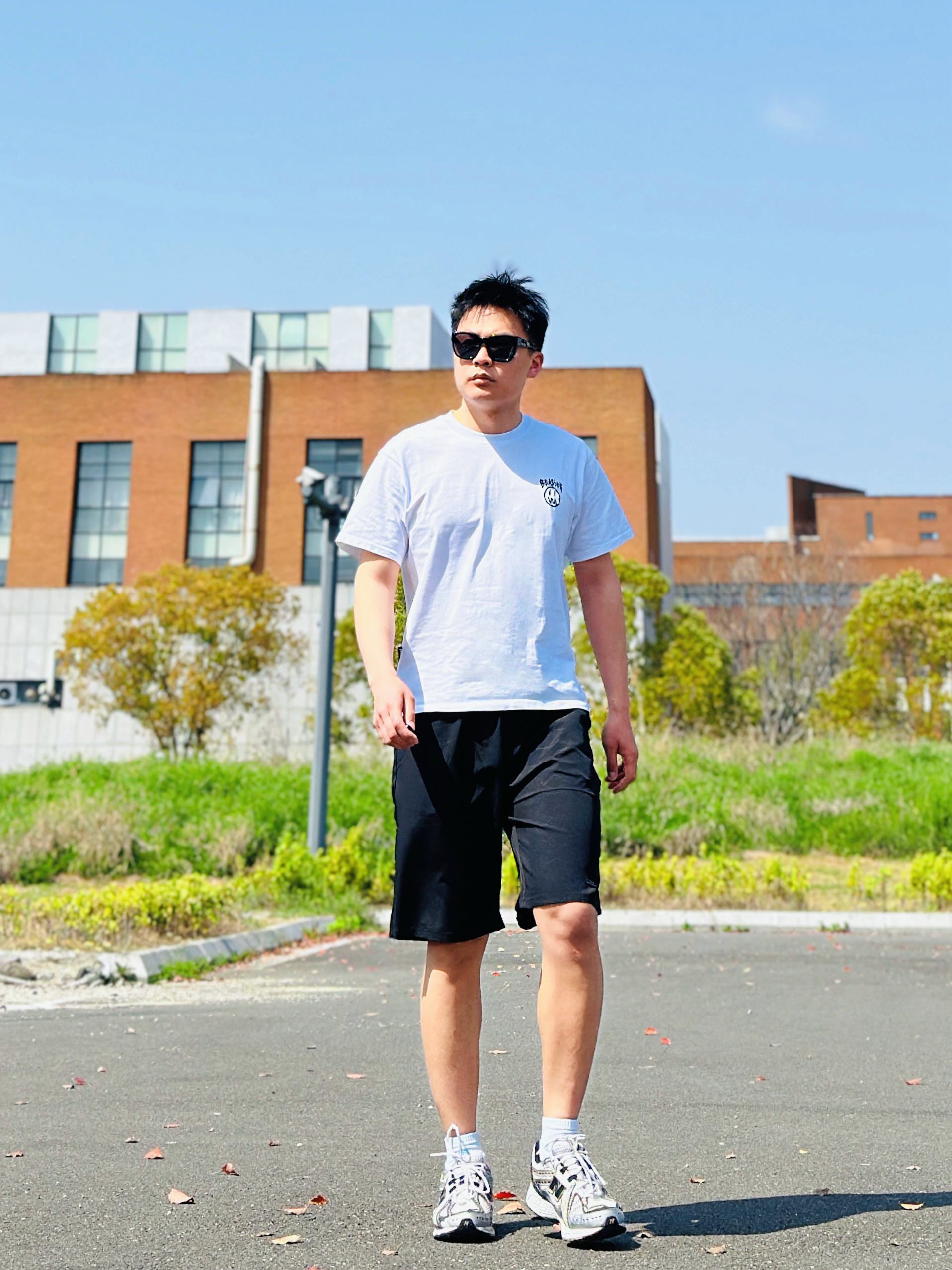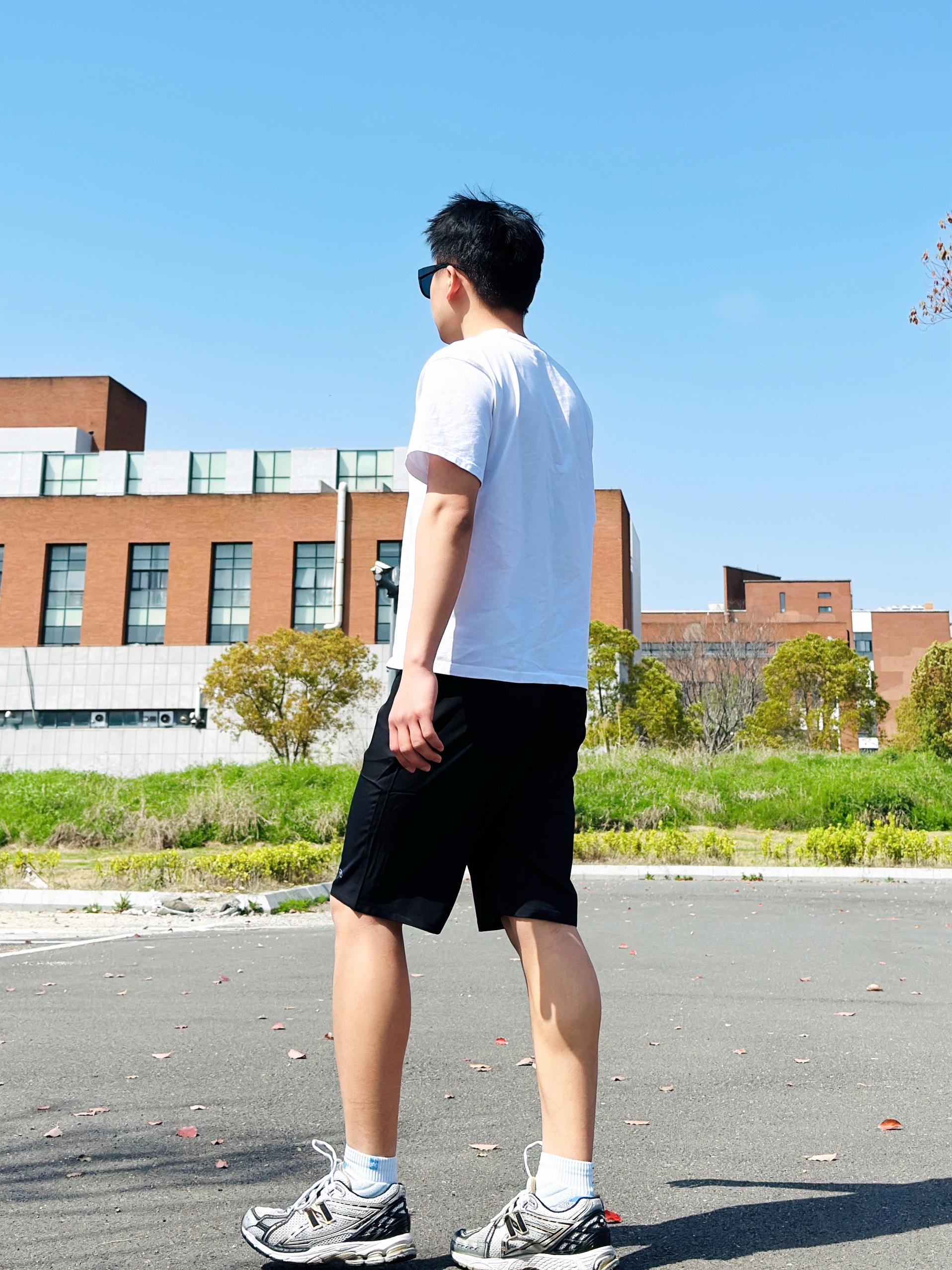 这条黑色运动短裤真的太省心了,利落的五分长度刚好盖过膝盖,轻薄透气的面料带着低调暗纹,侧边分割剪裁让裤型更利落,走路不卡腿,后腰的小标也让整体不单调。 料子滑溜溜的,夏天穿完全不闷汗,垂感也在线,不会贴在腿上显尴尬,松紧腰设计对各种腰围都友好,久坐也不勒肚子,日常通勤、运动遛弯都能穿,舒服到不想脱。 搭配也不用费脑,像图里这样配白T+白袜+拖鞋,清爽又随性;换件短袖POLO搭板鞋,立马变干净少...