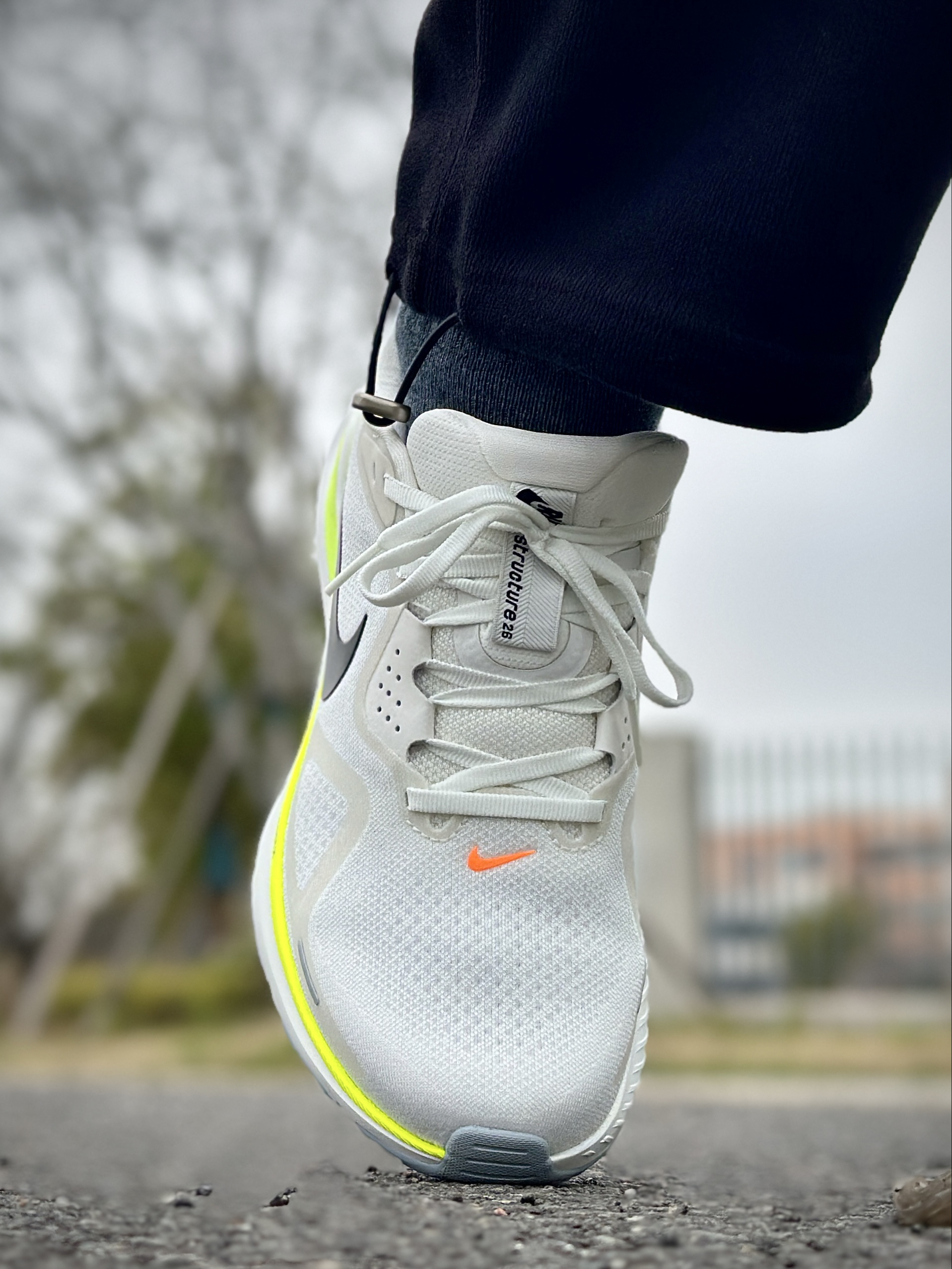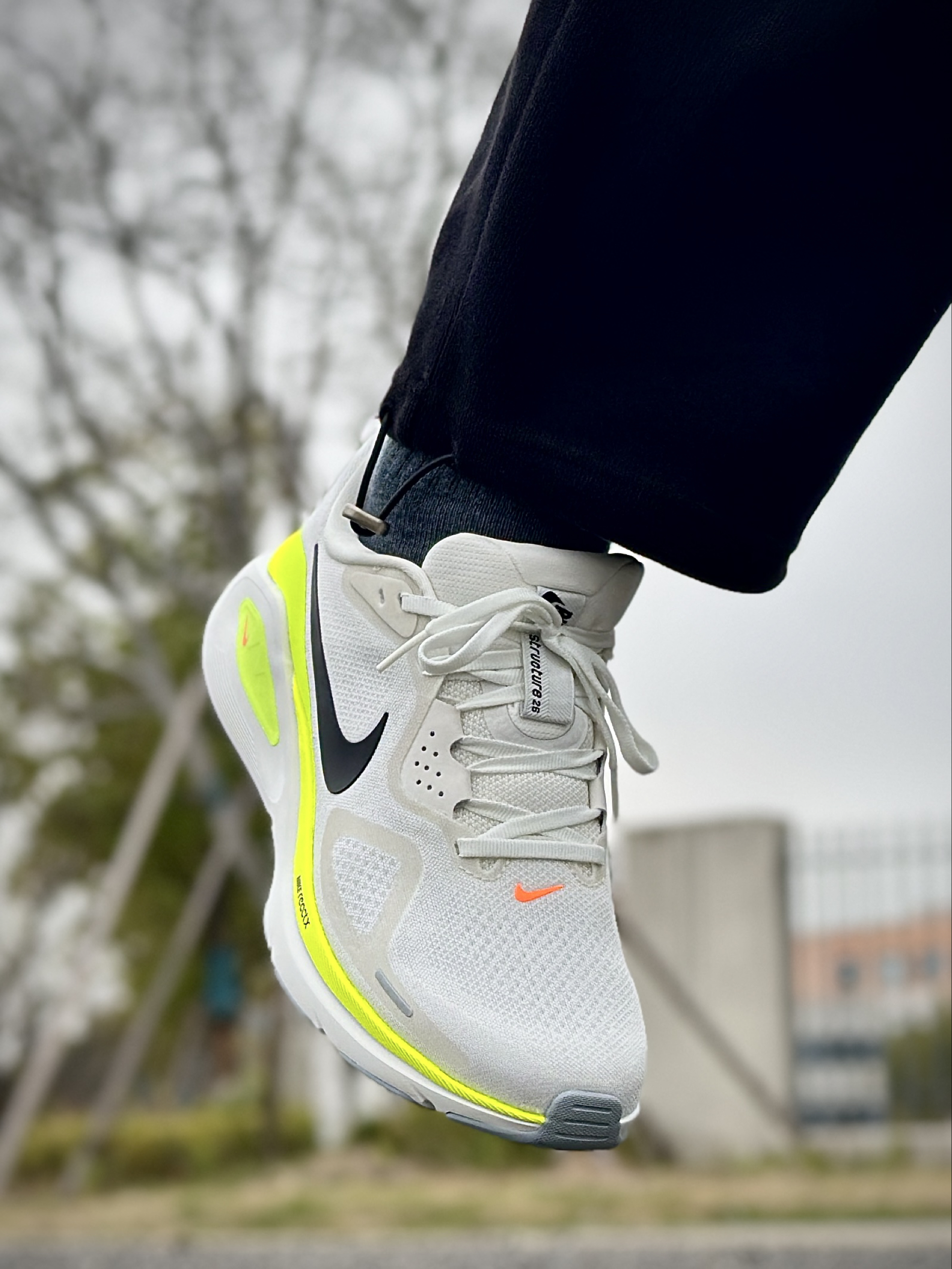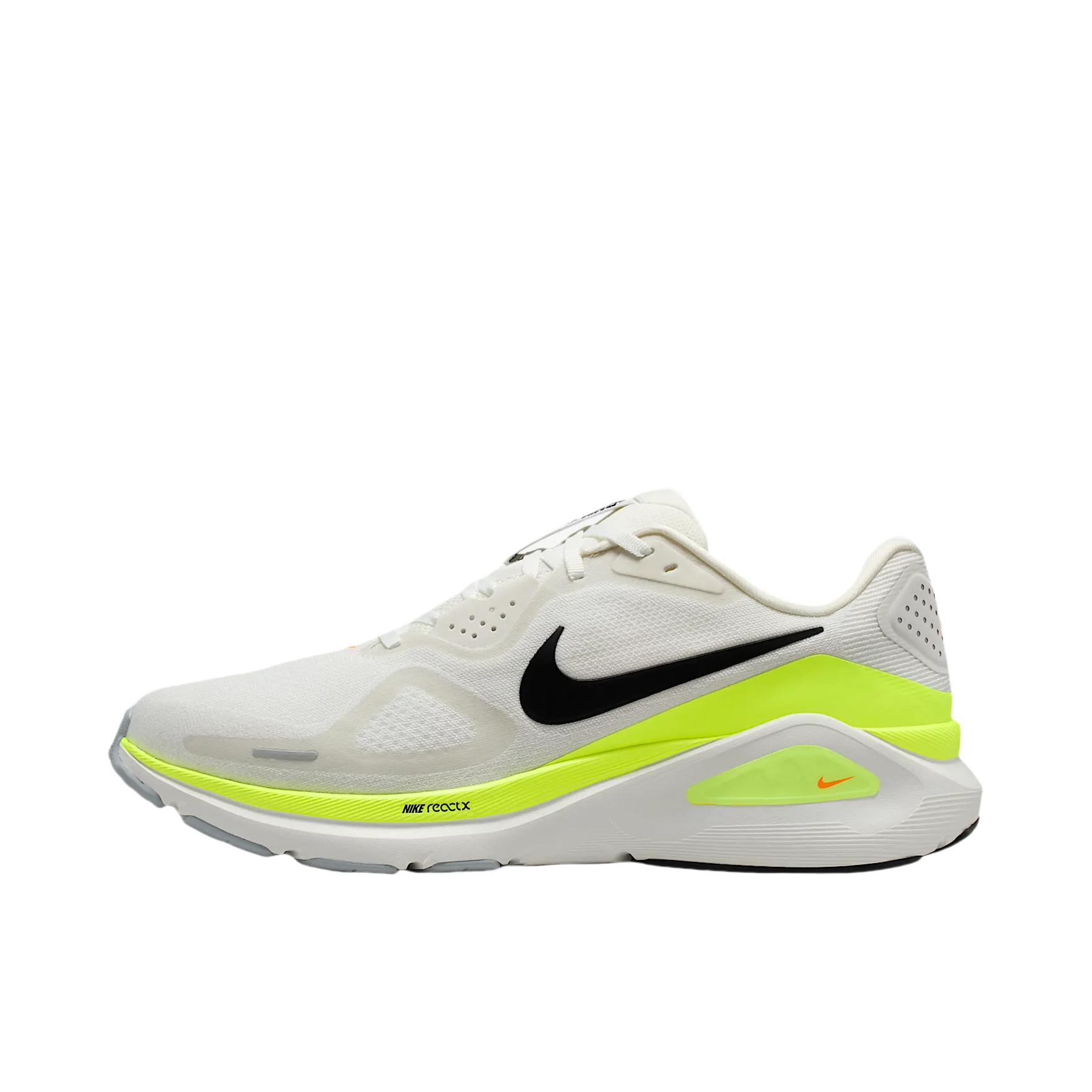 这双Nike Structure 26跑鞋,米白鞋面配荧光黄线条,再加上经典黑勾,配色干净又有活力,不管是搭运动装还是休闲裤都很和谐,属于大多数人看了都会觉得舒服耐看的类型。 上脚脚感很实在,全掌ReactX泡棉软弹刚好,不会踩棉花也不会硬邦邦,足弓处的支撑很明显,长时间走路或慢跑都挺稳的。工程网眼鞋面透气不闷脚,后跟包裹扎实,跑起来脚不会晃,日常通勤和轻量运动都能hold住,是一双颜值和实用性...