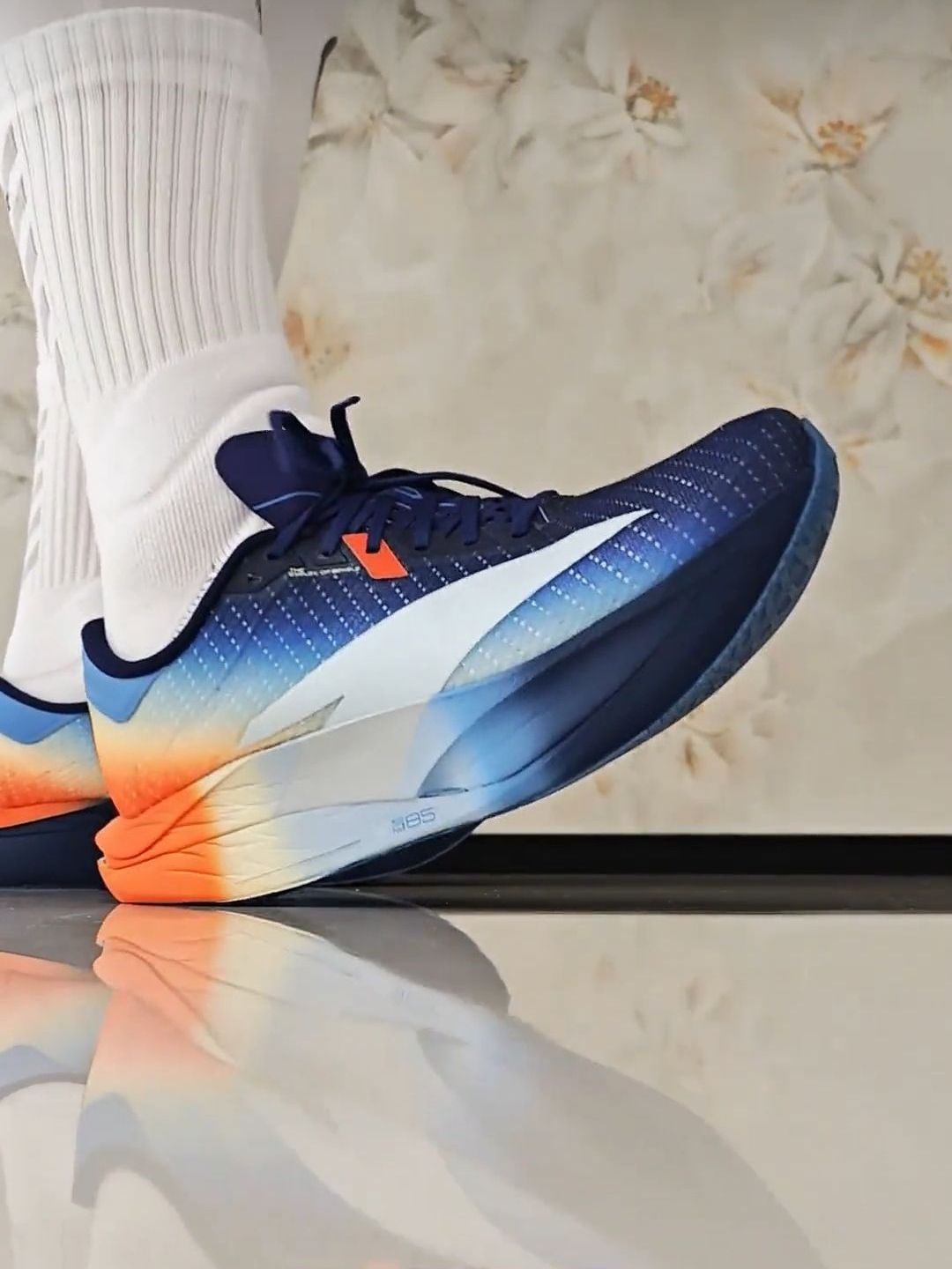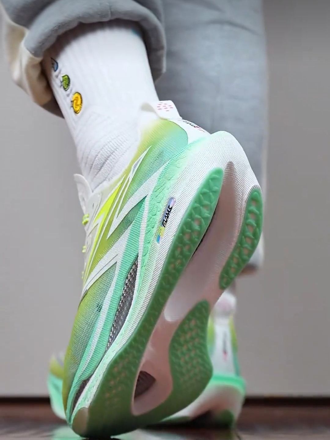 这双飞燃4.5一句话总结就是,缓震推进双在线,全马 4分内适配,四张多入手性价比能打,但挑脚力、略 压足弓,小体重慎入。 首先他的优点是缓震抗衰能打!加厚中底韧弹适中, 立体曲面碳板在四分配速时,推进、滚动感丝滑,加 上侧面足弓上翻设计稳得很。 缺点呢是鞋楦偏窄,高足弓穿久了有点压,透气不闷脚;不对称鞋带+后跟填充优化,全速跑也不掉跟,不过对于通勤来说不友好!厚中底日常穿略显笨重。