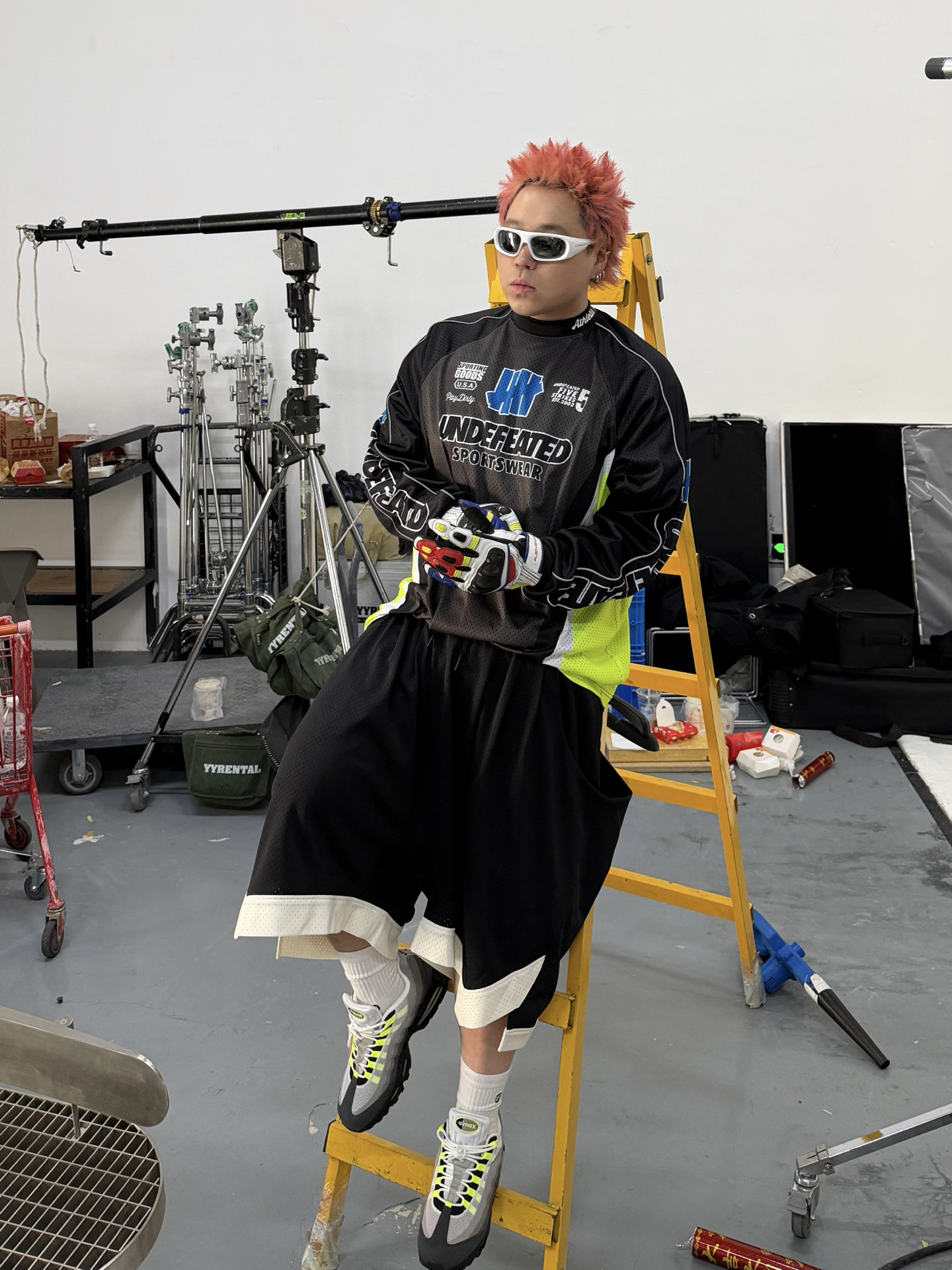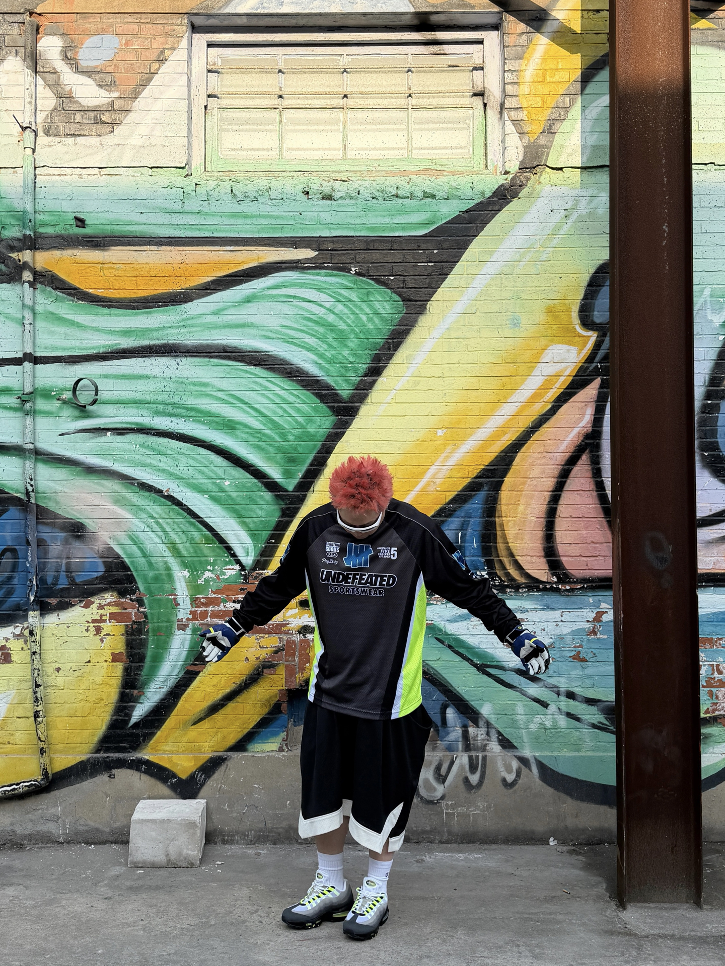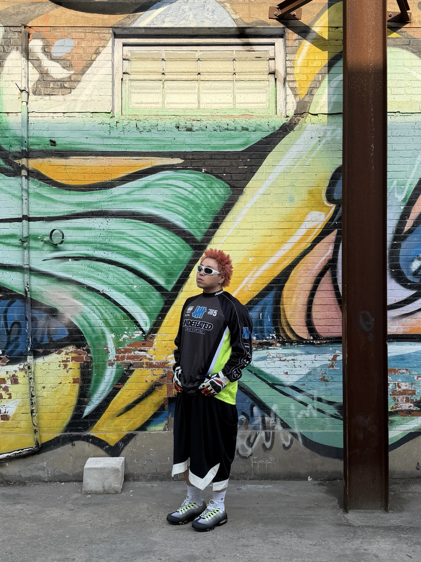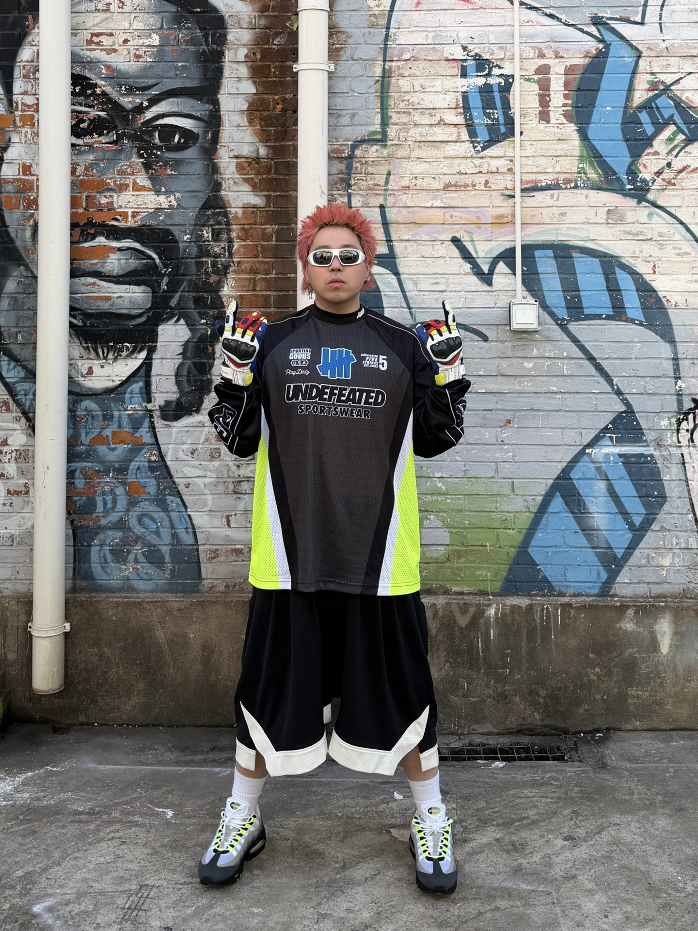 很好奇在当今的时代,如何才能把这件酷似长袖球衣的undefeated运动服穿的恰到好处(当然请无视我糟糕的建模) 荧光绿配上一抹蓝,像极了雪碧配色的球鞋。我第一反应其实是寻找一双雪碧色的篮球鞋 但领口橡皮筋收缩处有着一排字让我觉得这件衣服又充满赛车元素,也许薄底鞋也可以是很好的答案。 穿搭功力平平的我最终选择了色彩呼应的运动鞋,以及一副机车手套。希望可以通过学习给这件undefeated更好的搭配...