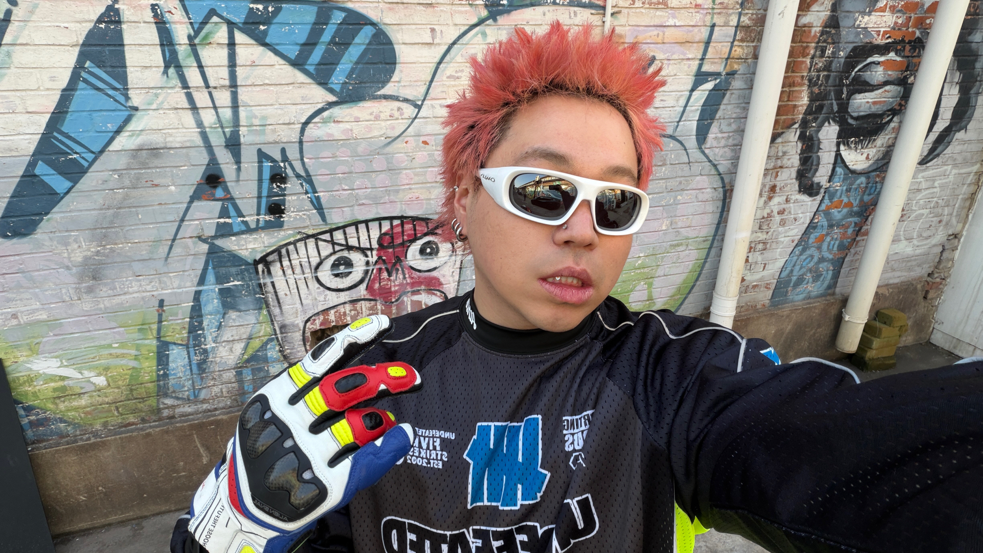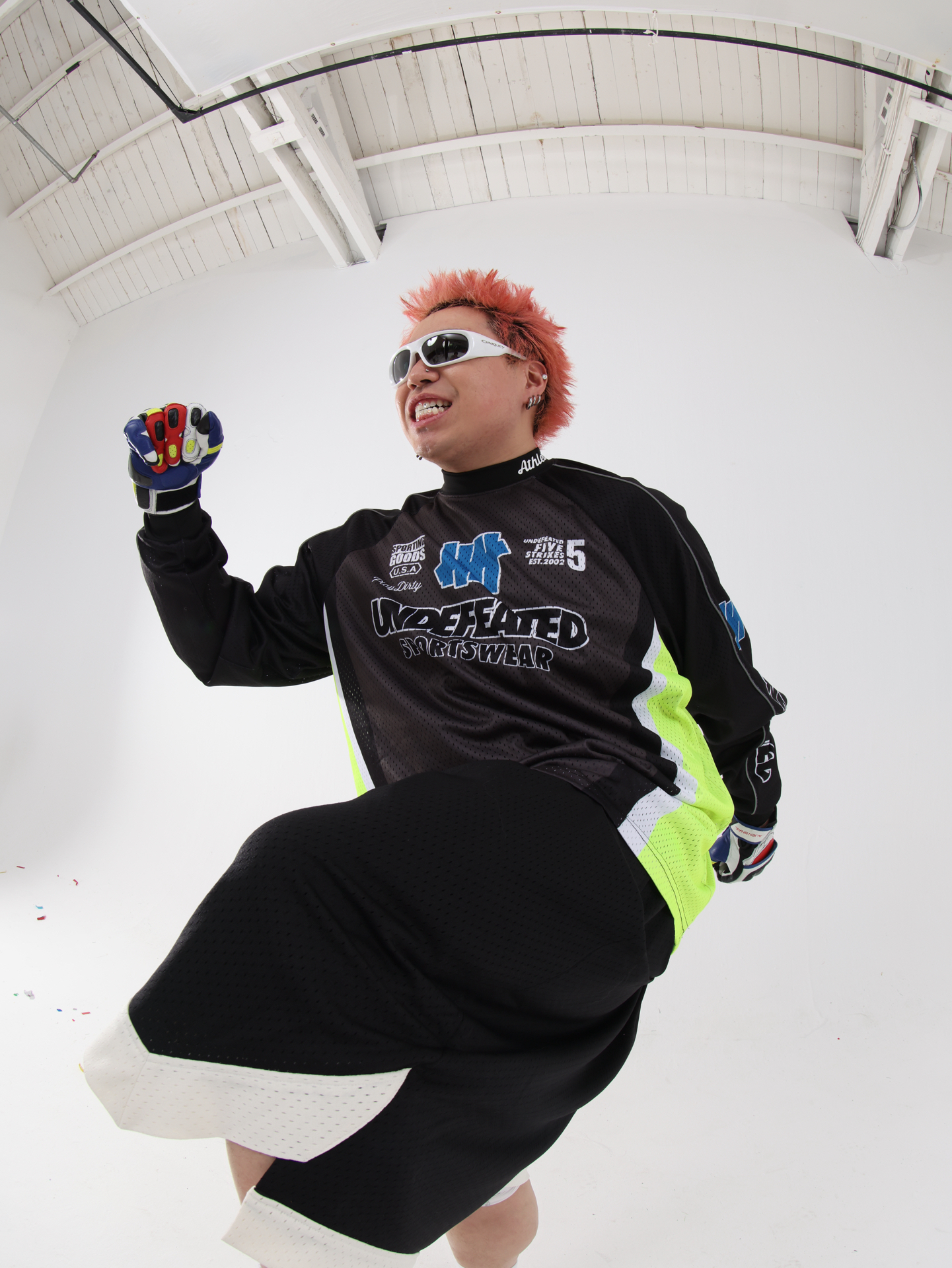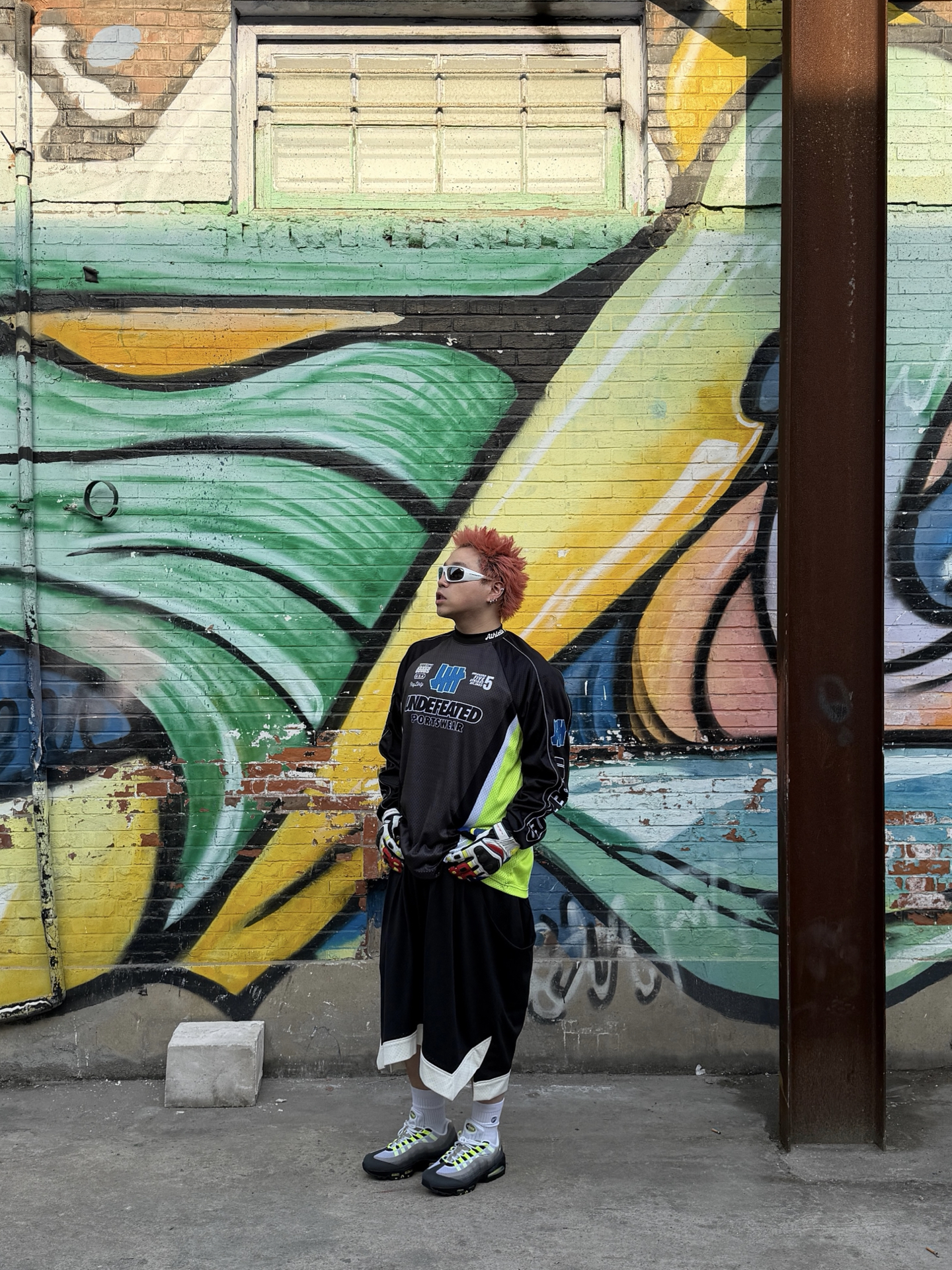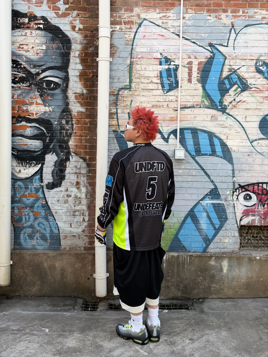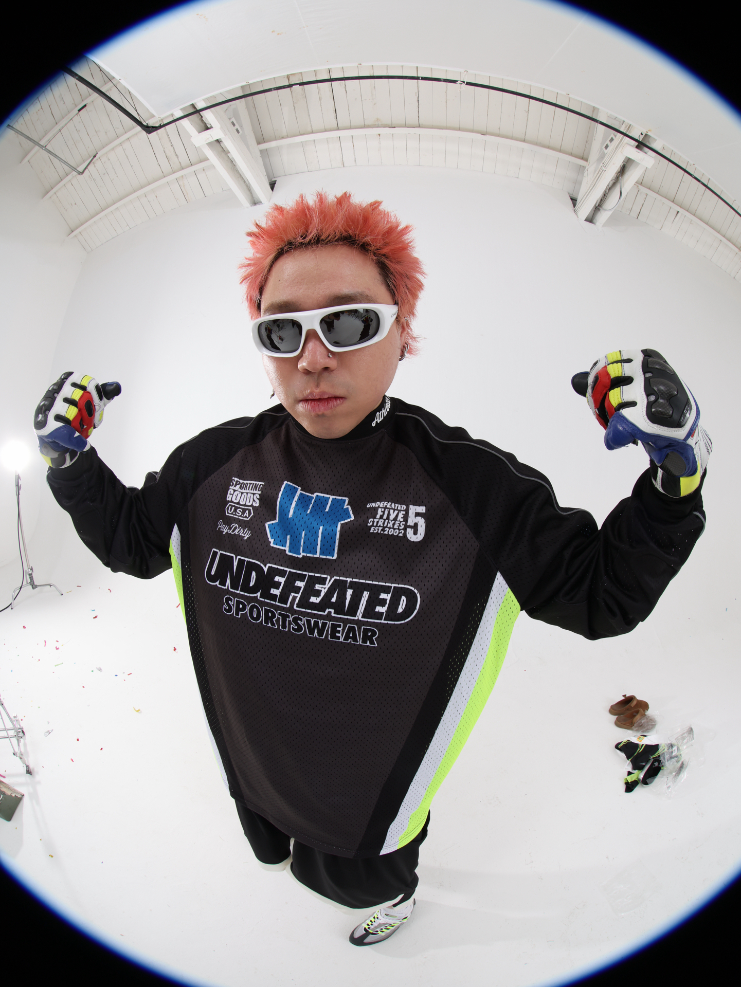 很好奇在当今的时代,如何才能把这件酷似长袖球衣的undefeated运动服穿的恰到好处(当然请无视我糟糕的建模) 荧光绿配上一抹蓝,像极了雪碧配色的球鞋。我第一反应其实是寻找一双雪碧色的篮球鞋 但领口橡皮筋收缩处有着一排字让我觉得这件衣服又充满赛车元素,也许薄底鞋也可以是很好的答案。 穿搭功力平平的我最终选择了色彩呼应的运动鞋,以及一副机车手套。希望可以通过学习给这件undefeated更好的搭配...