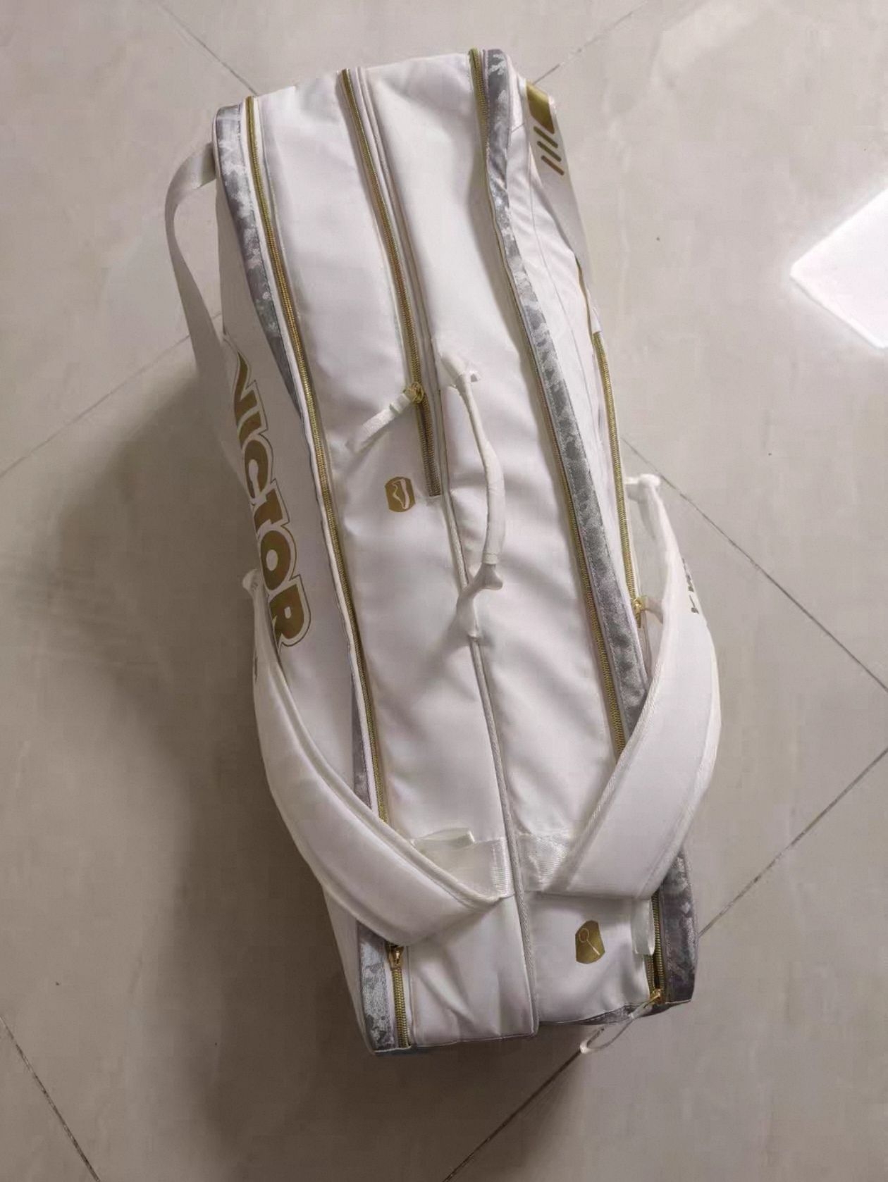 VICTOR威克多羽毛球包 6支装拍包 六支装拍矩包,大容量设计,能装多支球拍、球鞋、装备,分区合理,球拍独立仓,鞋仓也有,收纳方便,背着出门、打球、训练都很实用。 白色主体配蓝色/金色条纹,颜值高,双肩背+提手两用,背带宽厚不勒肩,男女都能用