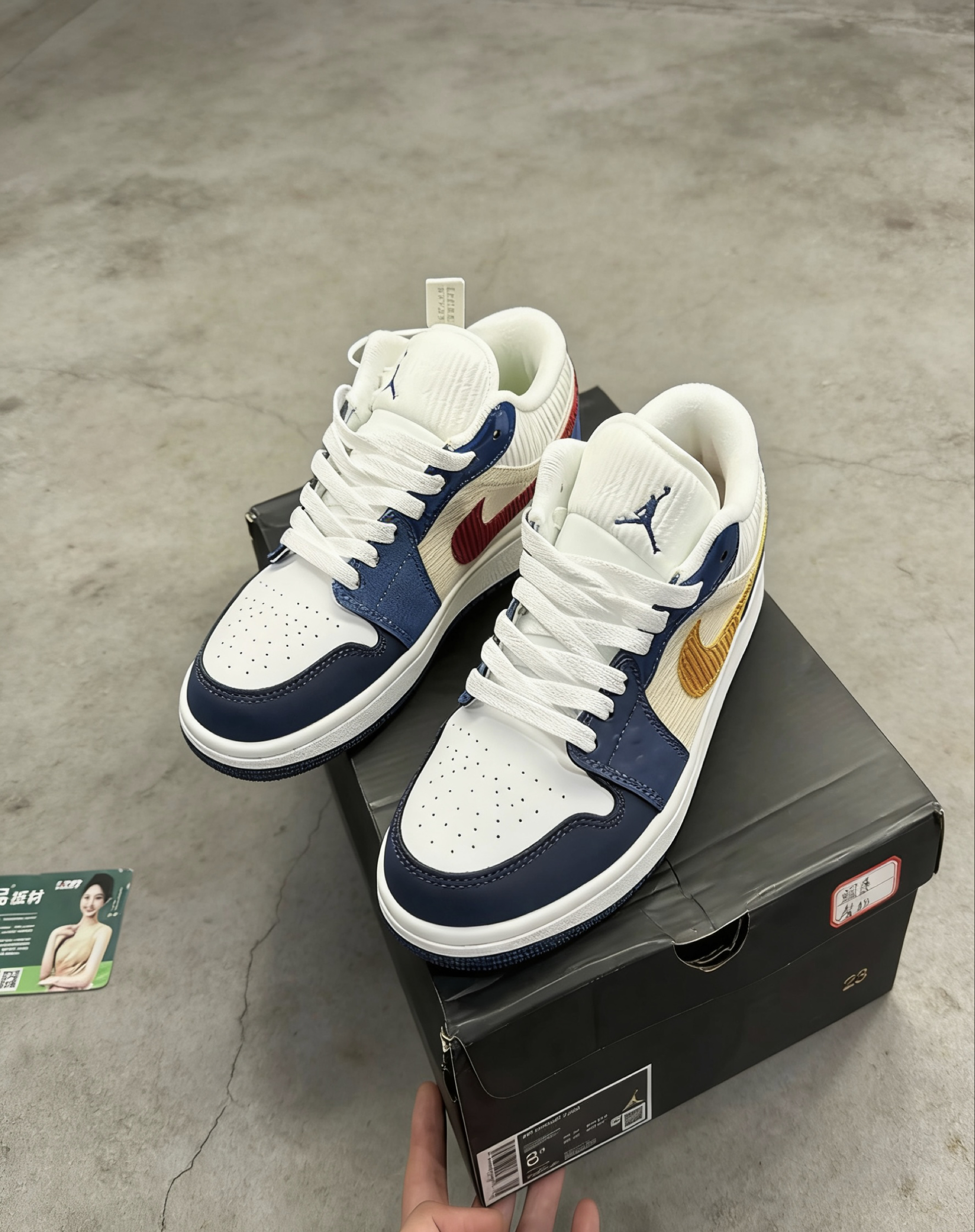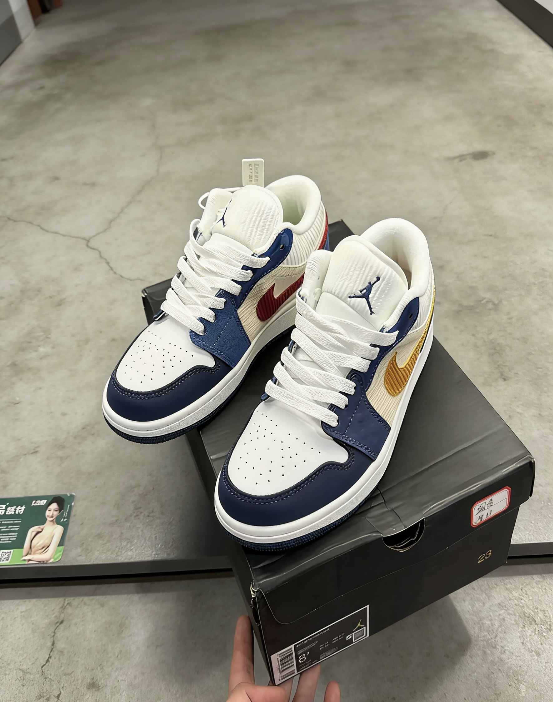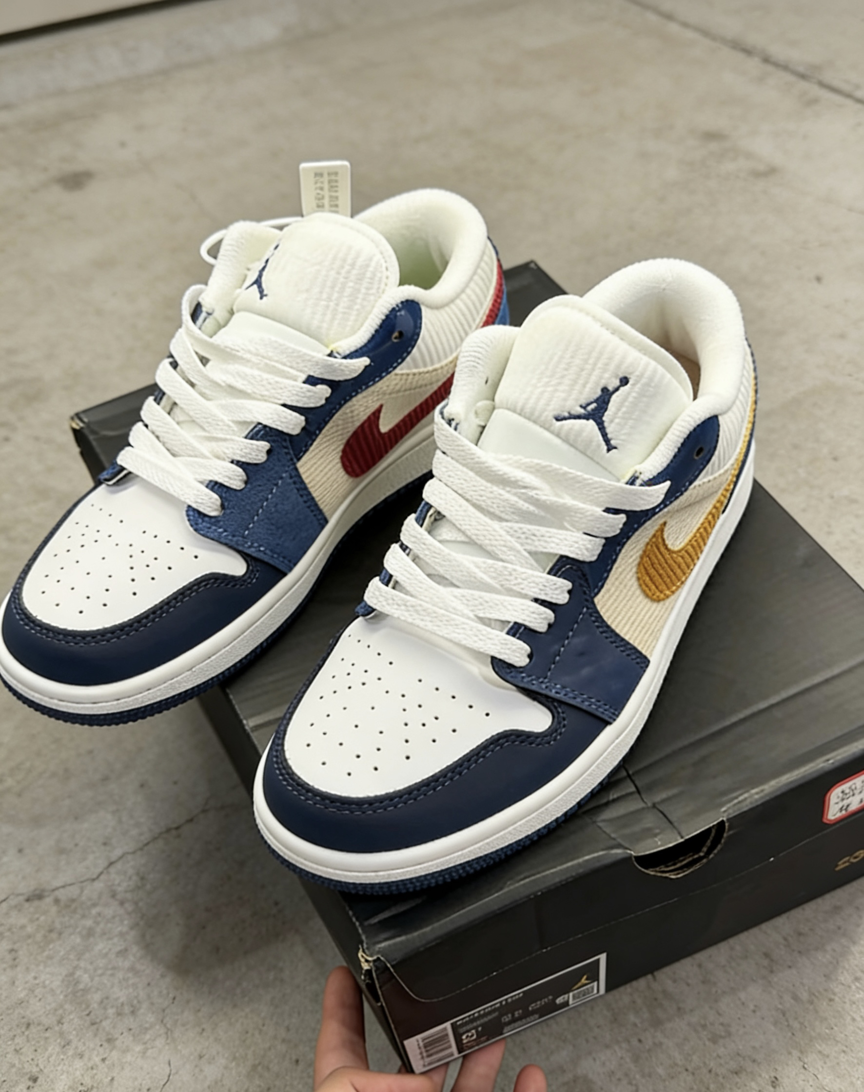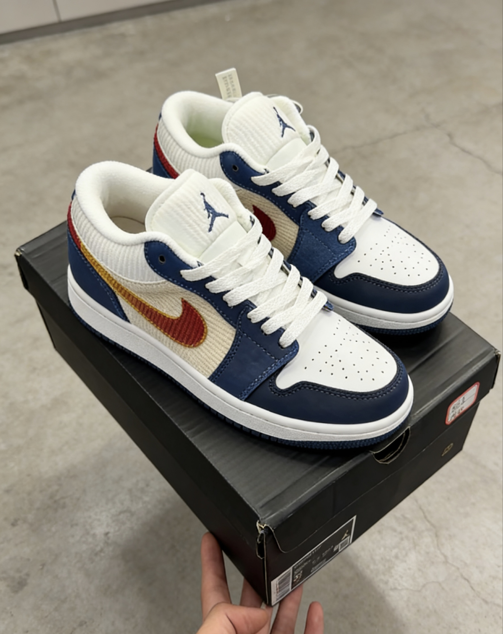 这双灯芯绒拼色AJ1 Low我穿了快三周了👟 脚感比我之前的板鞋软很多,走路久了也不磨后跟👍 蓝白黄撞色很耐看,上课、逛操场都能搭👌 灯芯绒部分有点容易粘毛,每天出门前要掸两下🪶 鞋底防滑还可以,下雨天走瓷砖也没滑过☔ 你们平时穿板鞋最在意脚感还是颜值呀?🙋