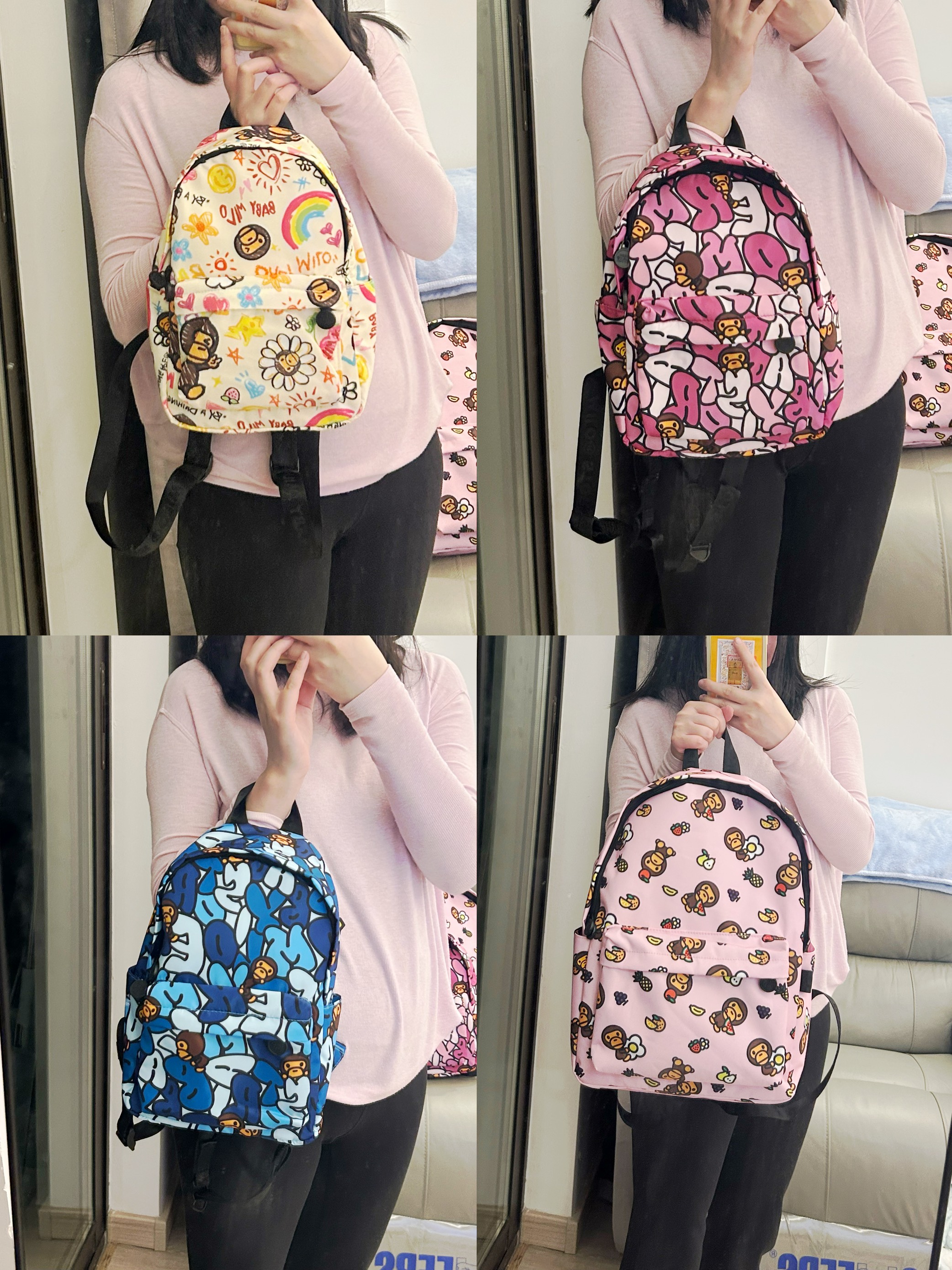 本篇笔记关联了Bape/猿人头 常规卡通小猴图案印花织物多色双肩包 粉色、Bape BABY MILO STORE BY 满印彩色卡通图案织物双肩包 蓝色等商品,为用户提供真实的使用体验和购买参考。