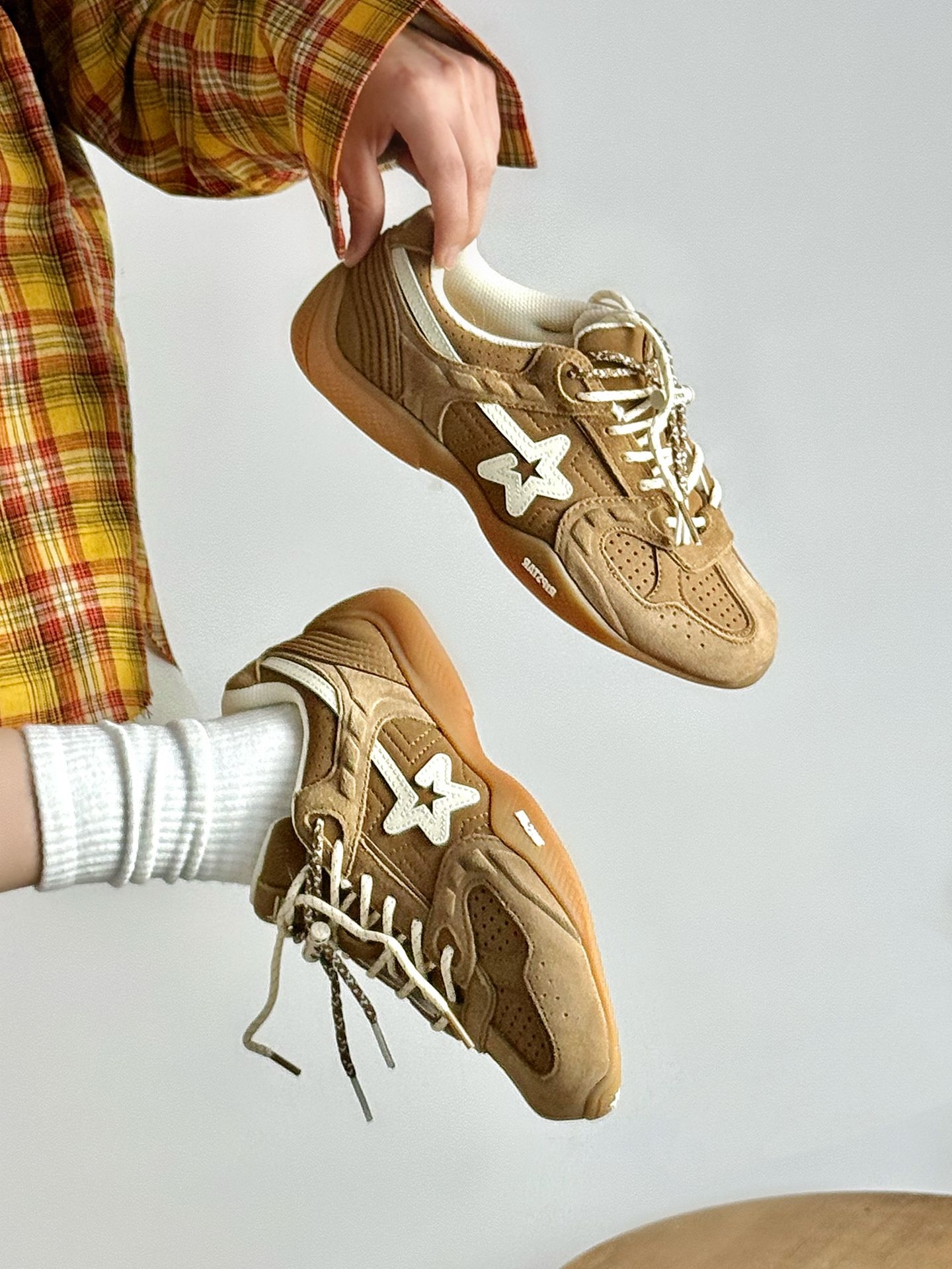 谁能拒绝一双温柔又复古的星星板鞋啊! 暖棕麂皮+白色星星,美拉德氛围直接拉满,上脚显白又显脚小,黄皮姐妹也能放心冲! 麂皮质感在线,细节处的缝线和做旧生胶底,精致感拉满,完全不像百元价位的鞋款! 上脚舒适不闷脚,鞋底软弹,暴走一天都不累,通勤、上学、逛街都能穿,百搭到离谱! 搭配牛仔裤、百褶裙、卫衣都超好看,随便一套都很出片,秋冬出门随便一套都氛围感拉满,真的闭眼入!