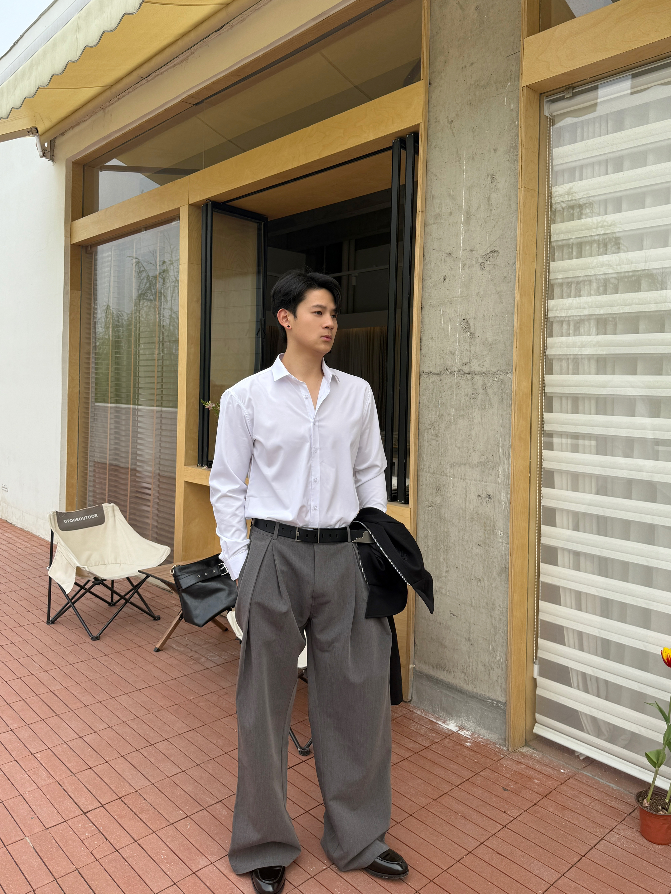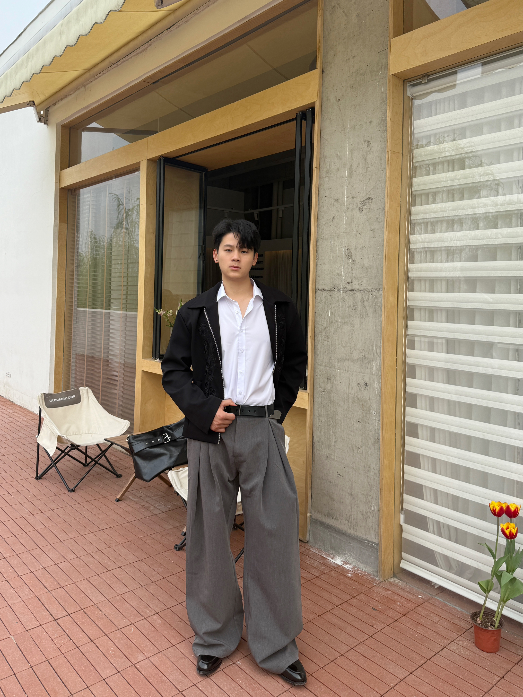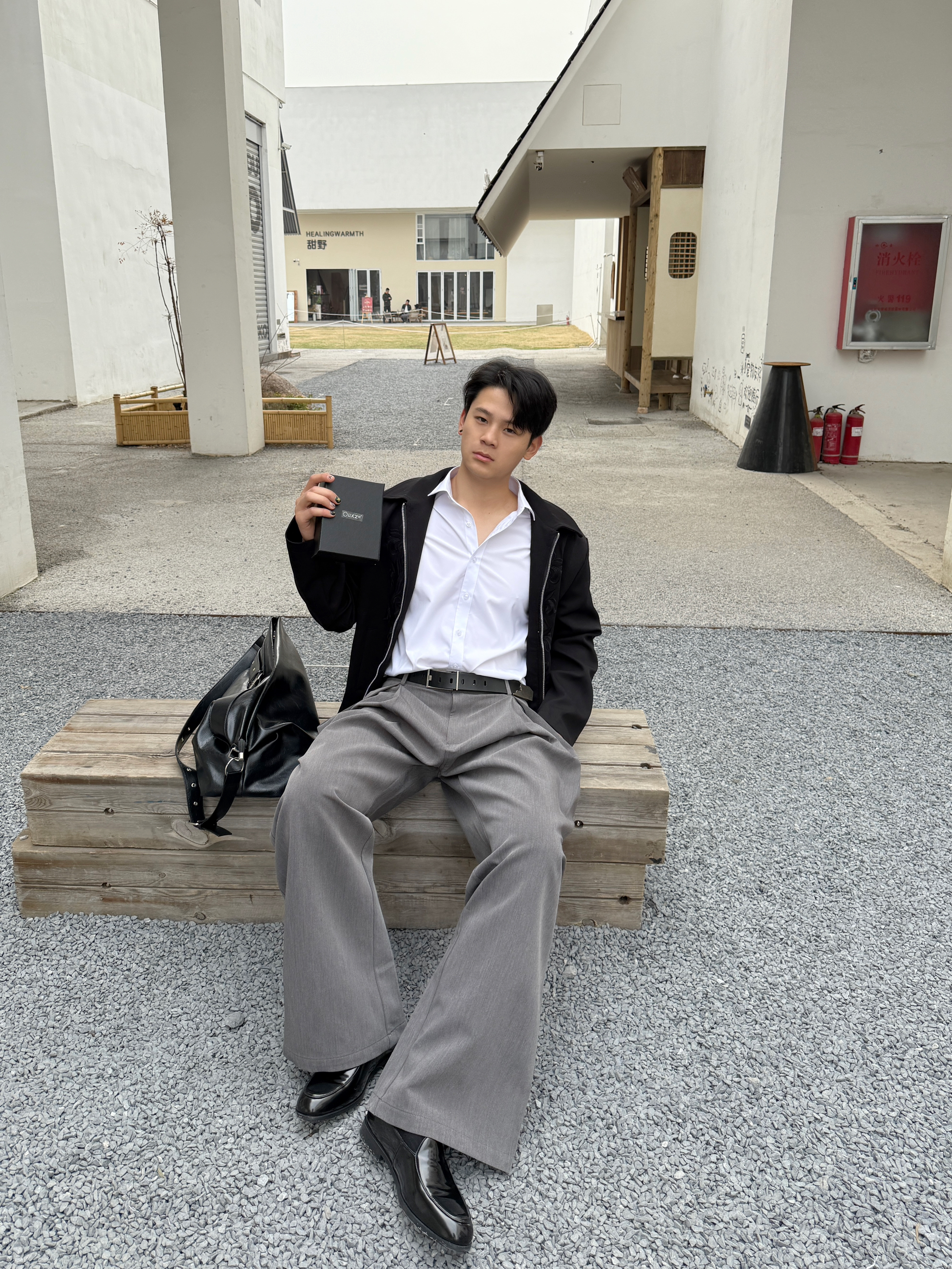 果然是配饰选的好穿搭没烦恼 上衣我选择一件黑色休闲偏西装类型外套 白色衬衫作为内搭 裤子我选择一件灰色直筒西裤 直筒的版型穿起来显高修饰腿型 腰带我选择一条原创设计皮带 鞋子我选择尖头皮鞋这样潮流感十足~