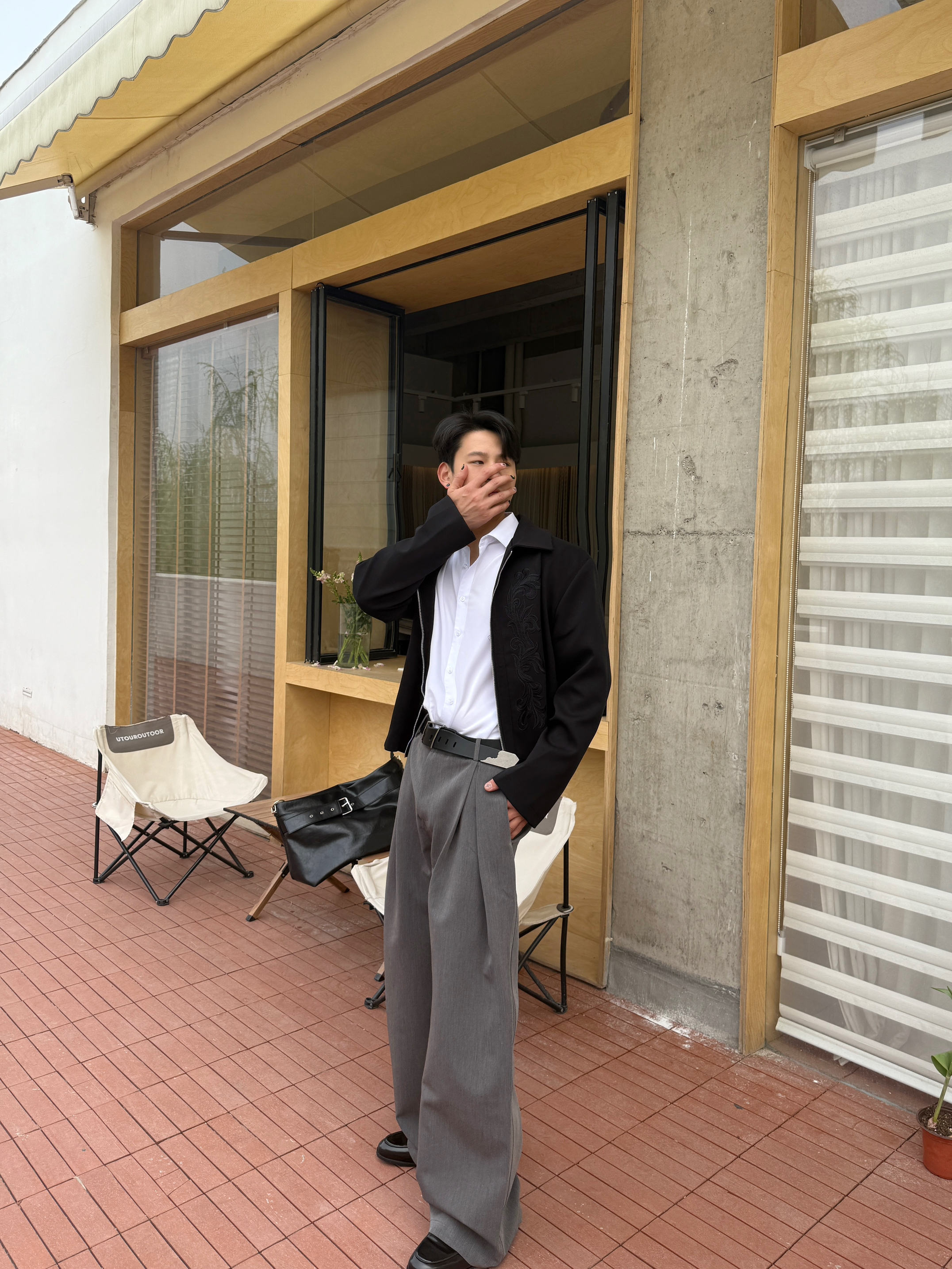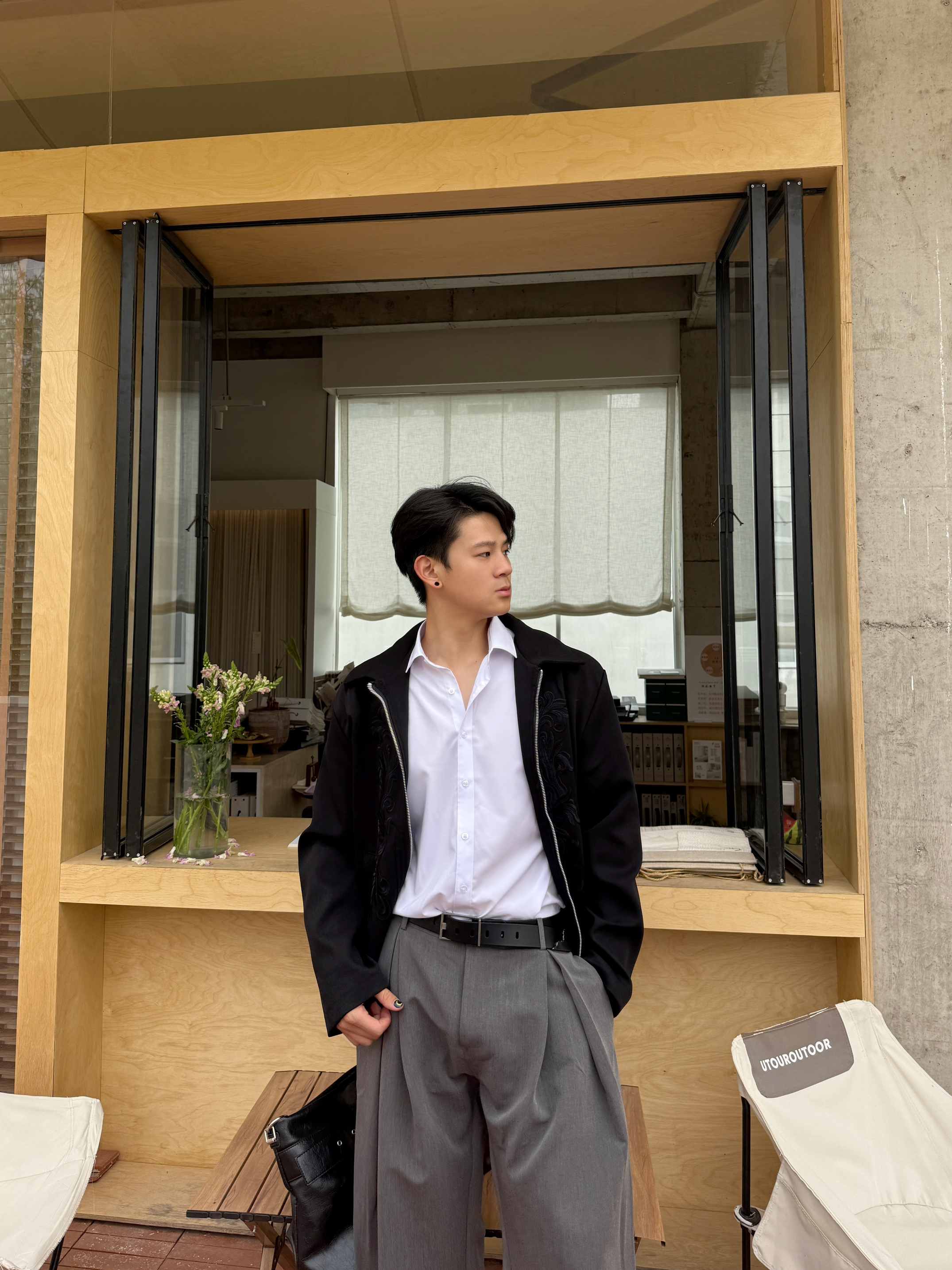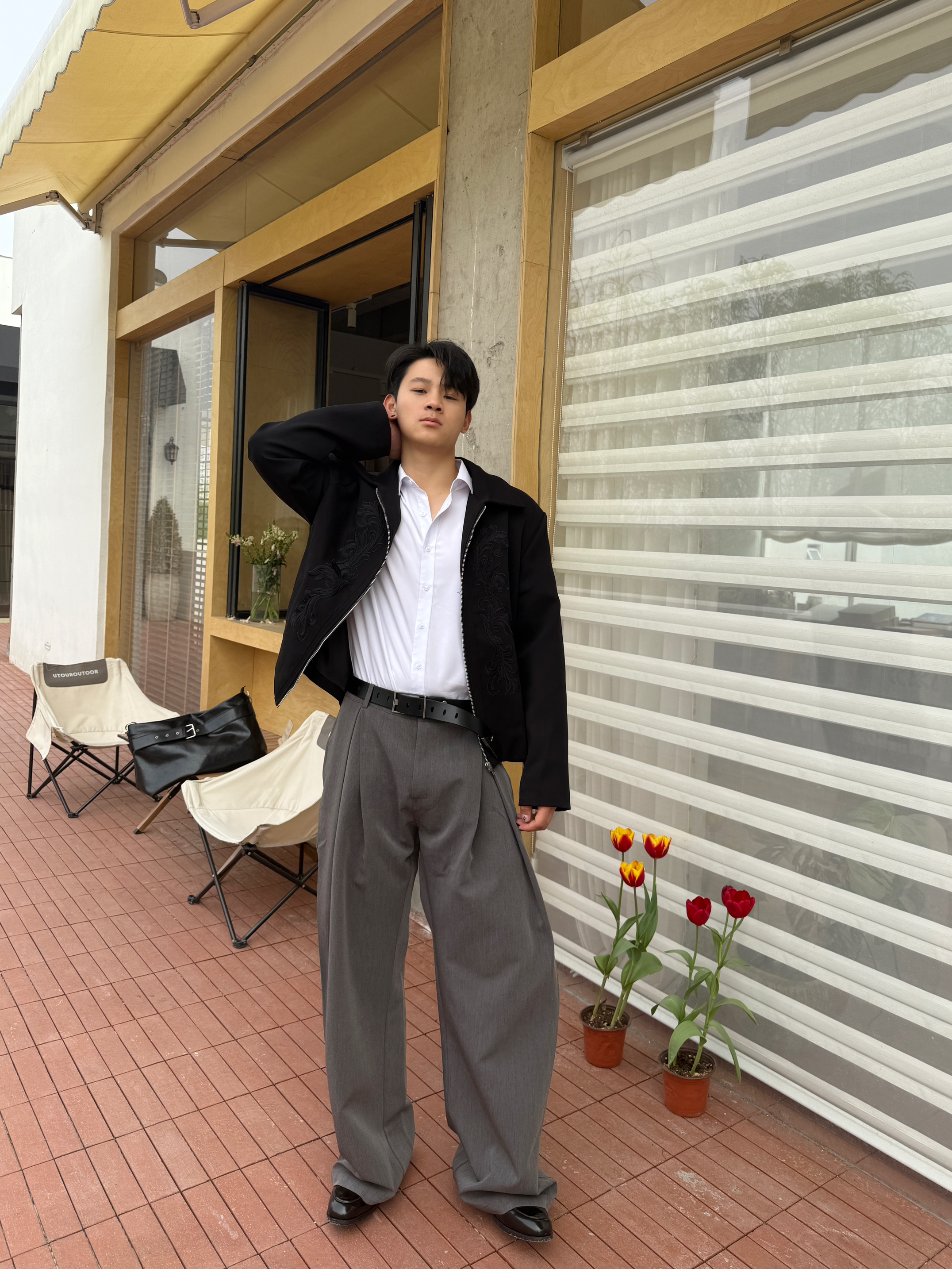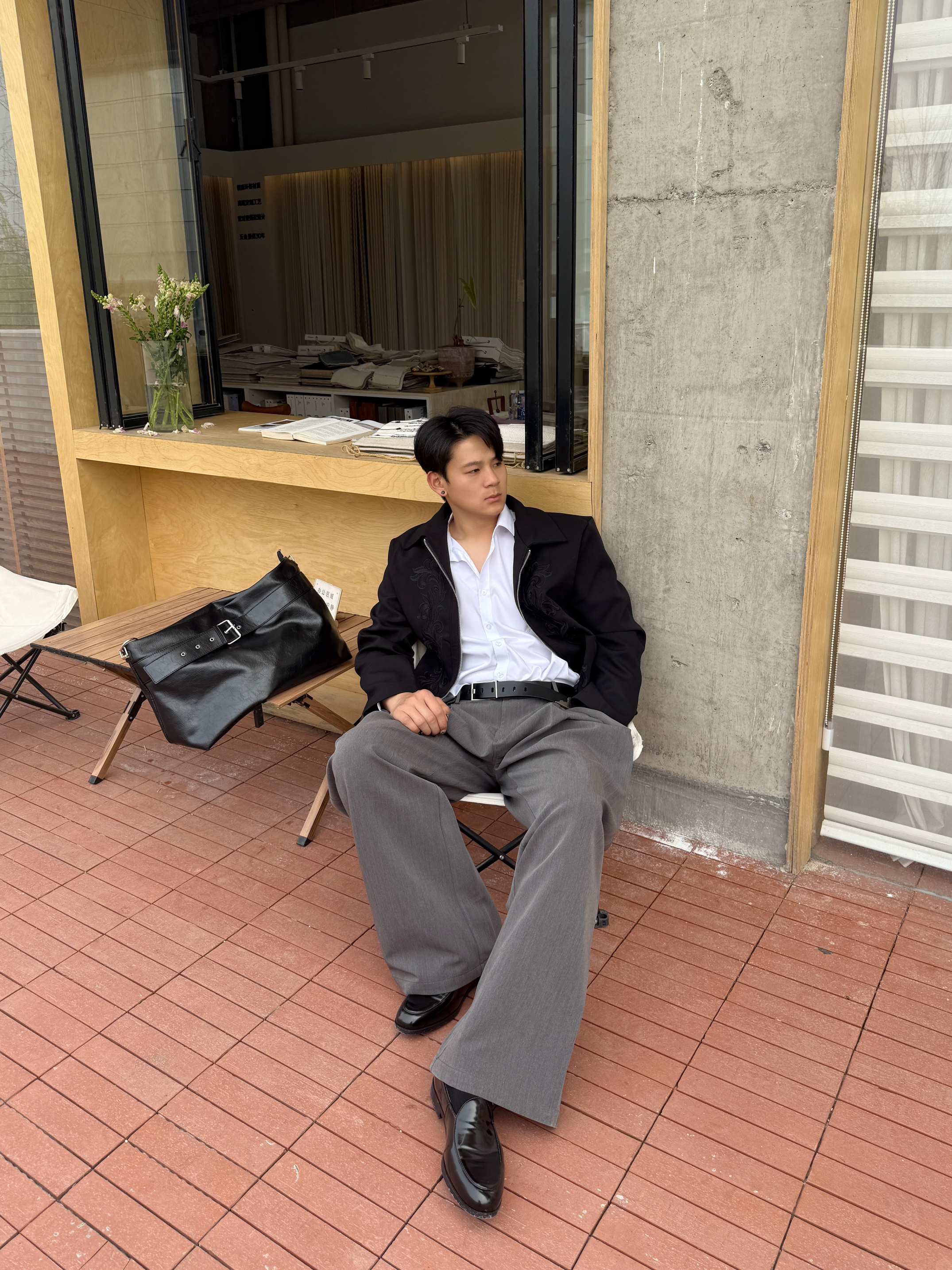 果然是配饰选的好穿搭没烦恼 上衣我选择一件黑色休闲偏西装类型外套 白色衬衫作为内搭 裤子我选择一件灰色直筒西裤 直筒的版型穿起来显高修饰腿型 腰带我选择一条原创设计皮带 鞋子我选择尖头皮鞋这样潮流感十足~