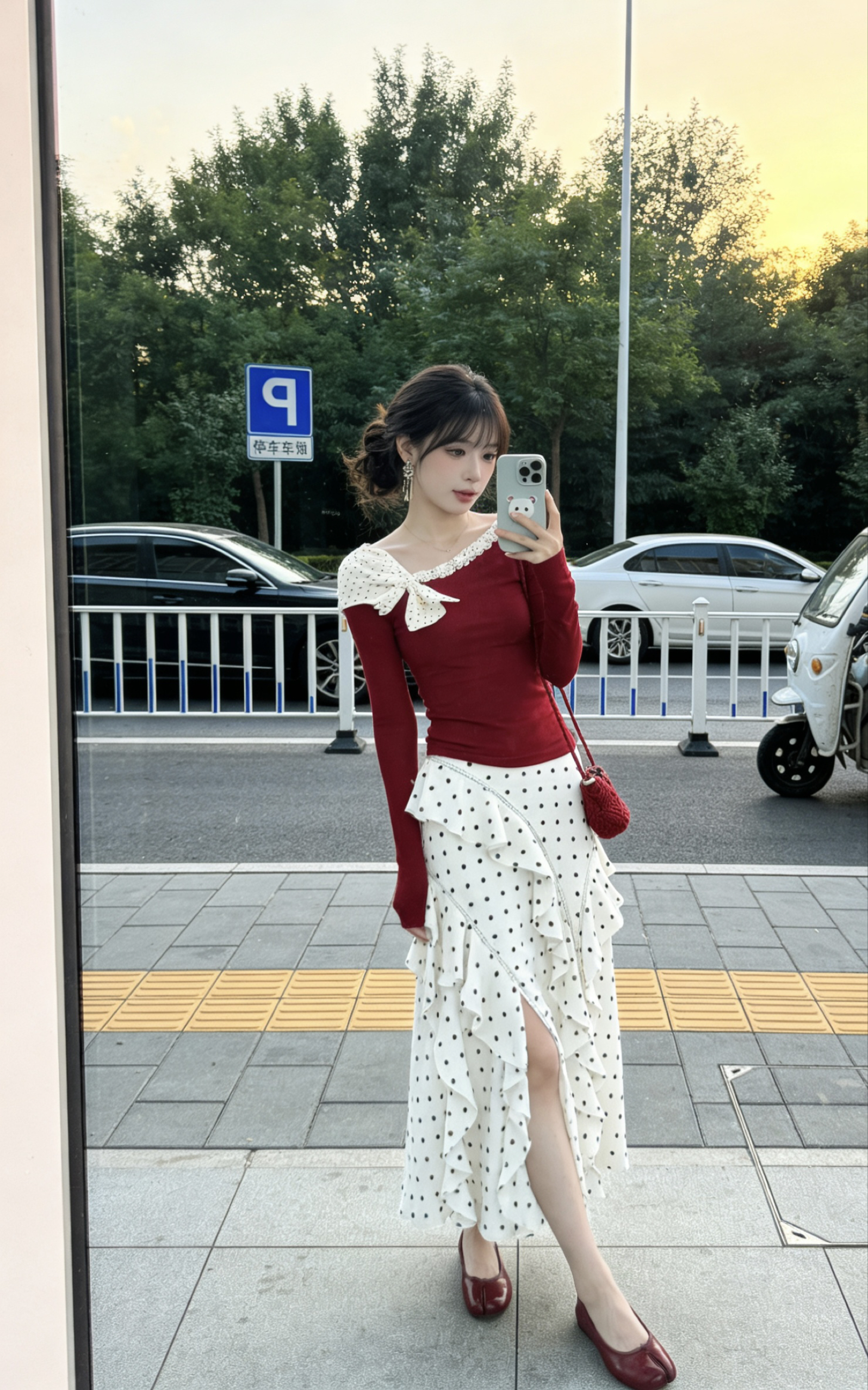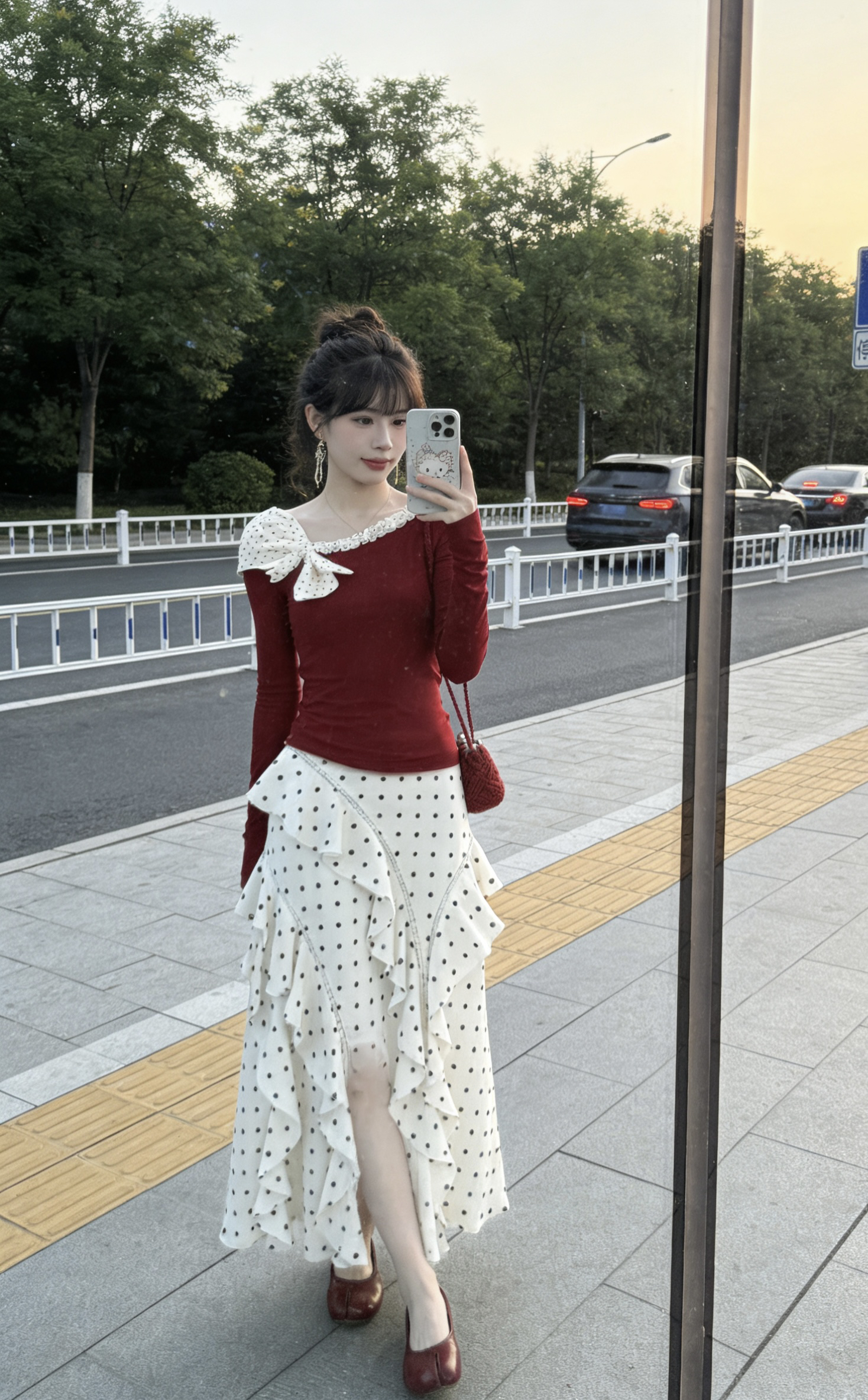 ✨ 穿搭解析 • 红色蝴蝶结上衣:新年红超显白!斜肩设计露出精致锁骨,波点蝴蝶结自带少女感,温柔中透着小性感,早春单穿就很出彩~ • 波点荷叶边半裙:法式碎花元素和上衣完美呼应,层层荷叶边灵动飘逸,走路带风的氛围感,温柔气质直接拉满! • 红色分趾鞋+迷你针织包:整套look的点睛之笔!复古红呼应超有质感,迷你小包精致又实用,甜酷平衡得刚刚好~ 🌿 春日氛围感 夕阳下的街道随手拍都超有感觉...
