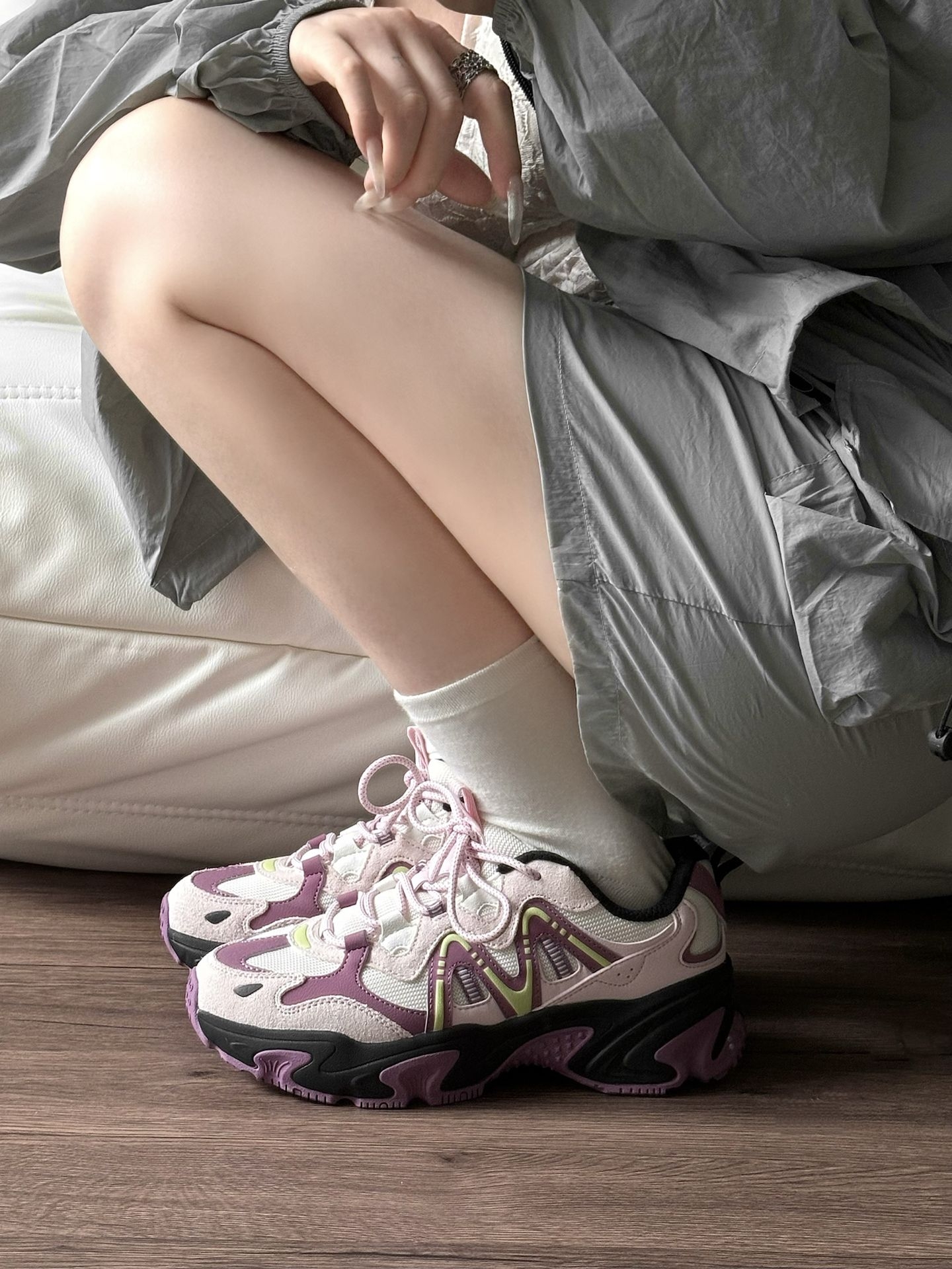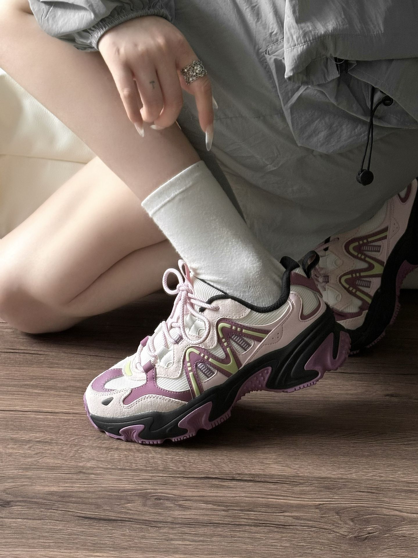 救命!这双鞋才是春天该有的样子🌷 粉紫撞色甜酷感拉满,上脚秒变漫画腿! 厚底设计悄悄增高,走路还软fufu的,完全不磨脚~ 配灰色工装裤真的绝了,得物姐妹们快冲,氛围感直接拉满!