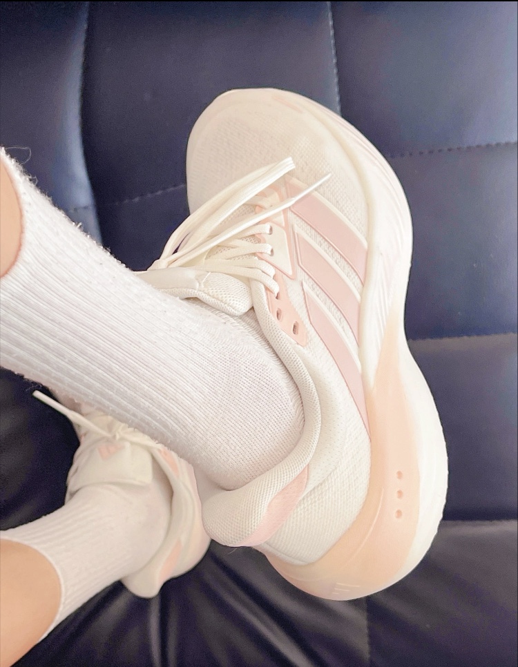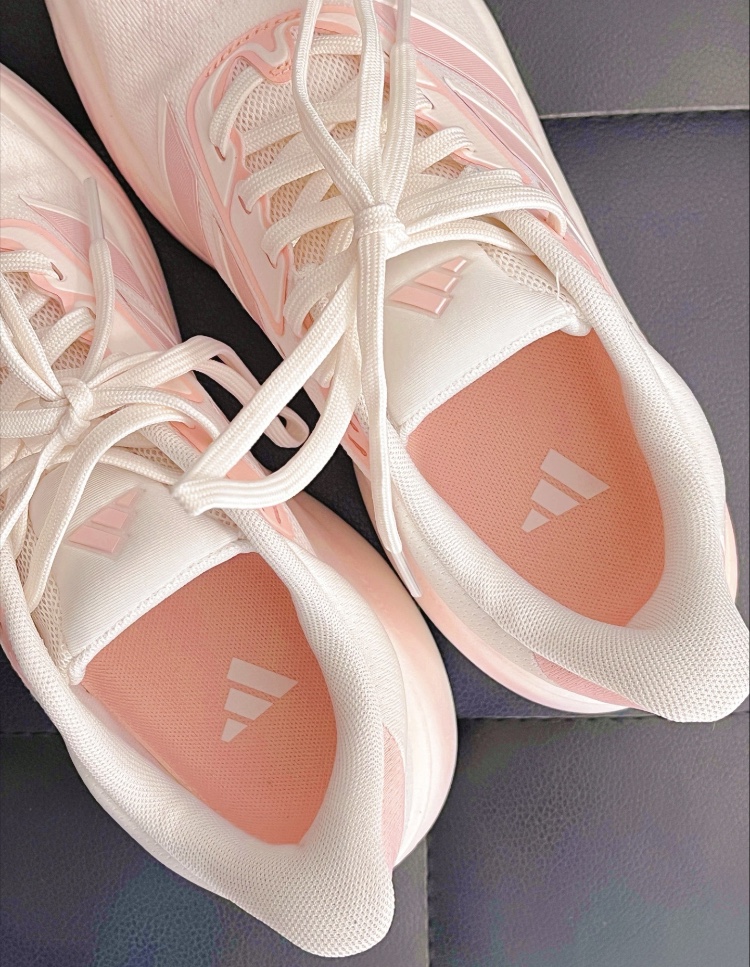 这双清新的白粉撞色Adidas跑步鞋 设计亮眼又不张扬,网眼鞋面透气度出色,日常穿着不闷脚。 Adiwear耐磨大底抓地力强 缓震效果适中,无论是通勤还是慢跑都能胜任。 简约设计适配多种穿搭风格 是一双能兼顾颜值与实用性的日常跑鞋。