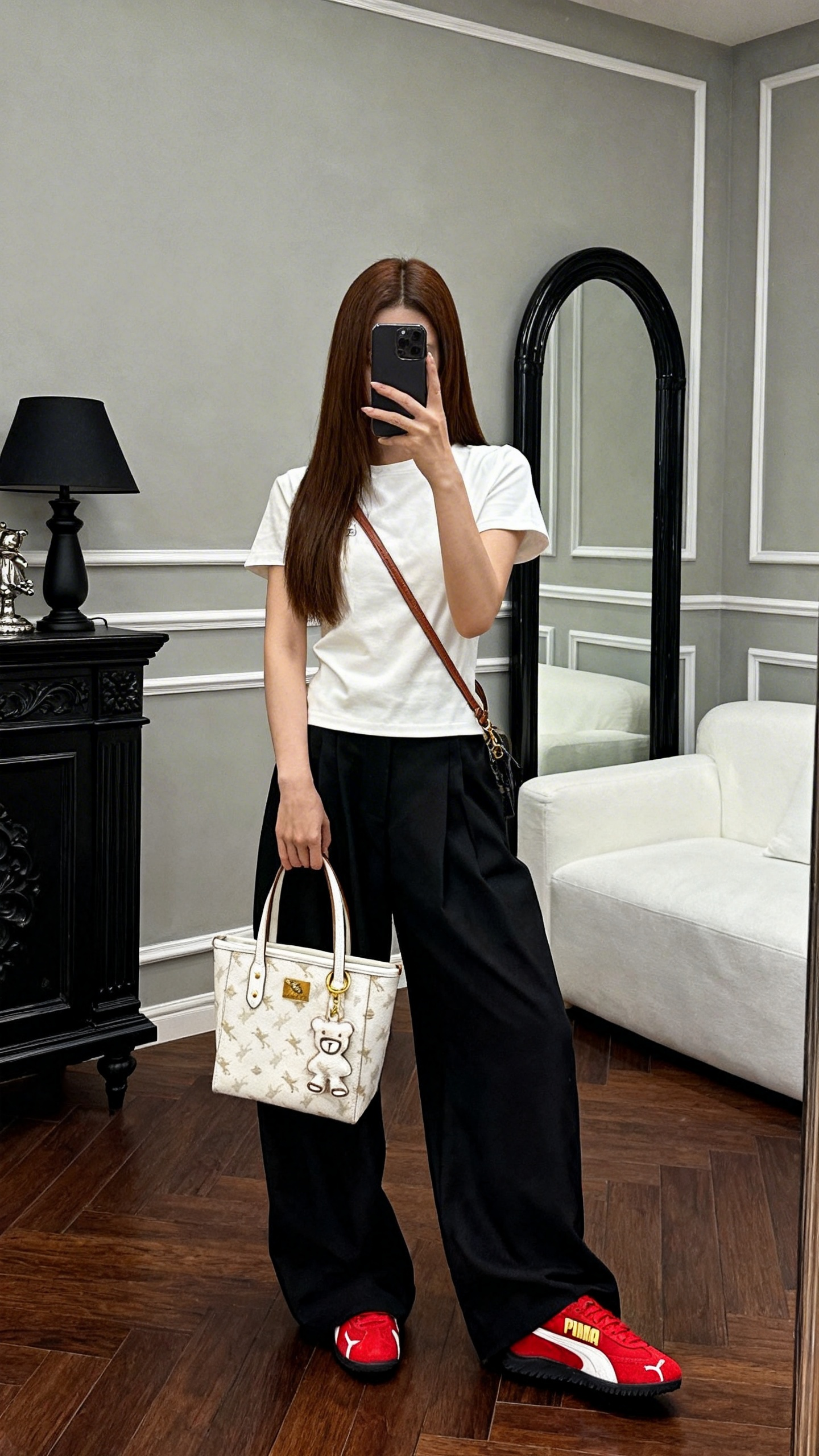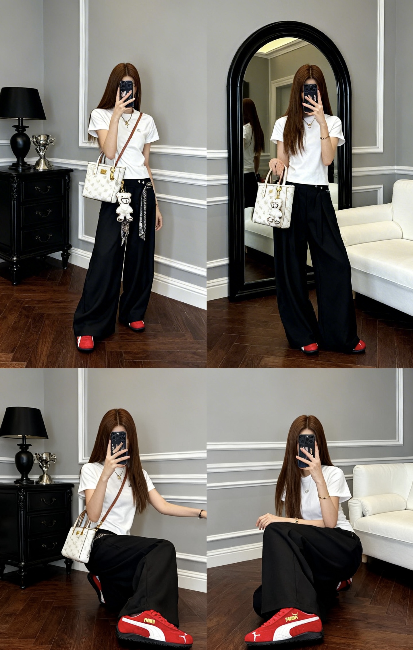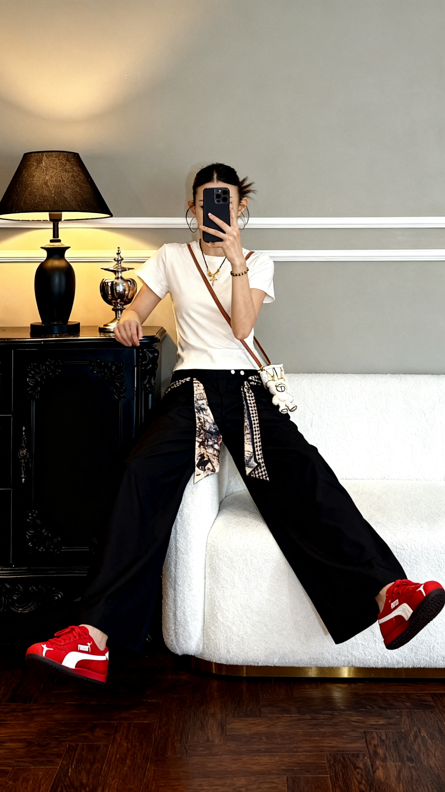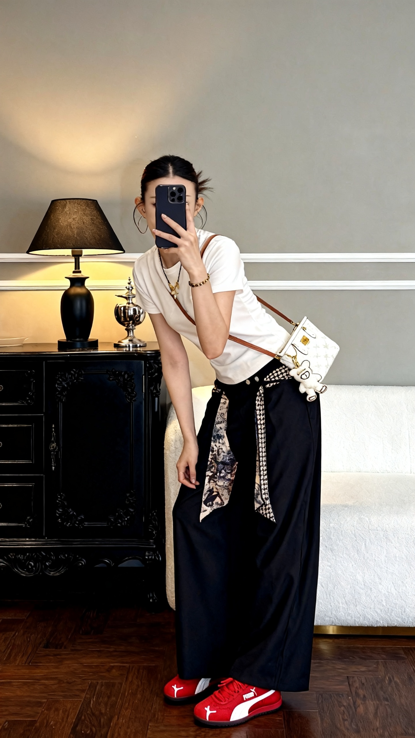 基础白 T + 垂感阔腿裤,简约又显气场 丝巾腰带是点睛之笔,瞬间拉高穿搭精致度 红标德训鞋直接把复古运动感拉满 日常出街 / 通勤都能轻松 hold 住,又酷又随性~ #OOTD #酷飒穿搭 #复古运动鞋 #得物穿搭