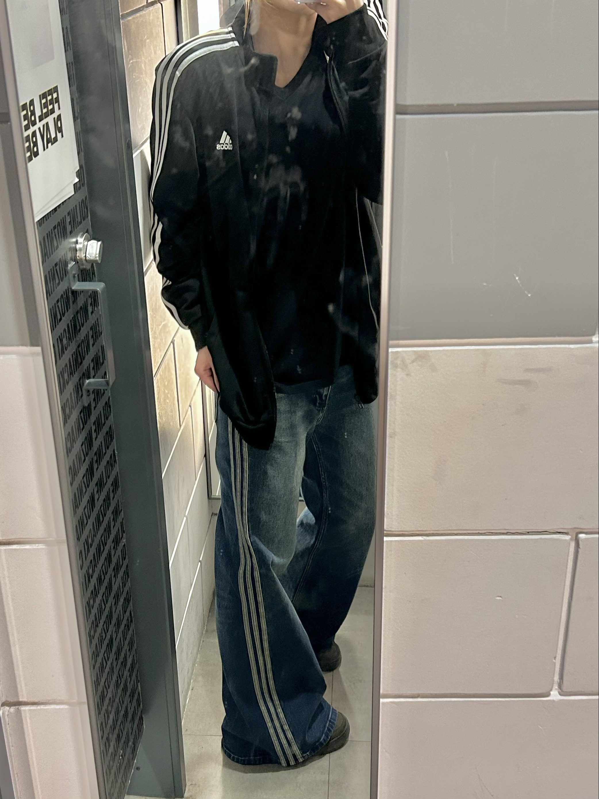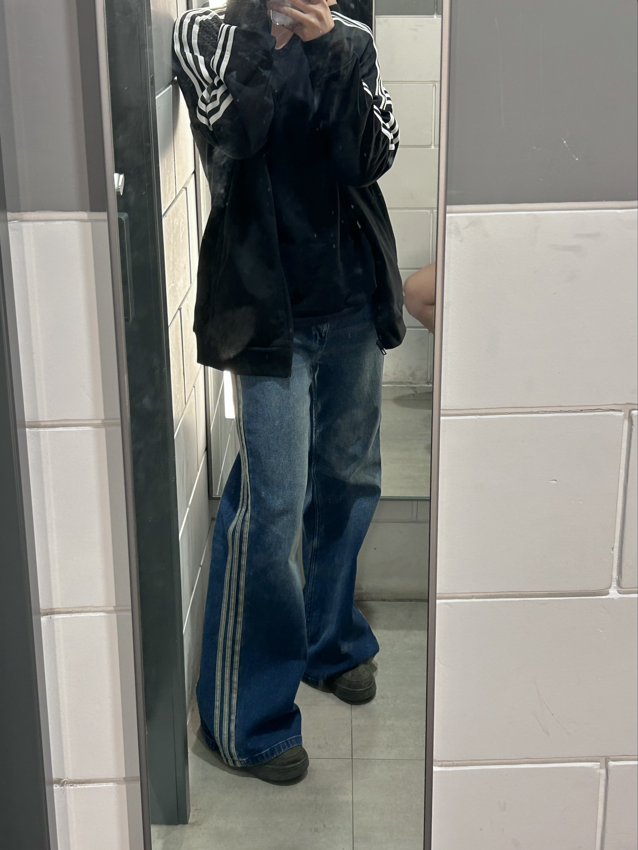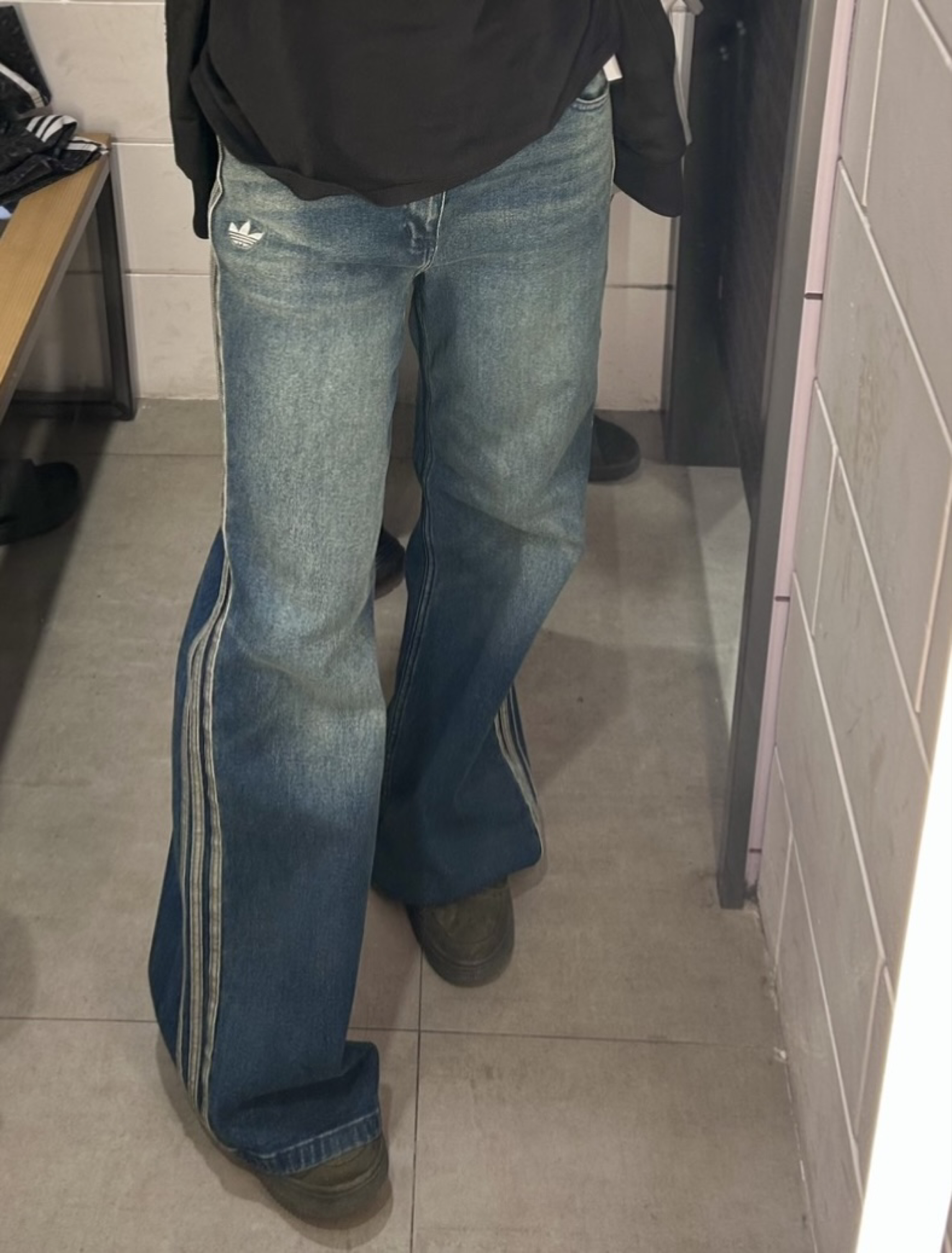 裤子是在阿迪店内试的,微喇版型的,但是裤脚微喇的并不大,我个人是比较喜欢这种的,裤子是偏软牛仔的,稍微还带点弹性,我感觉修饰腿型还挺不错,因为我腿型是那种弯弯的小肉腿,但是这个版型真的是长在我心巴上了🥹 我 168/55 这个裤子是 170/70a 的,我感觉正好,给你们个参考吧😁