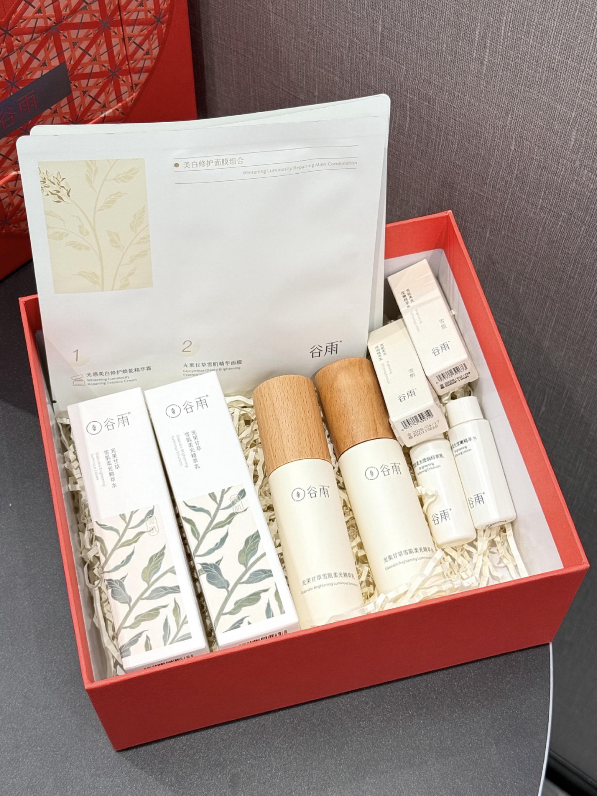 我习惯熬夜了 但又担心皮肤黄 就一直用的介谷雨雪肌水乳 我感觉用着蛮不错的 反正回家妈妈说我脸色蛮好看哈哈 雪肌水质地蛮清爽的 雪肌乳不会粘腻 我混油感觉刚刚好 618我要多囤一些啦 礼盒包装蛮精美的 还可以当礼物