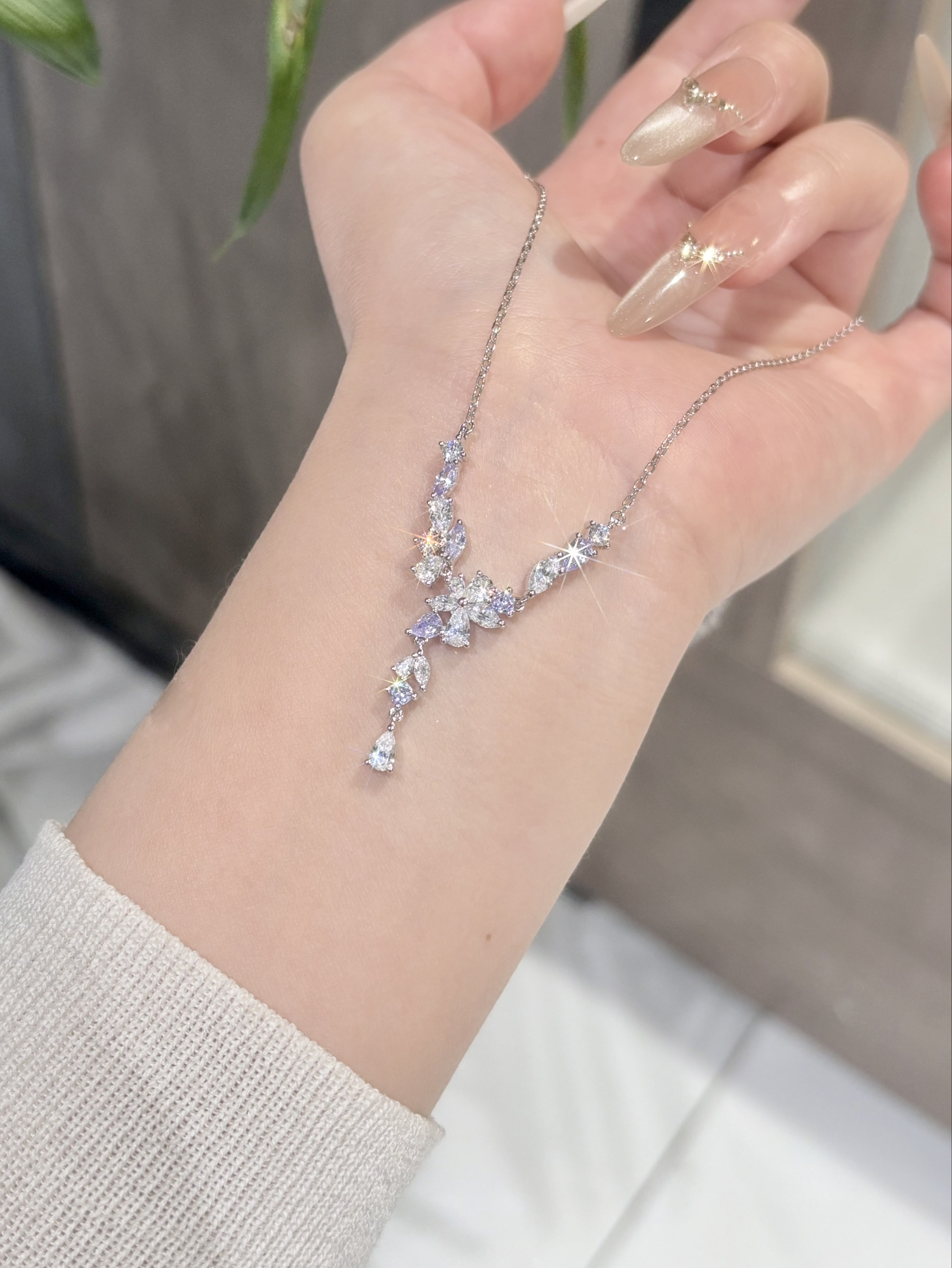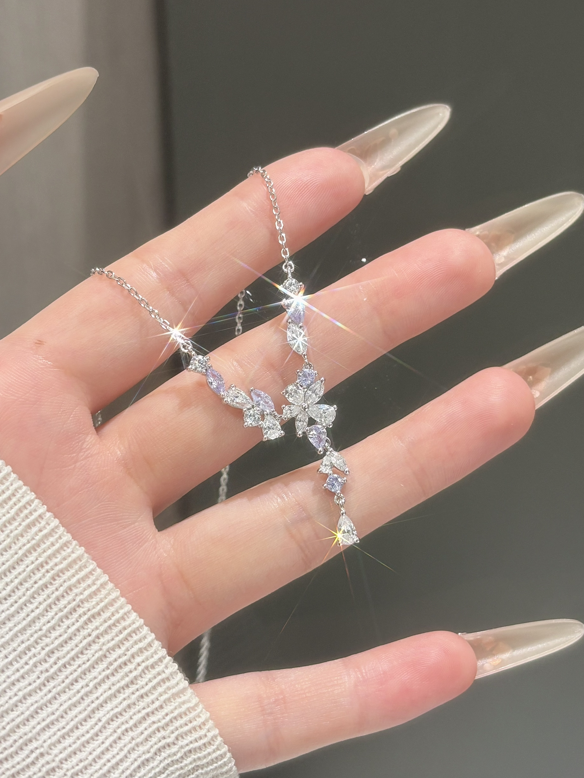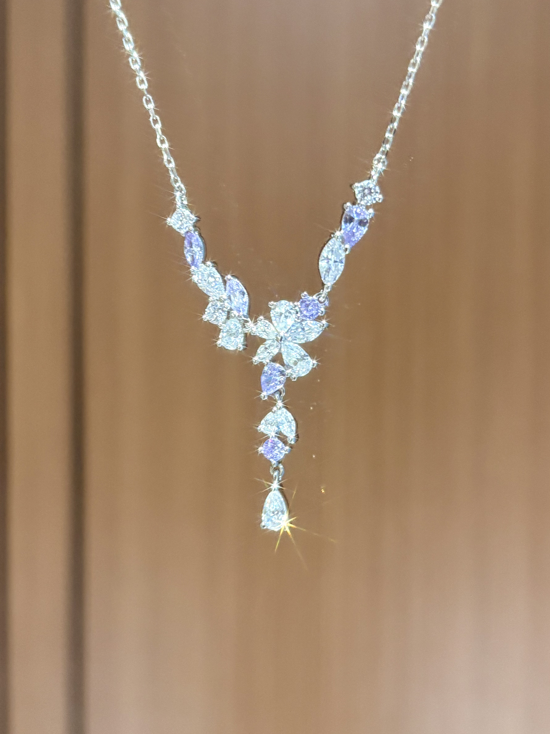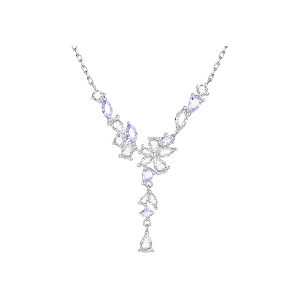 只有好闺闺才懂我的审美啦 介条范琦的紫藤花项链直戳我心巴了 是紫色和白色的钻组合就很梦幻哦 这种Y字型的戴着还挺修饰脖领线条的耶 感觉用来搭配我的一字肩上衣或者小裙子都适合呐 周末春游戴着拍照也出片吖~