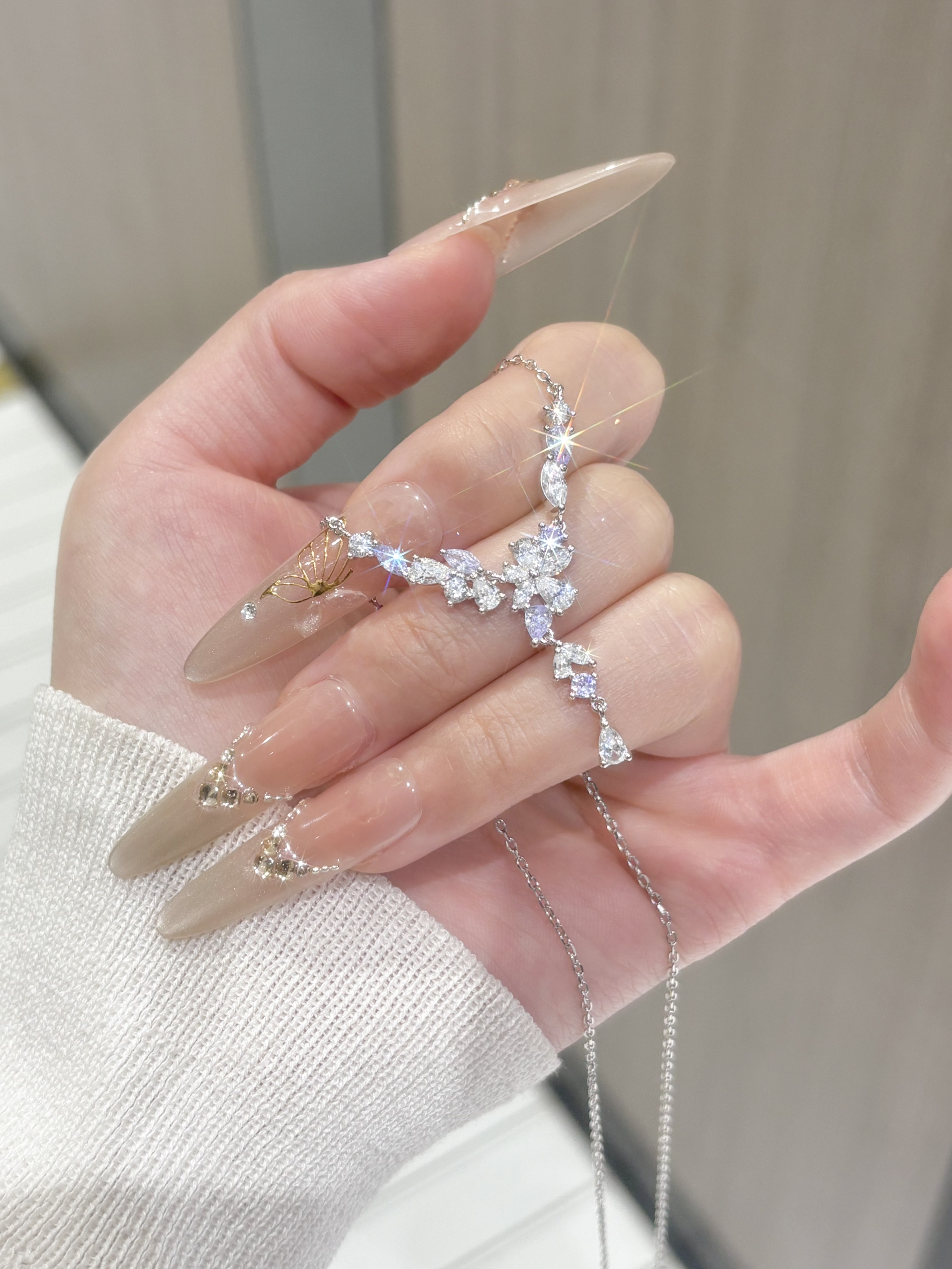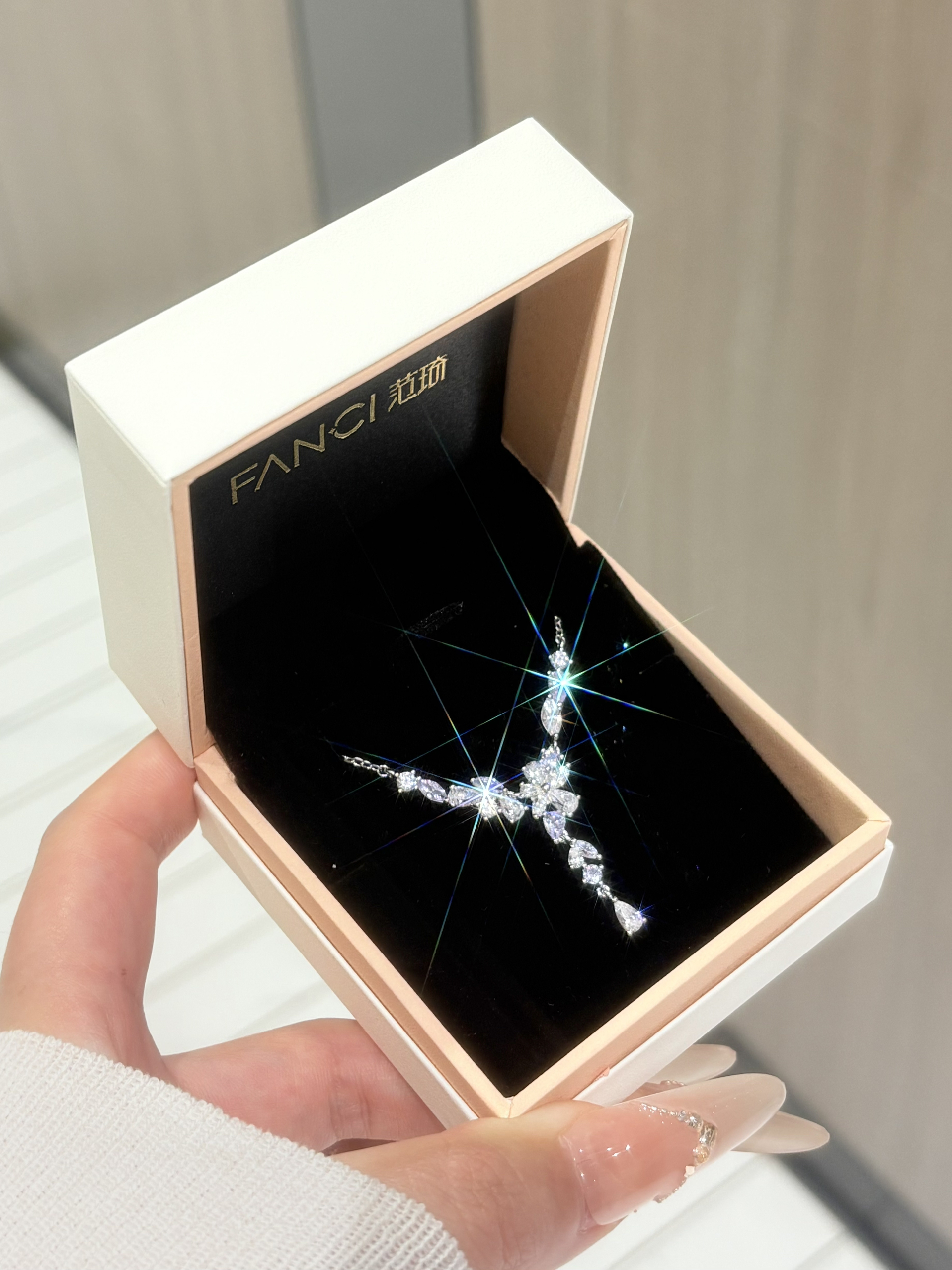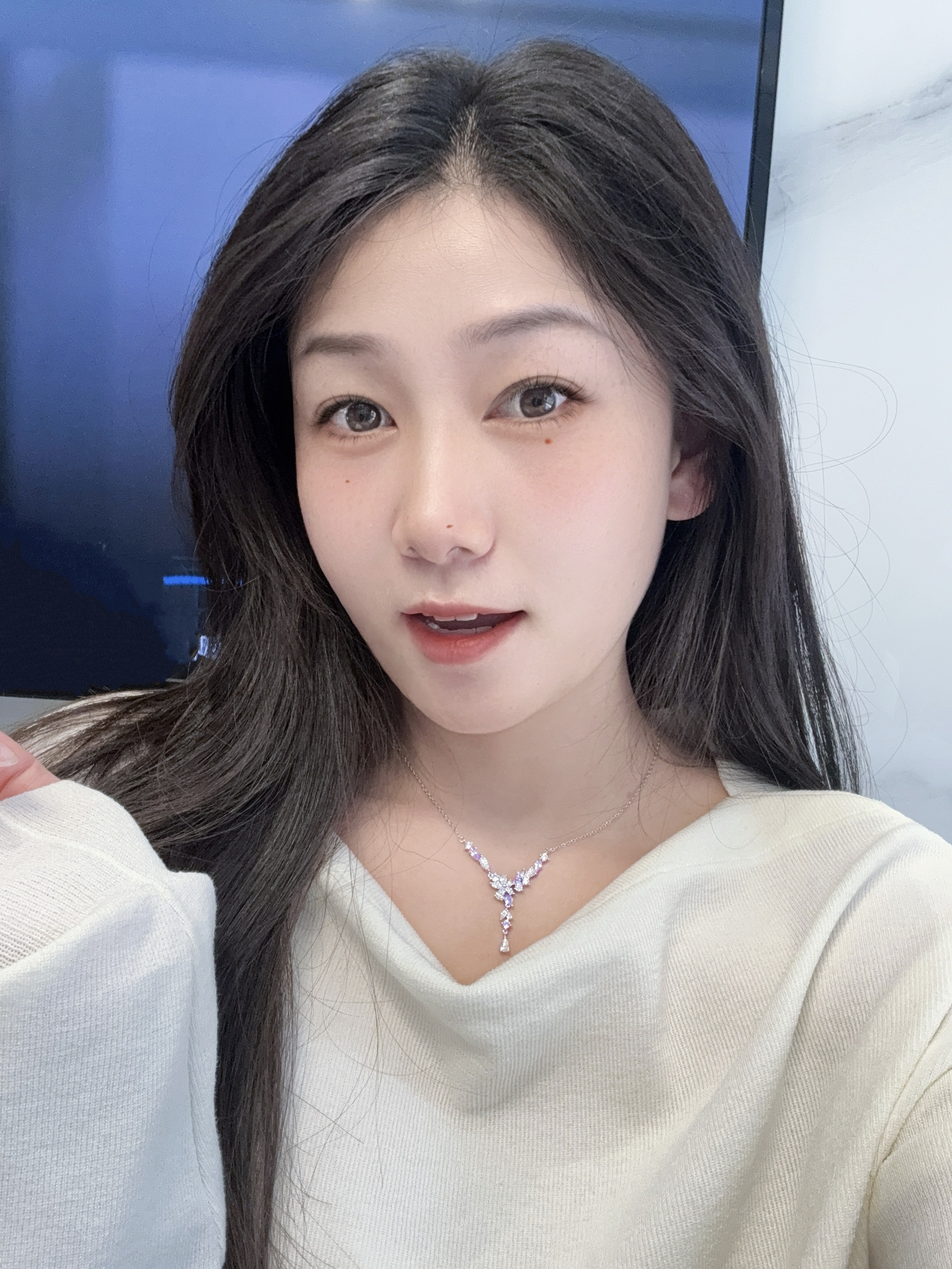 只有好闺闺才懂我的审美啦 介条范琦的紫藤花项链直戳我心巴了 是紫色和白色的钻组合就很梦幻哦 这种Y字型的戴着还挺修饰脖领线条的耶 感觉用来搭配我的一字肩上衣或者小裙子都适合呐 周末春游戴着拍照也出片吖~