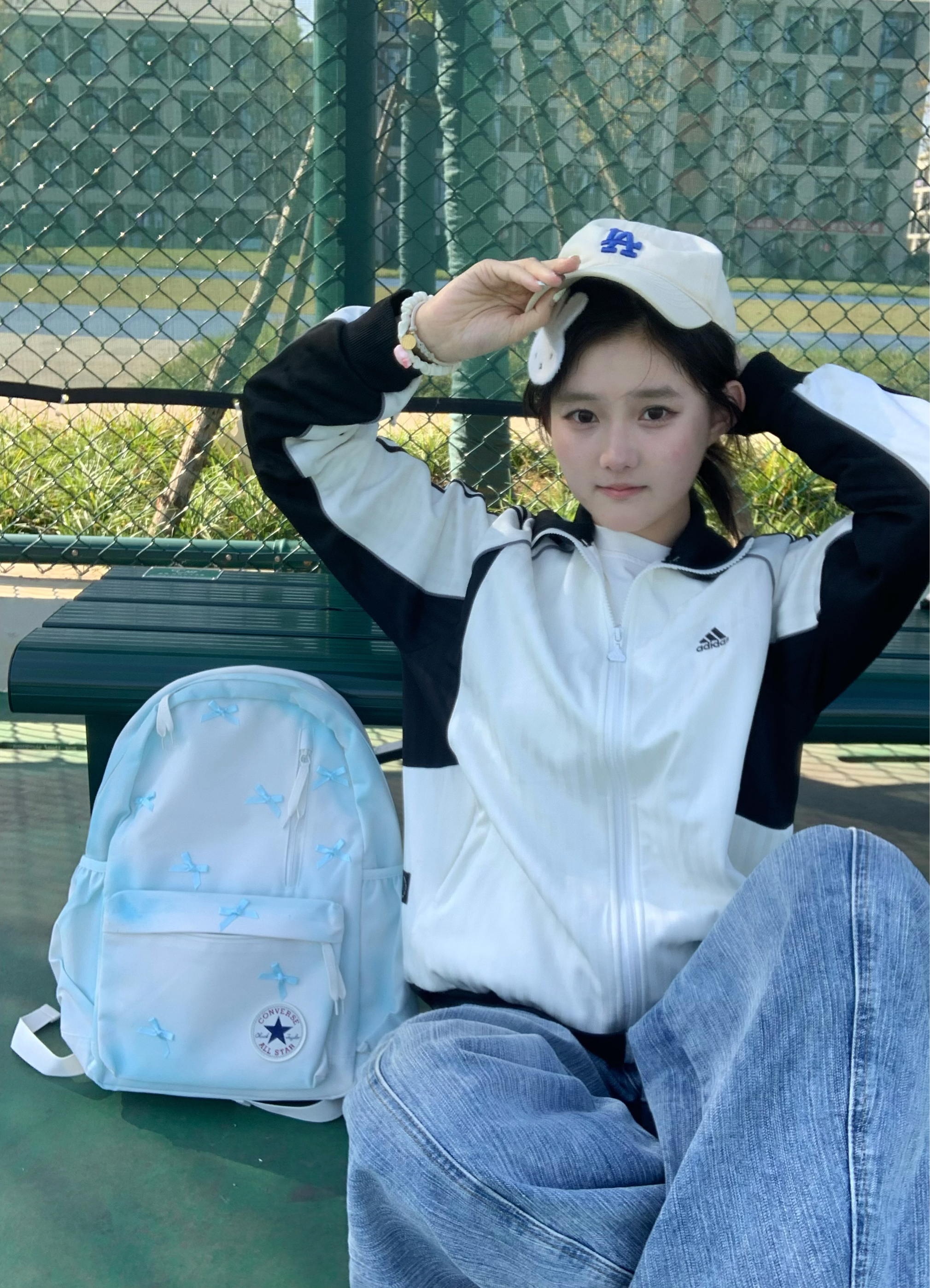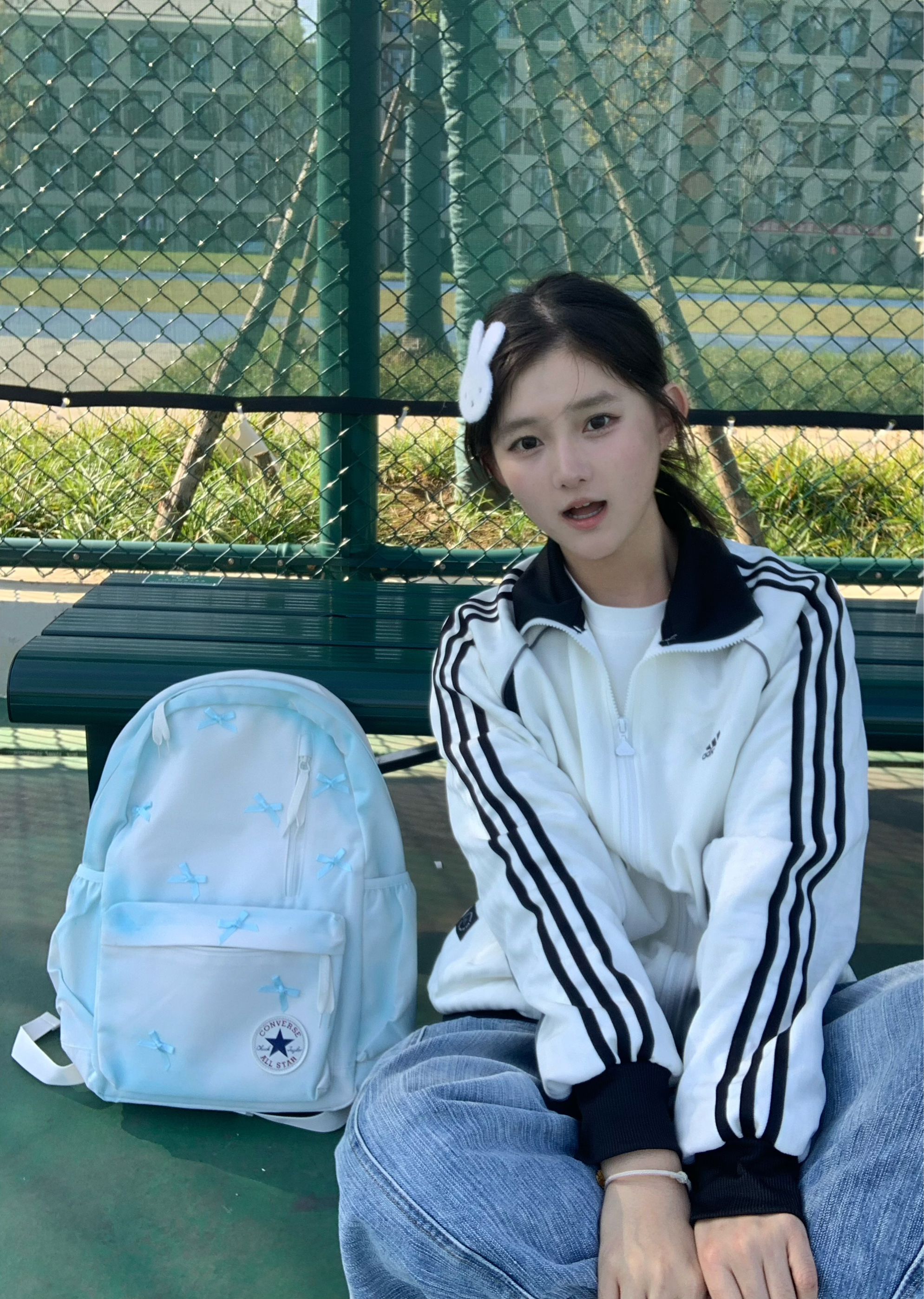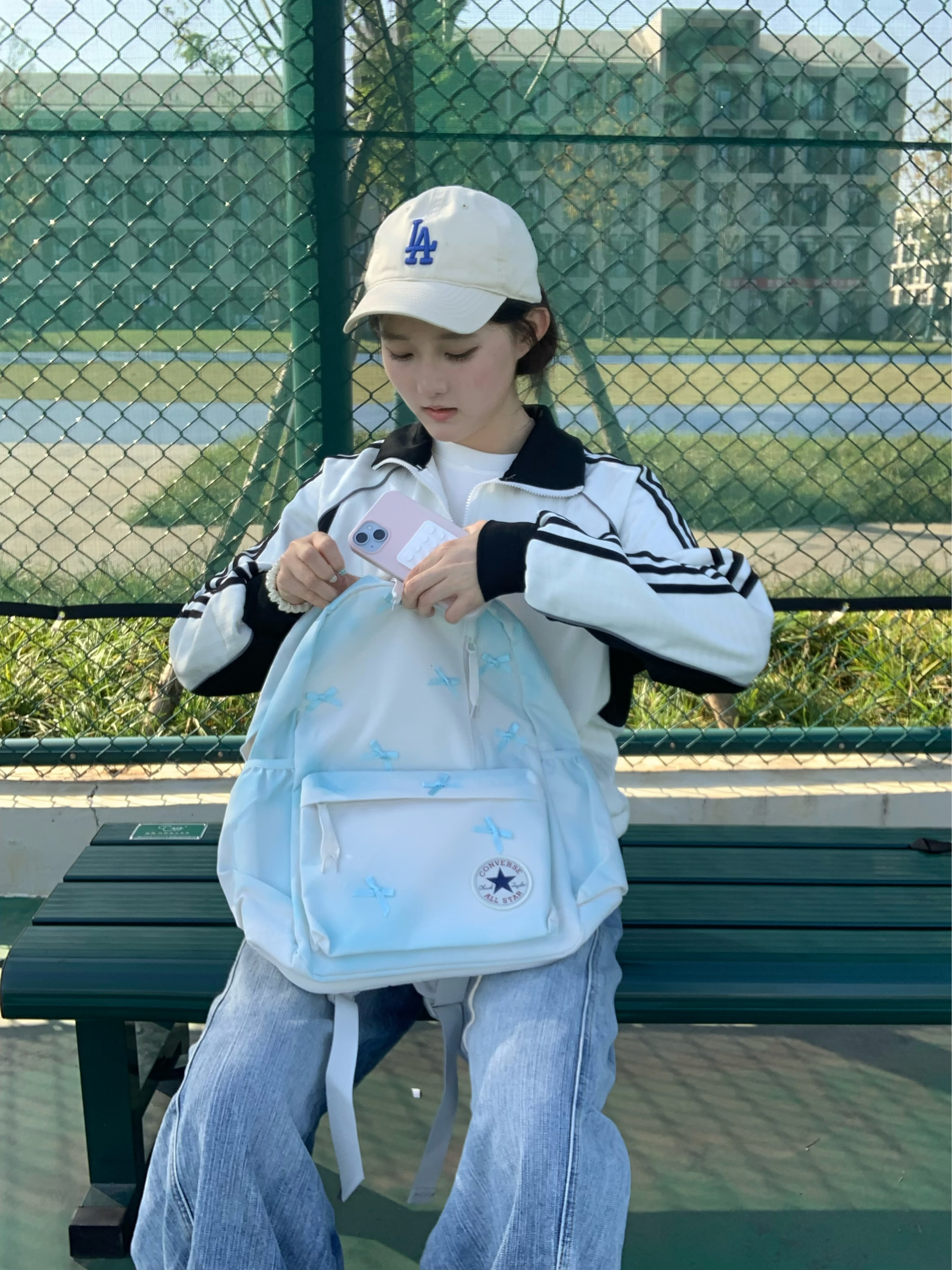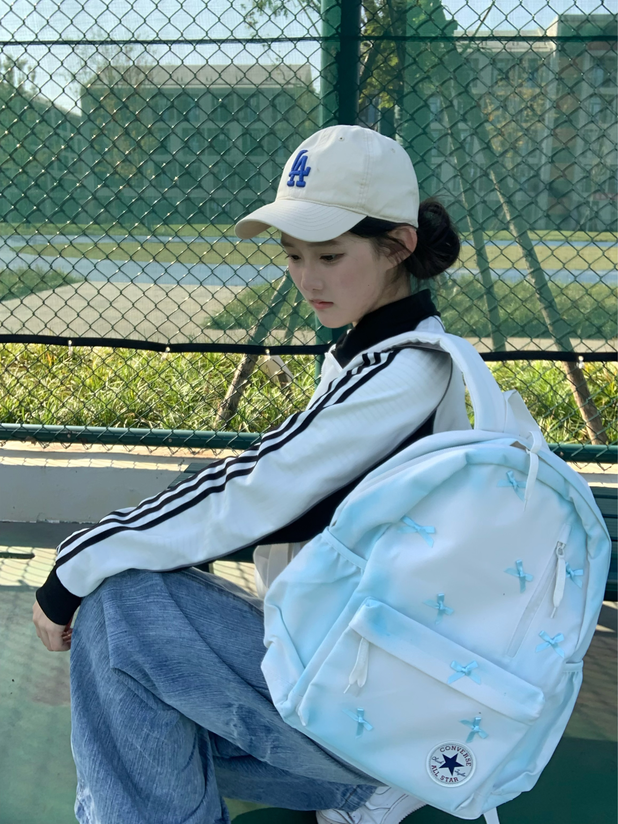 谁能拒绝一个自带氛围感的浅蓝蝴蝶结背包啊🎀 匡威这个书包真的把少女心玩明白了 奶白渐变浅蓝的底色+满印小蝴蝶结 背出门回头率直接拉满 容量也完全够用💼 上课装课本、逛街装水杯和补妆品都没问题 宽肩带设计背久了也不会勒肩膀 自重很轻,日常通勤或短途旅行都适配呀 软fufu的质感加上匡威经典的All Star徽章 松弛感和精致感同时拿捏 不管搭配卫衣还是连衣裙都超搭✨ 春天就靠它来点亮整套穿搭啦...