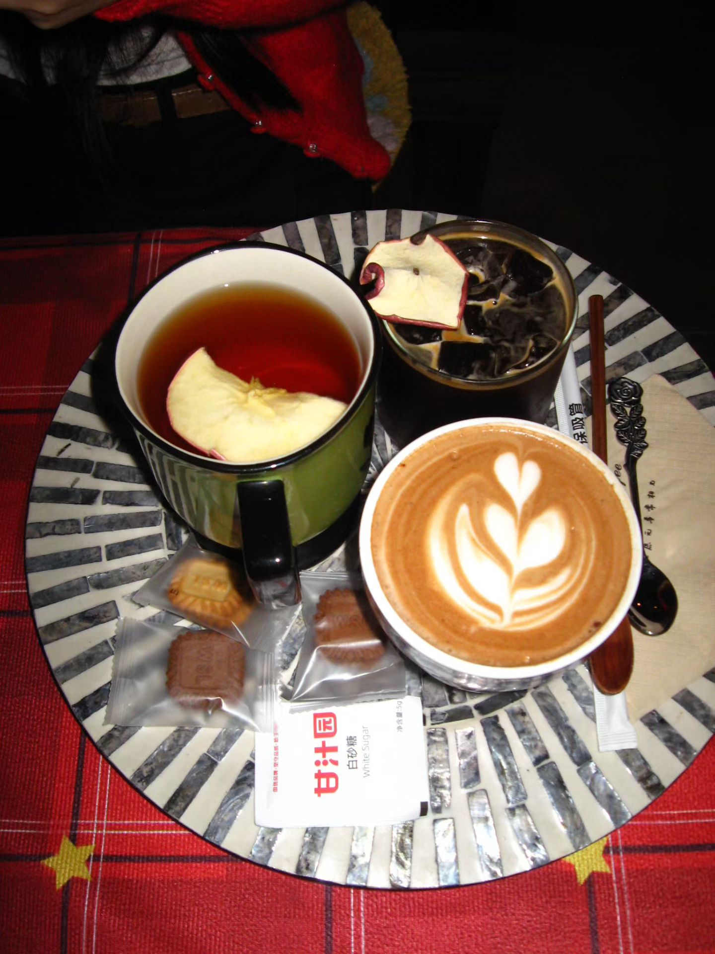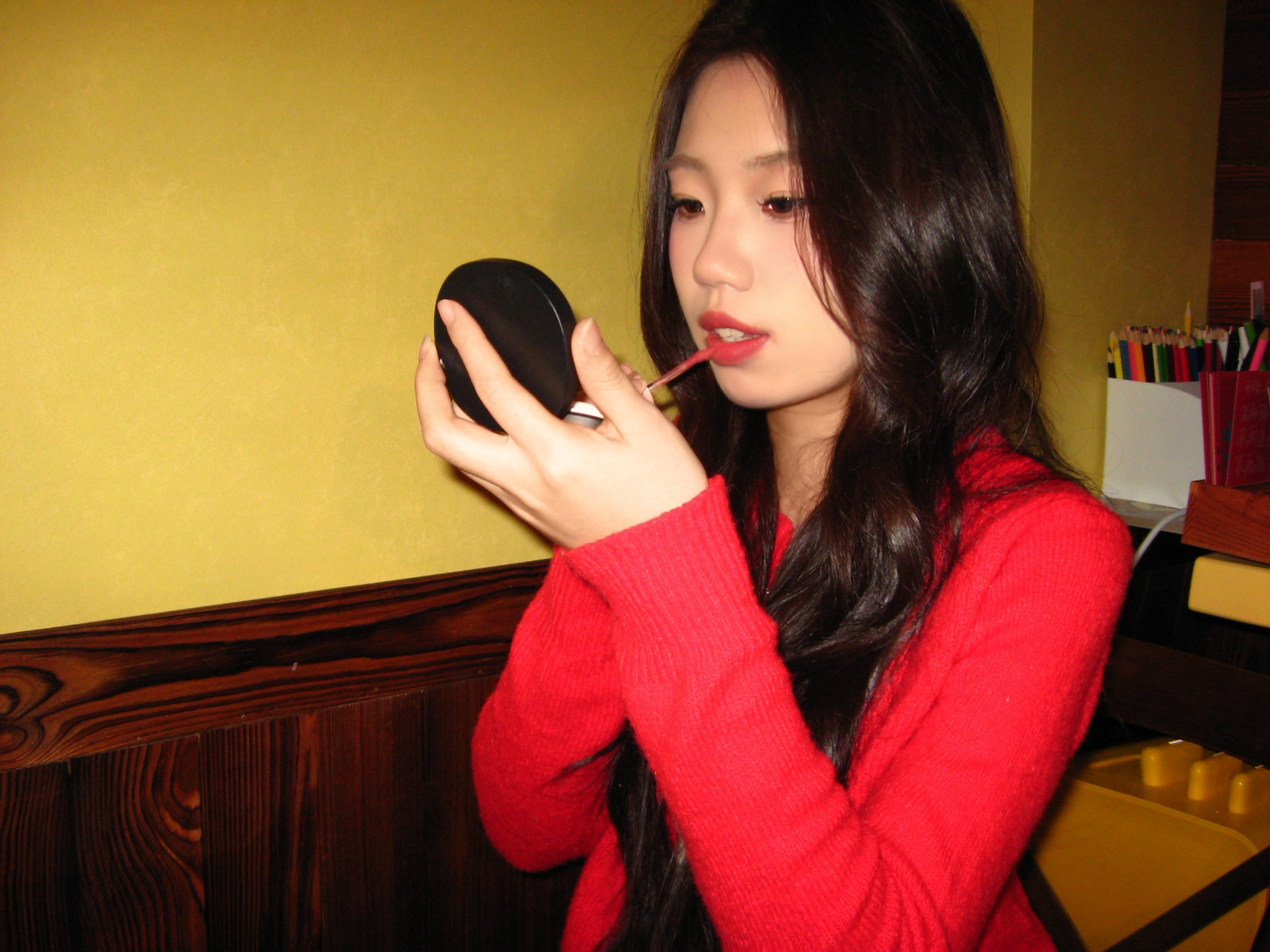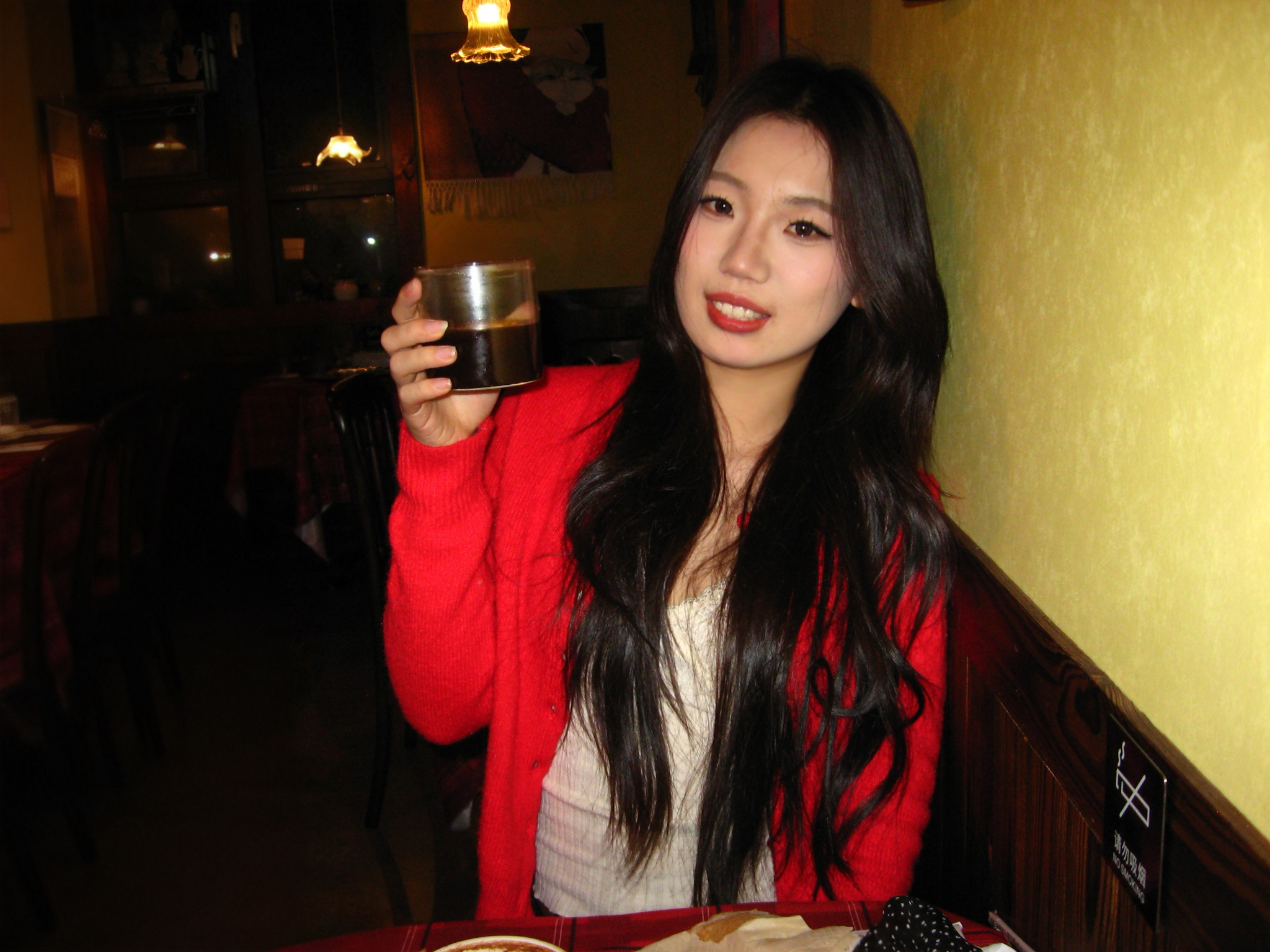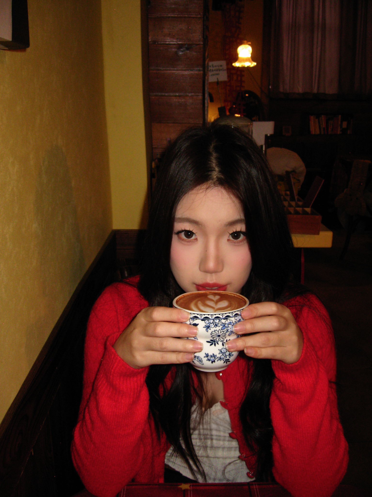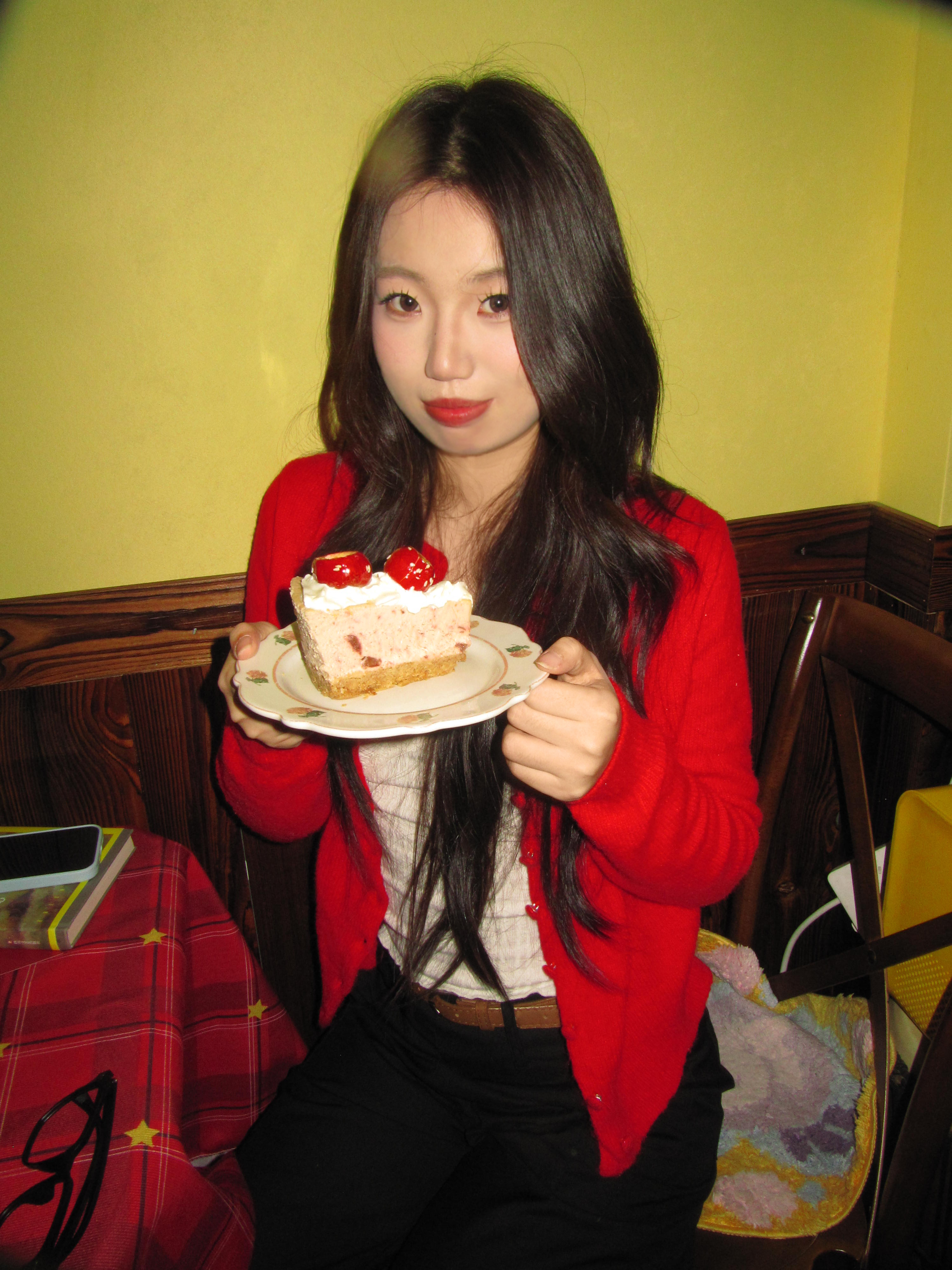 红色开衫真的太显白了!在暖黄灯光的复古小店,用蛋糕和咖啡当背景,随手一拍都是胶片感ootd,甜妹氛围感直接拉满