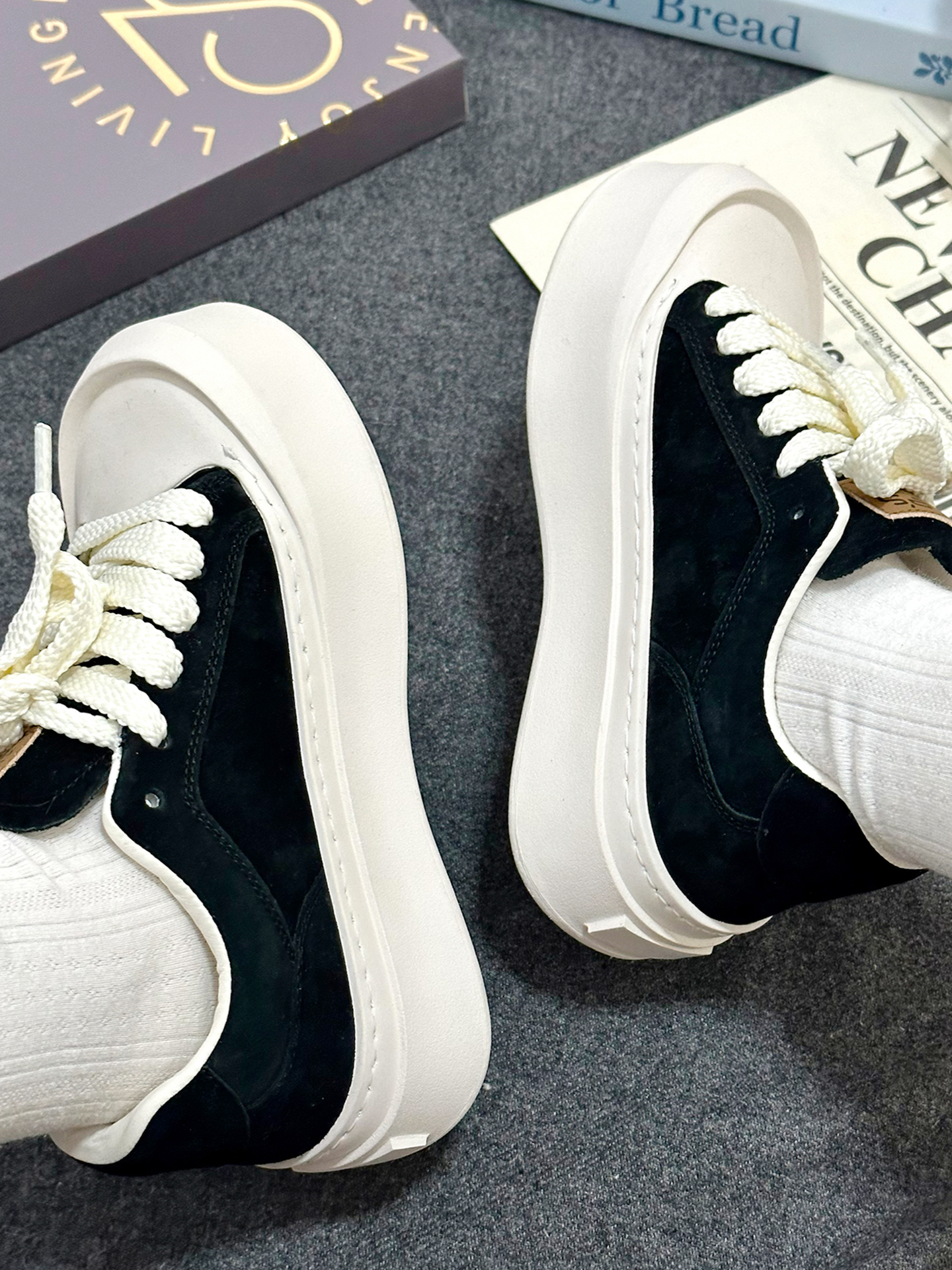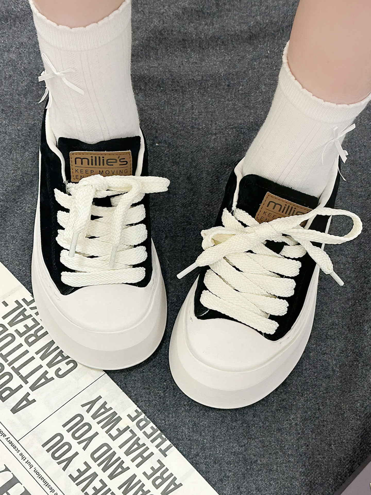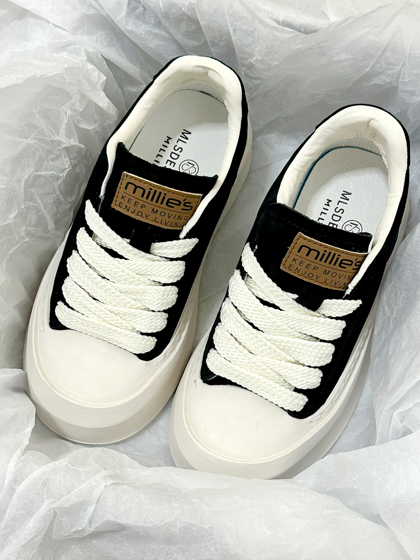 刚穿完这双 millie's 厚底板鞋,走了大半天路,厚底软弹,脚感稳当不晃👟 记一下,麂皮面易沾小绒毛,黑白撞色很经典,搭带蝴蝶结白袜刚好,鞋底防滑纹清晰📝 总之喜欢增高感的可以试试,日常穿搭都适配💭