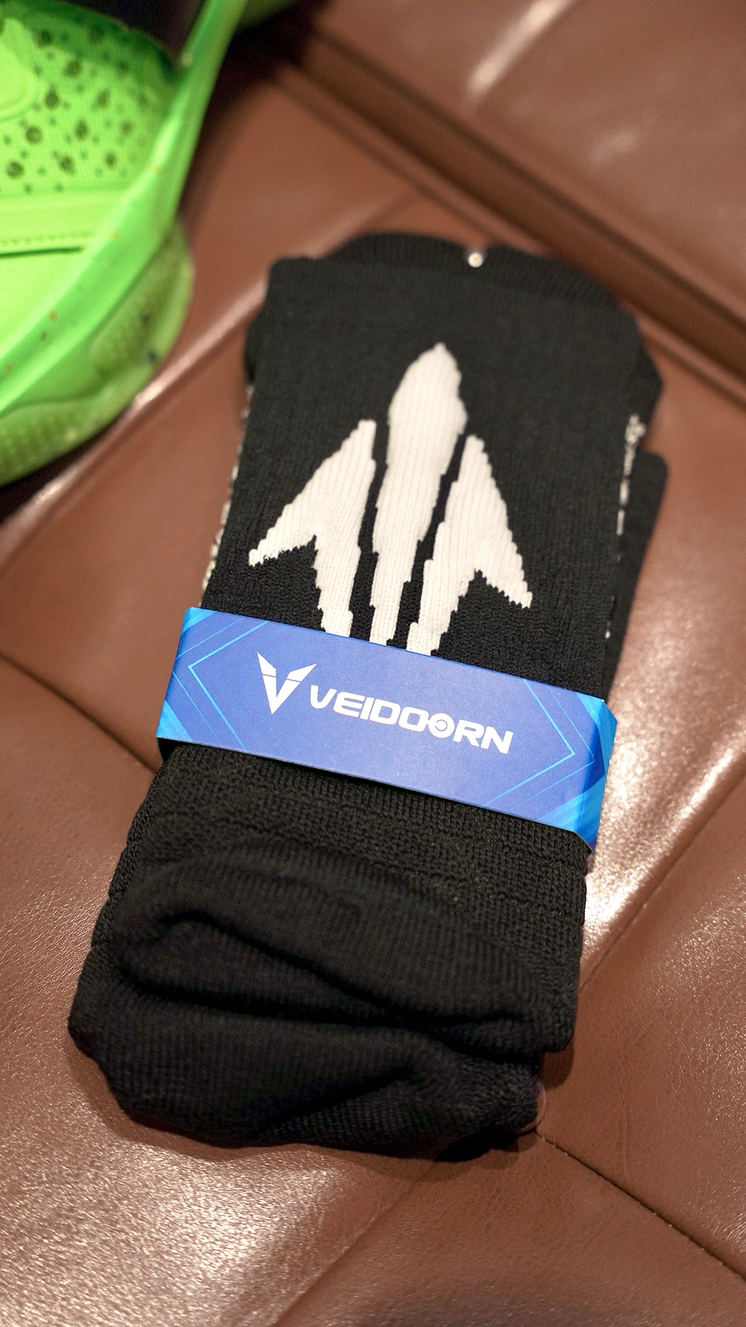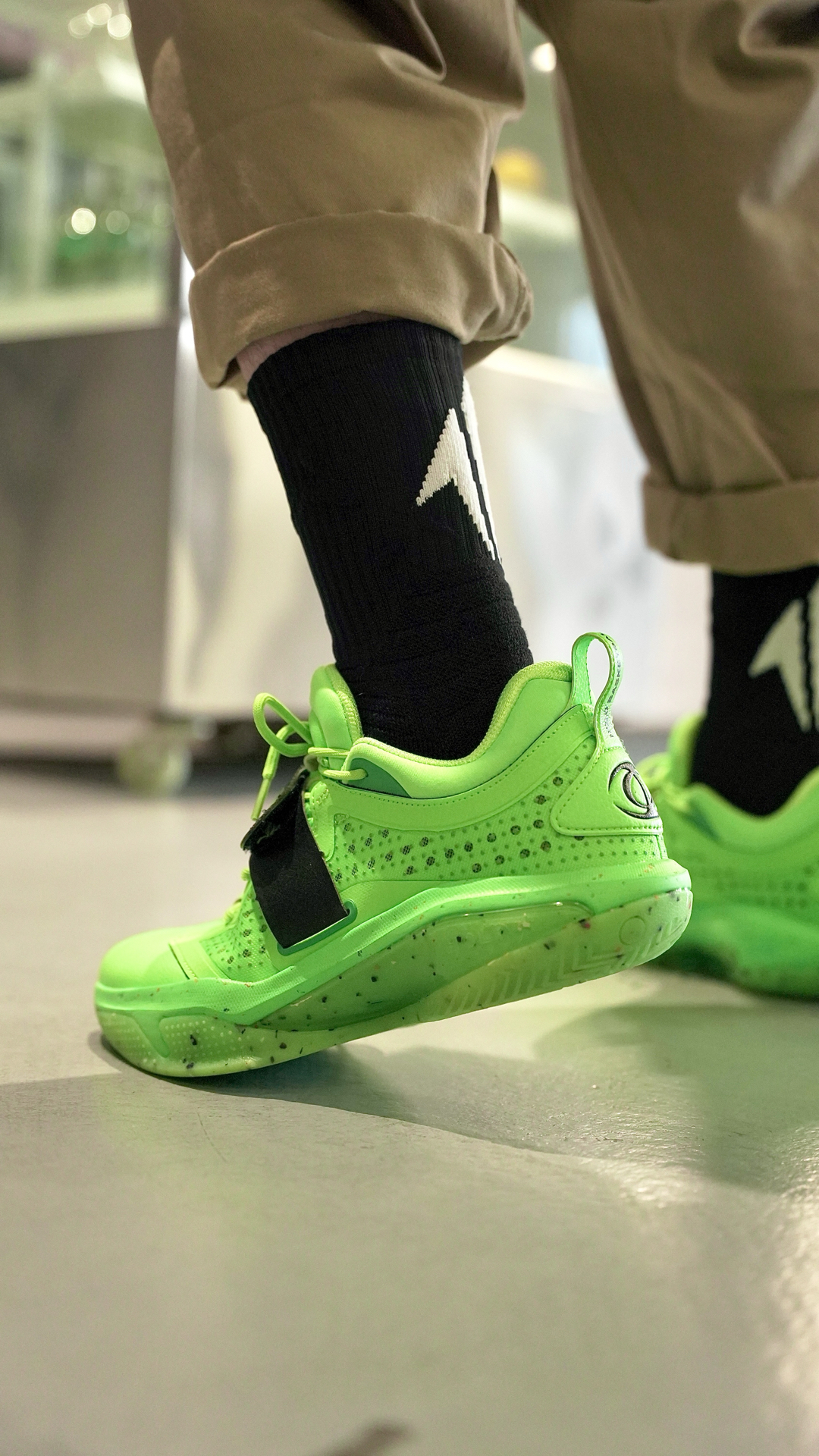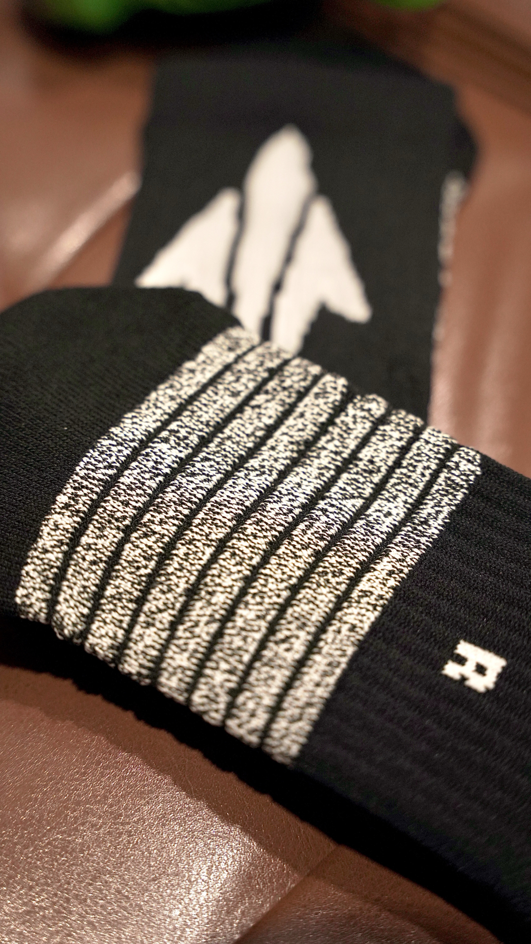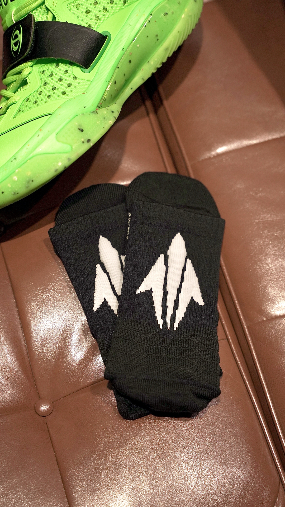 这袜子我说百搭应该没有人反对吧 这个离弦造型的后跟真的太绝了! 仿佛就是张弓搭箭射出去的箭矢 穿上后立刻有种向上发射的错觉 并且这款袜子的几个配色都不会出错 黑白色的离弦更是百搭任何球鞋 我特地挑了一双特别冷门的球鞋 你们看下上脚效果~ 颜值到位球袜的性能也没有落下 全掌加压加厚并且搭配防滑纱 即提供了一定的缓震也保证了防滑 踝部和后跟也做了单独的加厚保护 脚背则是另一种透气网纱...