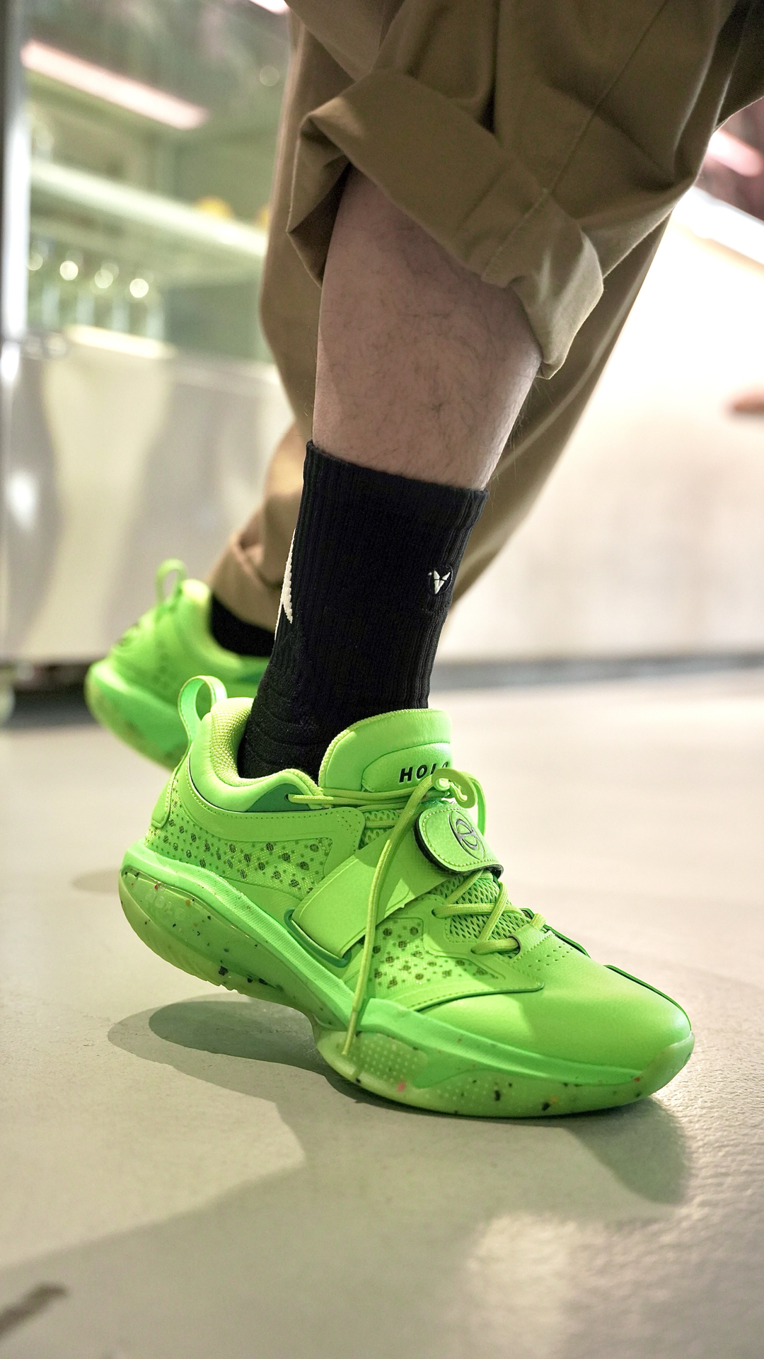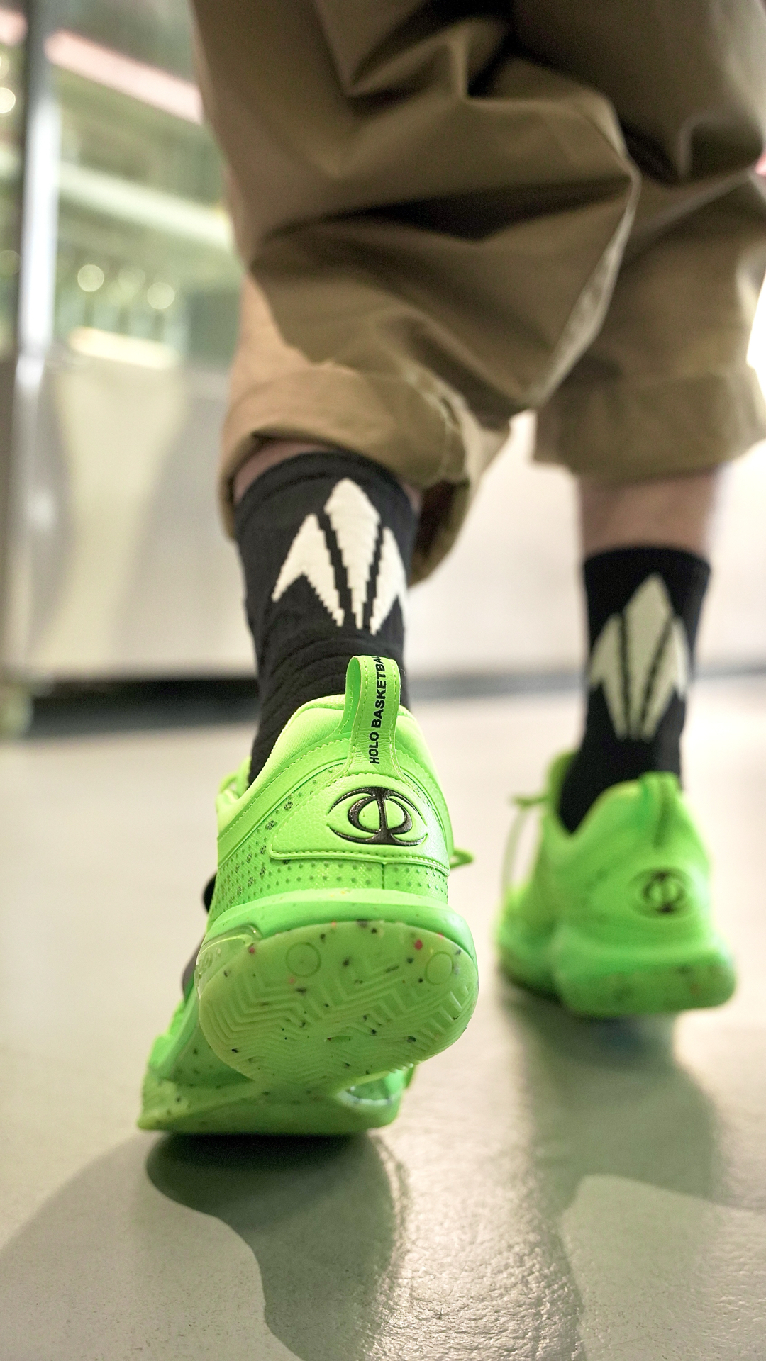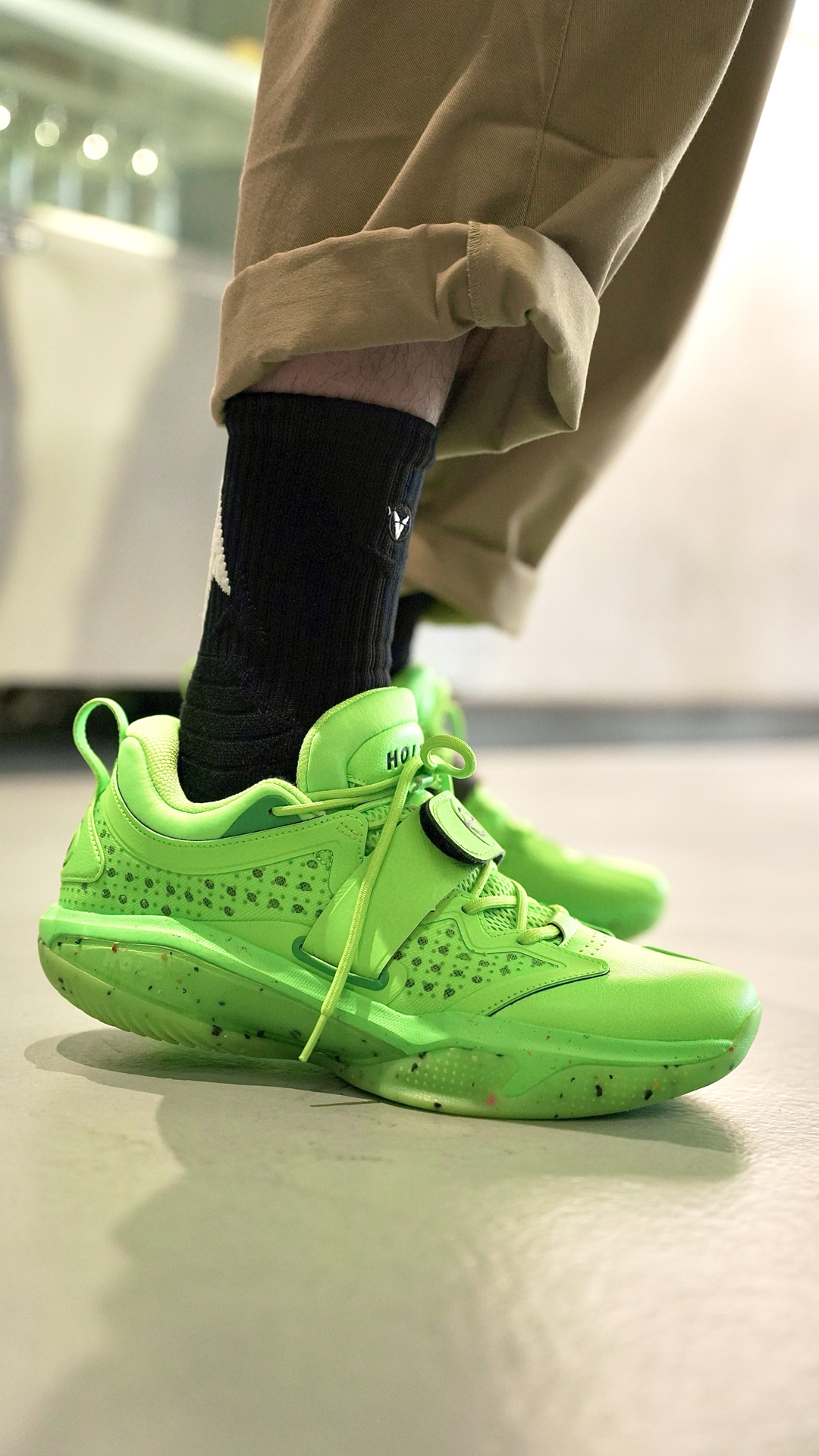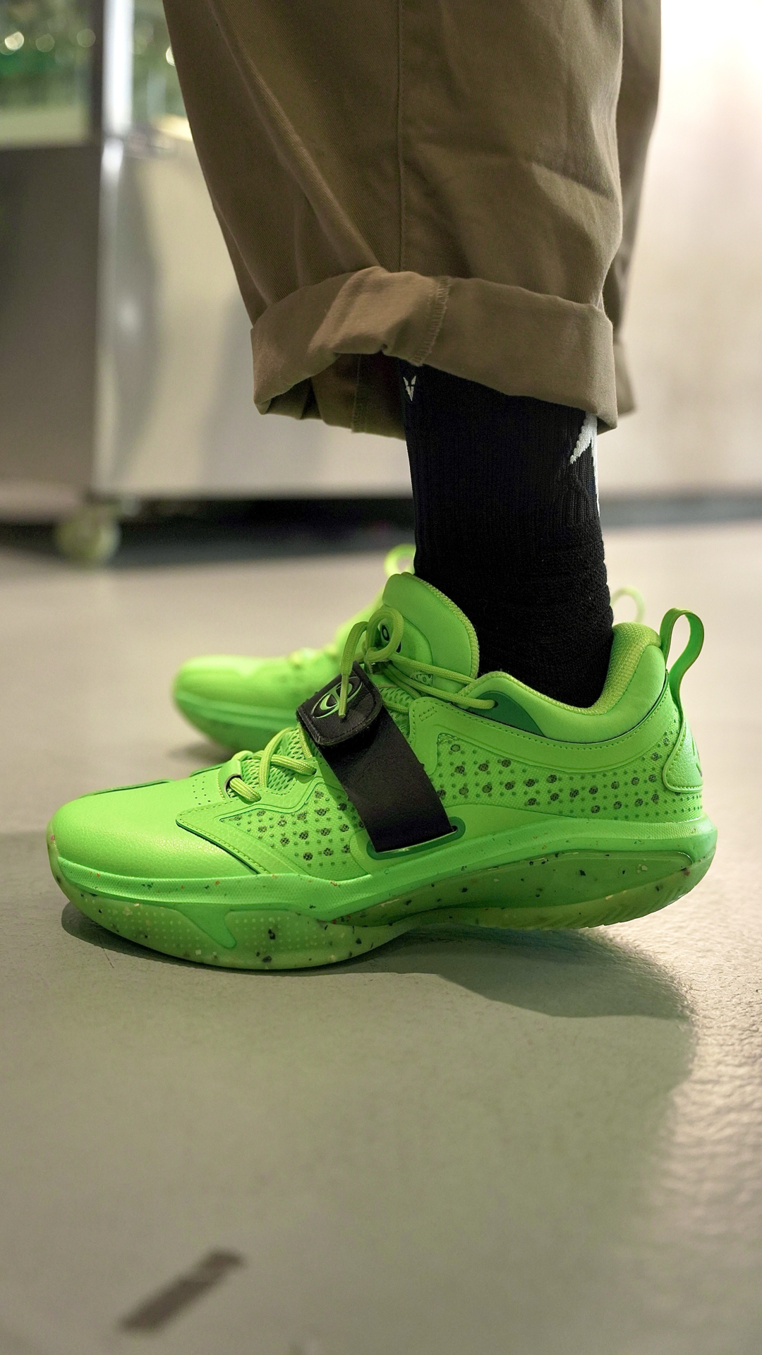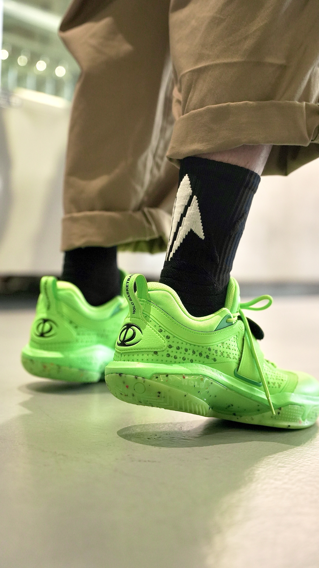这袜子我说百搭应该没有人反对吧 这个离弦造型的后跟真的太绝了! 仿佛就是张弓搭箭射出去的箭矢 穿上后立刻有种向上发射的错觉 并且这款袜子的几个配色都不会出错 黑白色的离弦更是百搭任何球鞋 我特地挑了一双特别冷门的球鞋 你们看下上脚效果~ 颜值到位球袜的性能也没有落下 全掌加压加厚并且搭配防滑纱 即提供了一定的缓震也保证了防滑 踝部和后跟也做了单独的加厚保护 脚背则是另一种透气网纱...