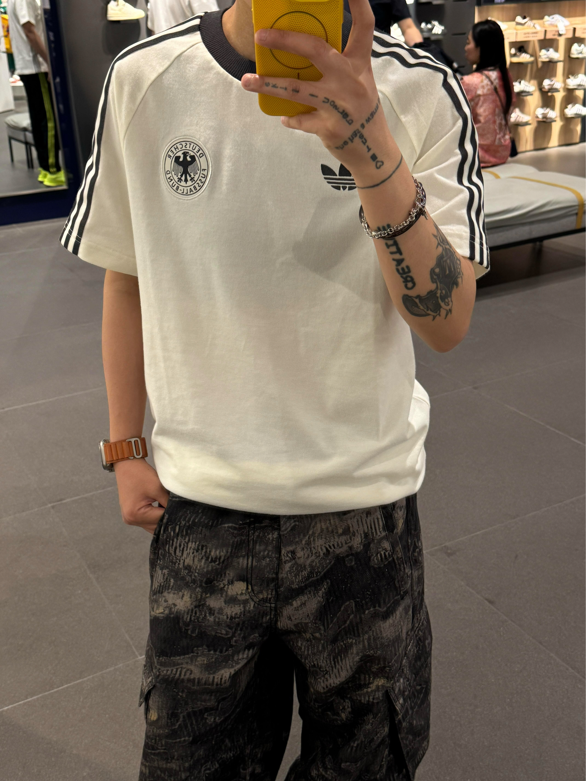三叶草德国队复古球衣|90年代足球魂直接穿身上⚽ 谁懂啊!这件三叶草德国队复古球衣,真的把复古少年感焊死在身上了✨ 米白麂皮绒质感绝了,自带温柔做旧滤镜,高级又耐看 经典三道杠+精致德国队鹰标刺绣,细节拉满不浮夸 一秒梦回90年代绿茵场,复古DNA直接爆冲! 宽松落肩版型超友好,不挑身材、藏肉显瘦还显头小 随便搭工装裤、牛仔裤、休闲裤都超有范儿 韩系街头感、复古运动风轻松拿捏 日常出街、通勤...
