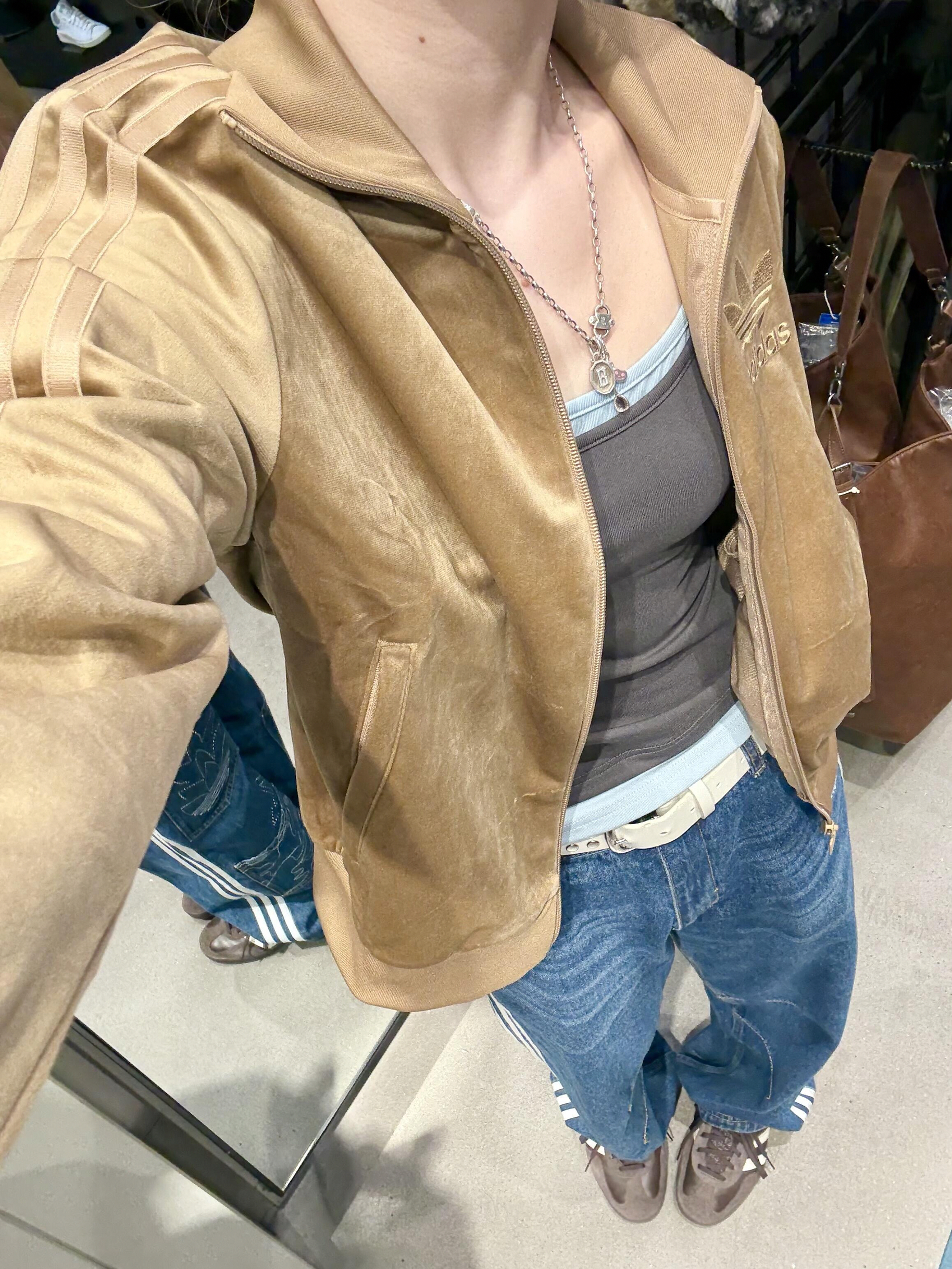 三叶草丝绒外套|甜酷复古穿搭天花板 还没入三叶草外套的姐妹快看过来!🙋🏼♀️ 复古丝绒面料自带高级光泽,金棕配色温柔又巨显白 经典刺绣logo,复古氛围直接拉满✨ 搭配做旧牛仔阔腿裤,宽松版型慵懒又随性 内搭小吊带,轻松打造层次感不臃肿 再叠戴串珠挂饰+金属项链,细节感拉满 甜酷兼并,高级又有辨识度 随便一拍都出片,谁穿谁是时髦精!