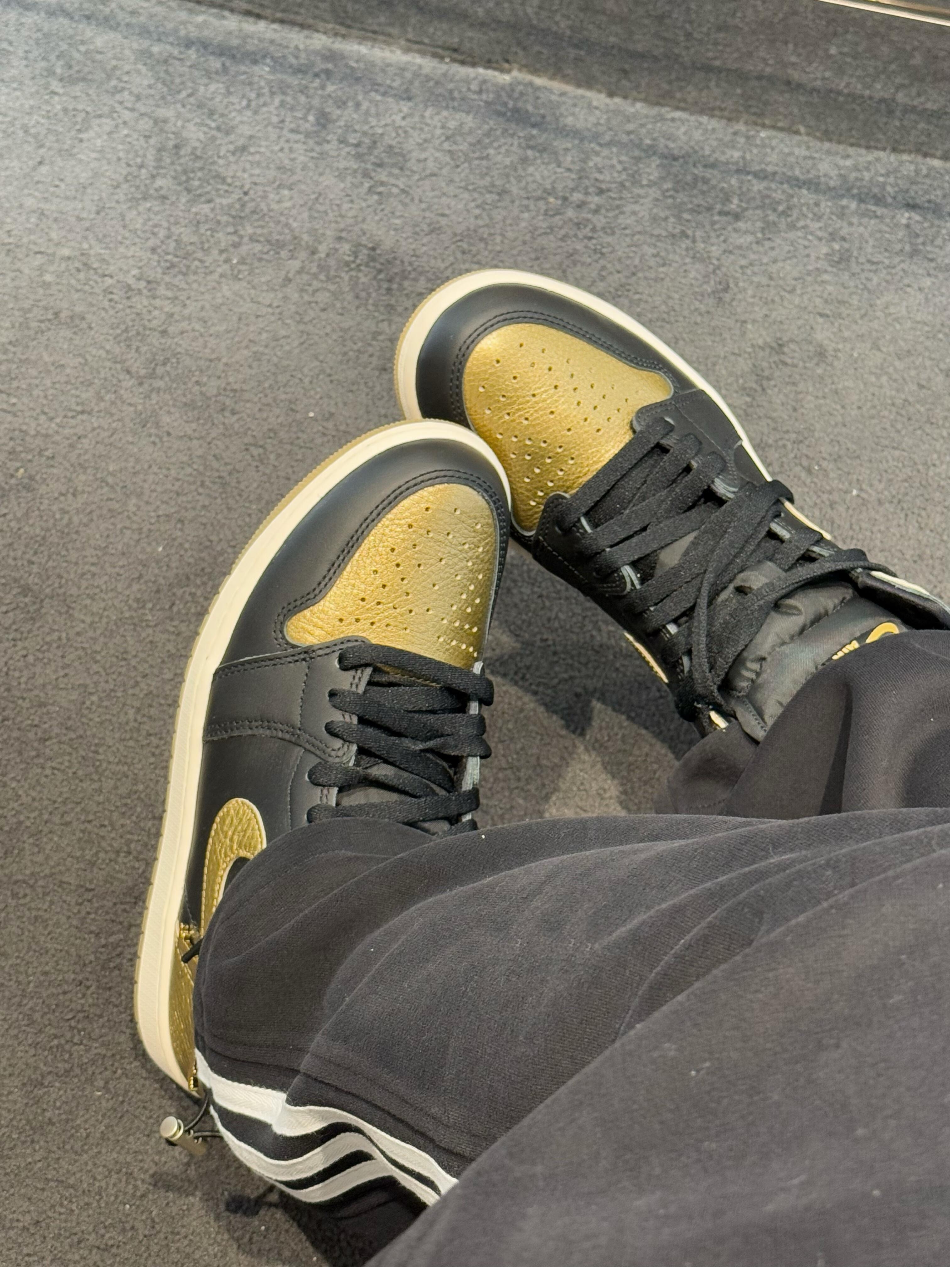 这双黑金AJ1 High真的把“贵气”焊在脚上了! 荔枝纹黑金撞色+飞人吊饰,低调又张扬,上脚直接拉满街头奢华感🖤✨ • 细节拉满:金属飞人吊饰+荔枝纹皮革,质感爆棚,辨识度直接拉满 • 配色高级:黑金撞色经典耐看不挑人,生胶底更添复古氛围 • 百搭属性:配三条杠运动裤、牛仔裤都超和谐,日常出街、通勤、聚会都能穿 • 经典鞋型:AJ1 High标志性鞋型,脚感舒适,久穿不腻,颜值与实用性双...
