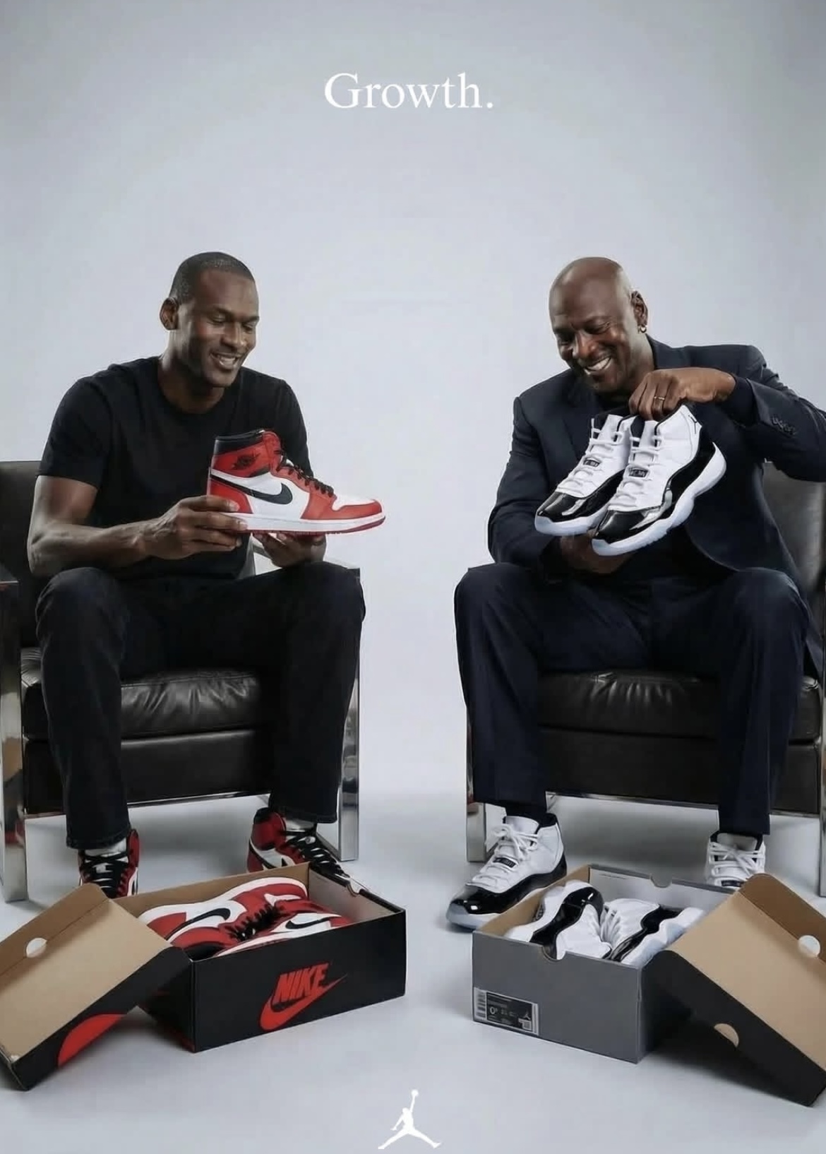 左边是Air Jordan 1「Chicago」,这双鞋定义了篮球鞋文化,是他初入联盟时的锋芒毕露;右边是Air Jordan 11「Concord」,是他第二次复出时的王者归来,漆皮与黑白配色至今仍是经典。