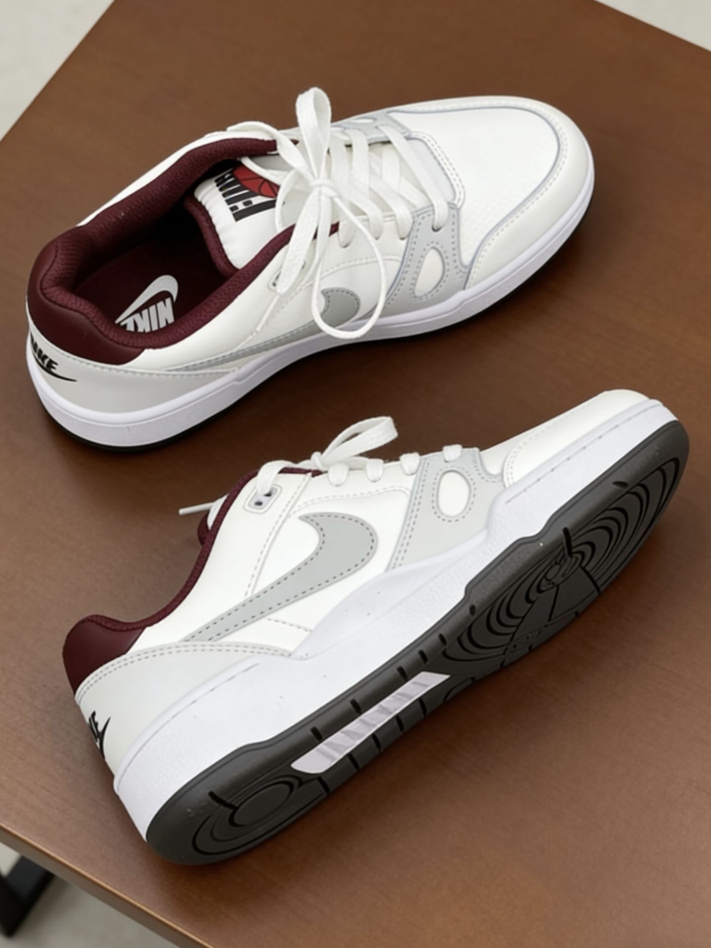 这双白红灰拼色板鞋,是复古风穿搭的好选择。米白主调搭配酒红内衬、浅灰 swoosh,撞色设计不张扬,复古感拉满,搭牛仔裤、休闲裤、运动装都很适配,日常通勤、出街都合适。 皮质鞋面质感在线,鞋型宽松不挤脚,上脚不磨脚,厚底设计悄悄增高还不笨重,走路脚感稳。