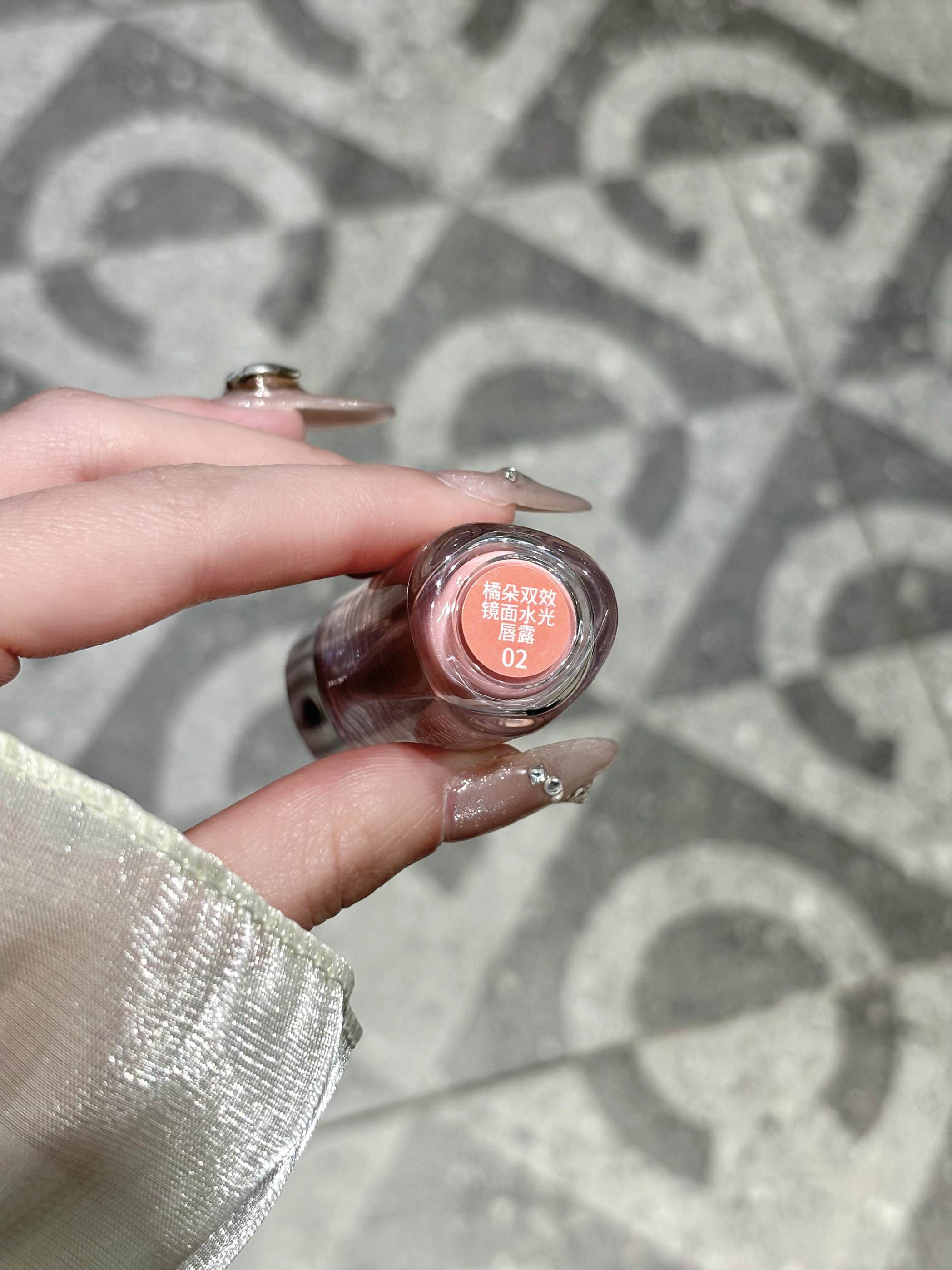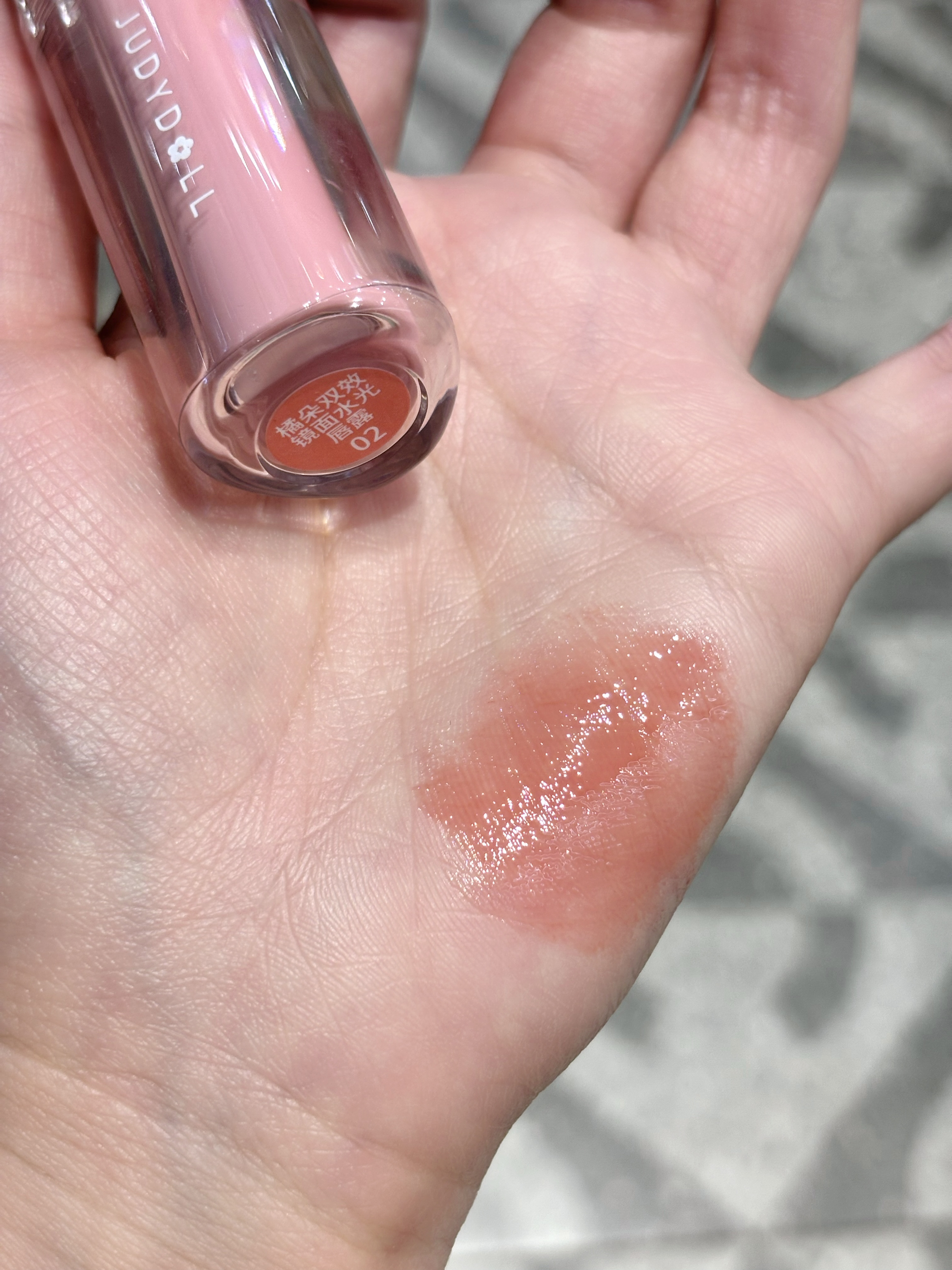 橘朵的冰熨斗已经出2.0了 它比第一代的刷头多了一个植绒面 一面还是金属冰熨斗头 另一个是普通绒面刷头 这样涂抹就方便多了 而且这两种头刷出来的效果还不太一样 我觉得冰熨斗头刷出来的水光感更强 绒面刷出来的更贴和唇部一些 我这个色号是02爆甜草莓 颜色就是粉橘色调的草莓色 颜色很甜不挑肤色 这个颜色黄皮也能驾驭 质地润润的上嘴很舒服 玻璃唇的镜面感也挺持久的! 性价比高 总体来说值得推荐