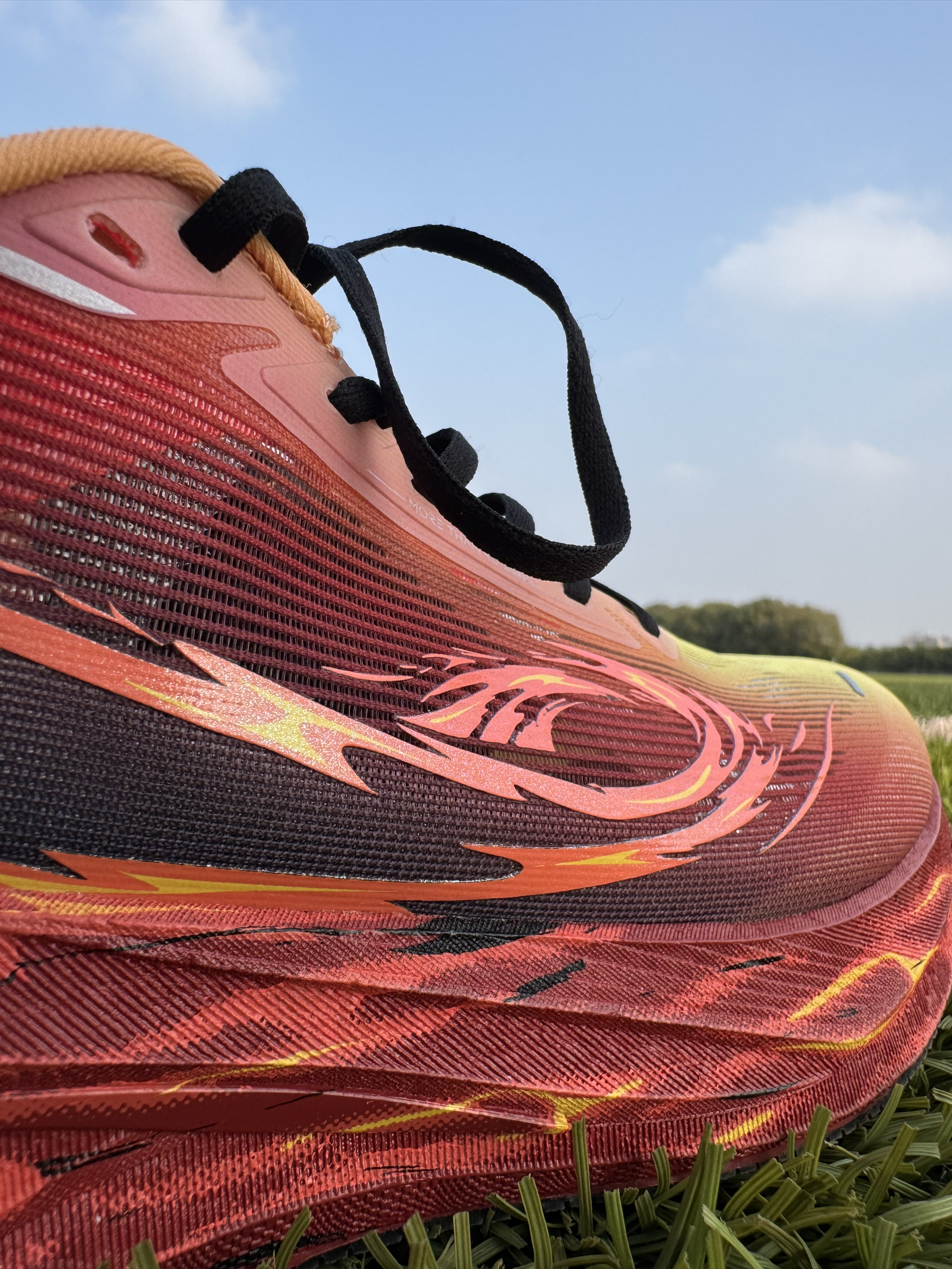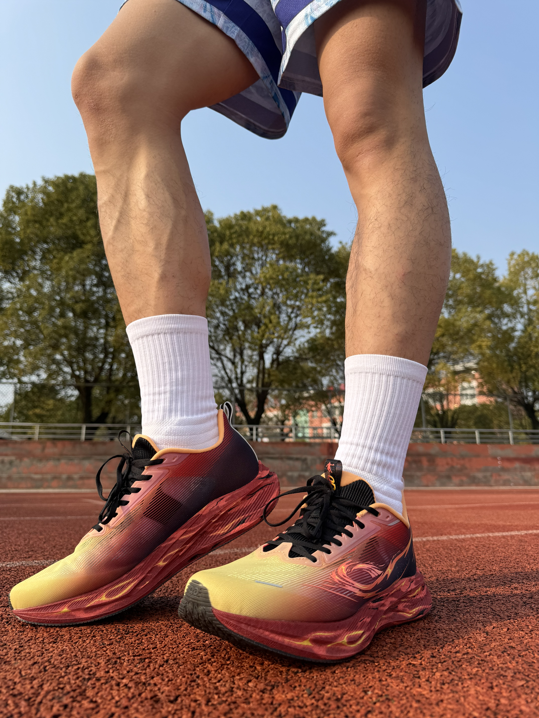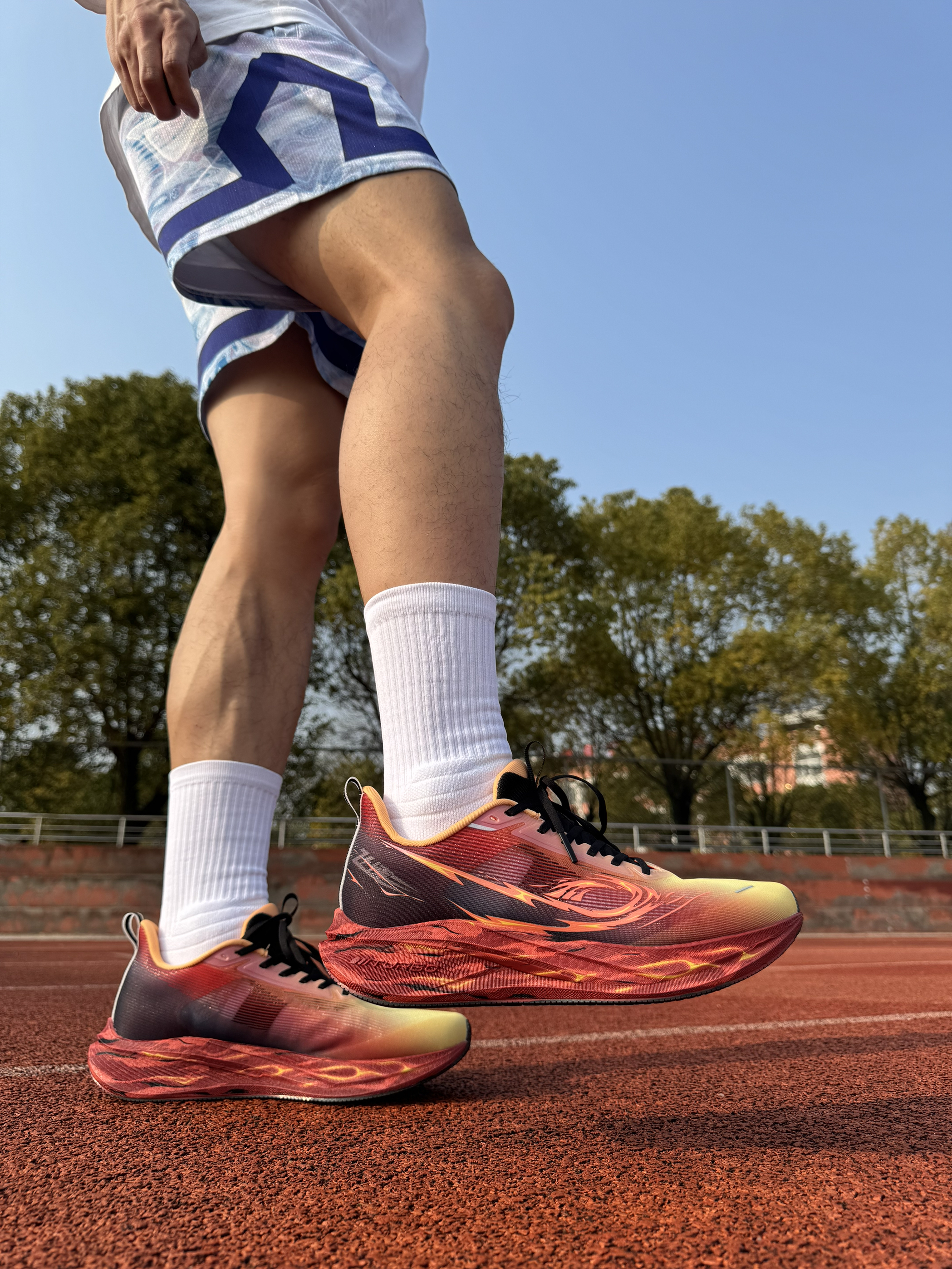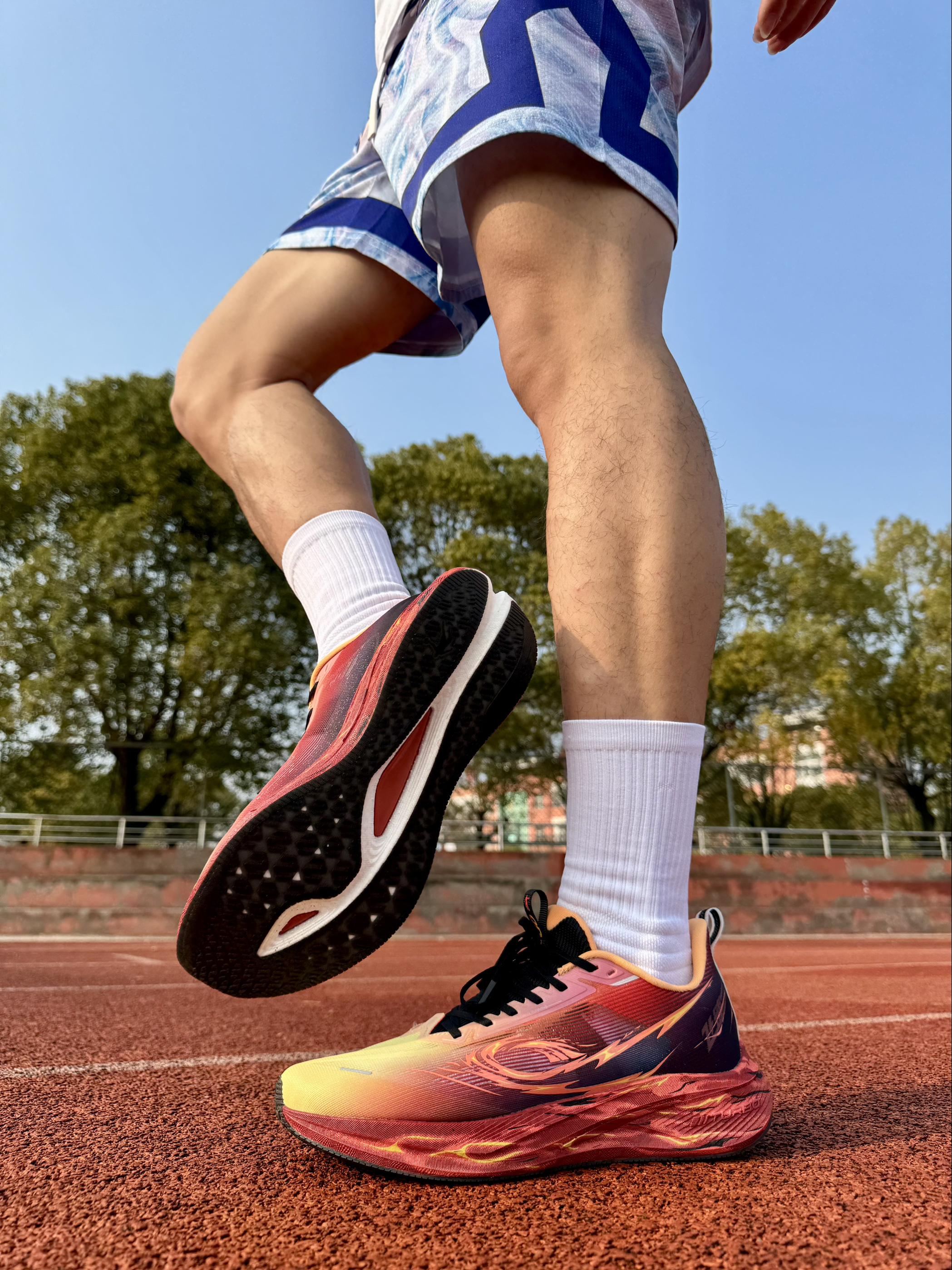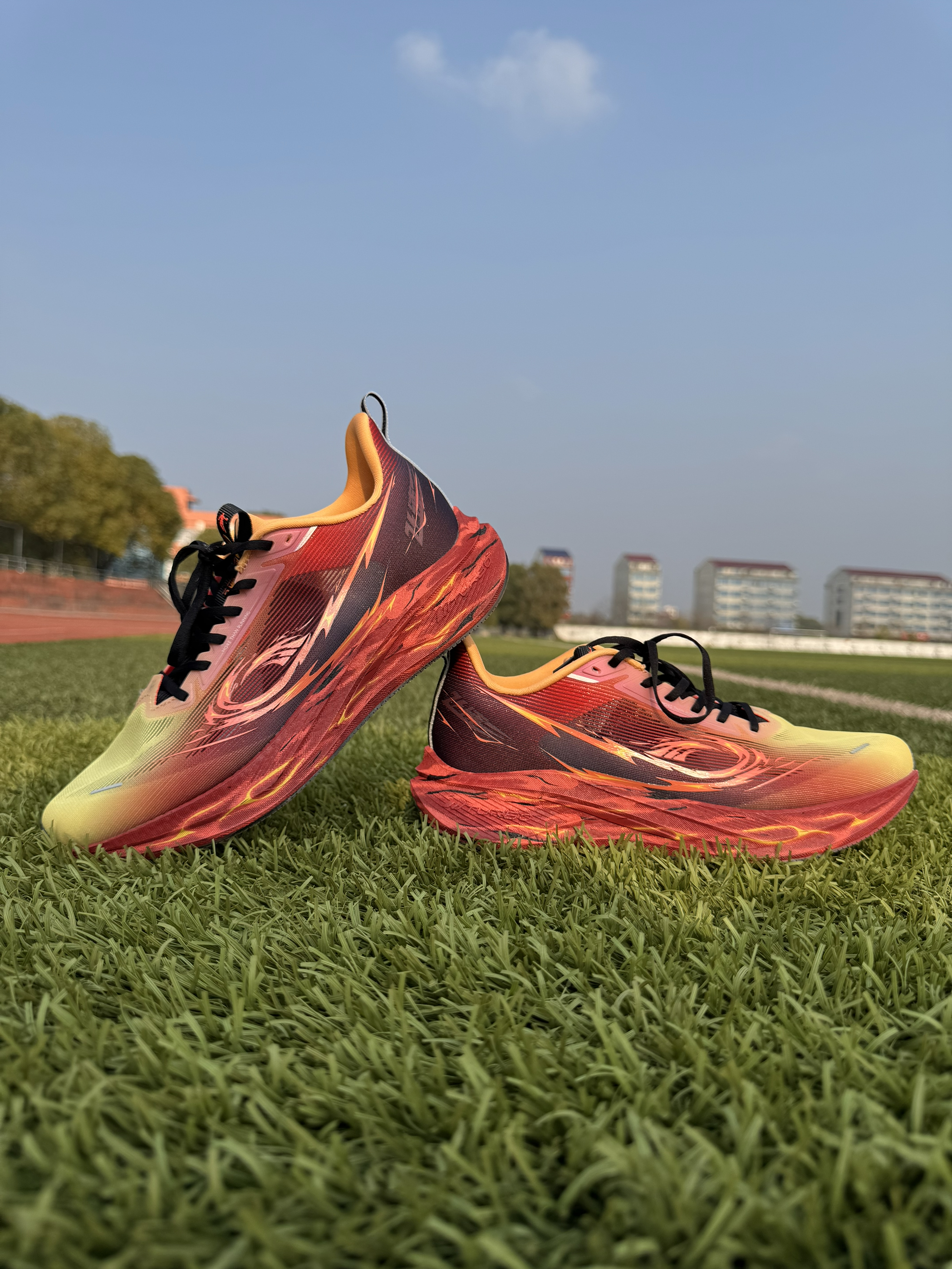 暖黄→赤红→深紫火焰渐变,上脚自带风火轮气场,田径场回头率拉满。全掌巭Turbo中底回弹猛,半掌三叉戟推进板蹬地有劲,提速超顺。233g轻量化+提花鞋面透气不闷,CPU大底耐磨抓地稳。体考、训练、通勤全能打,颜值性能双在线,学生党闭眼冲!