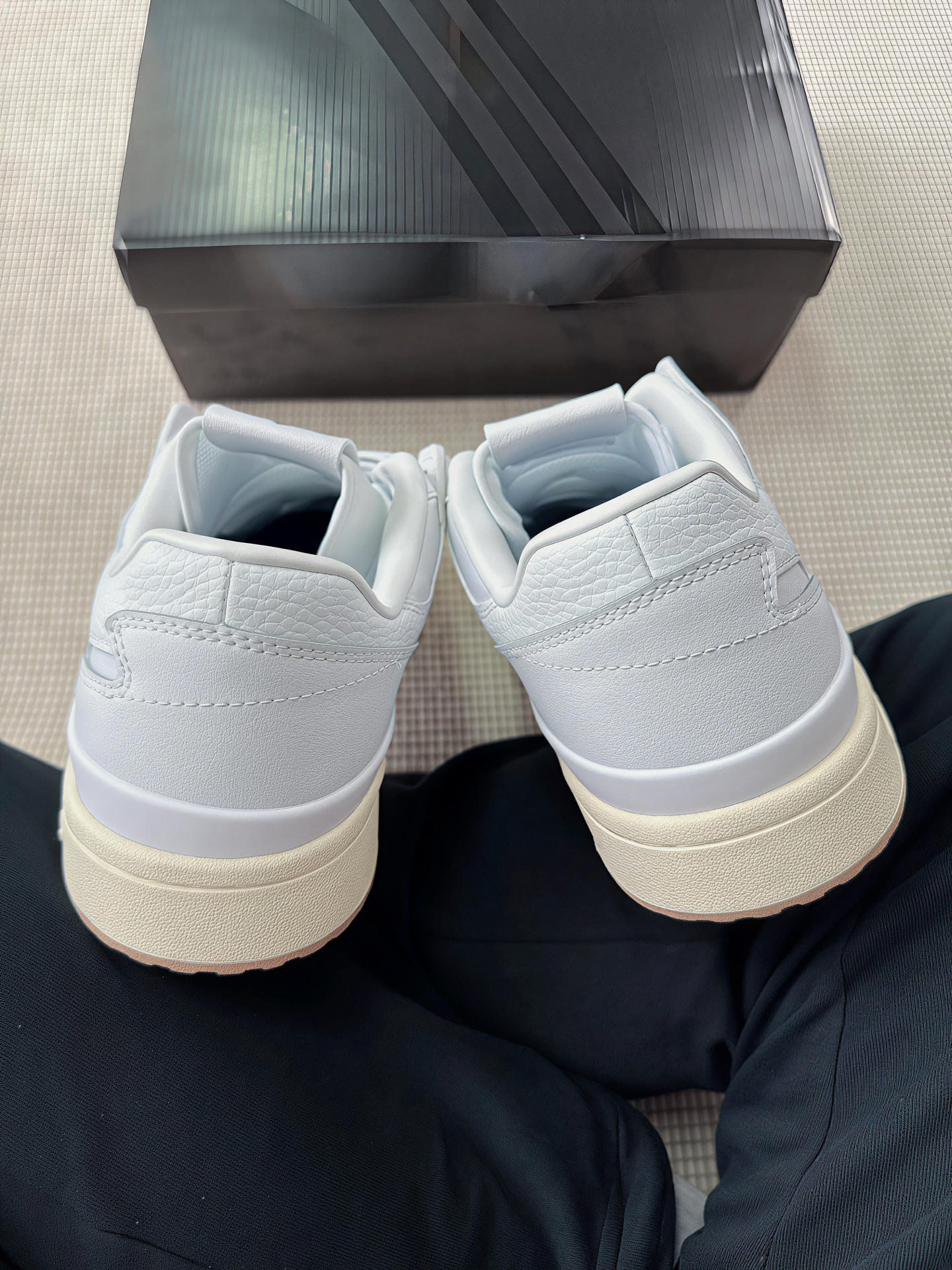 这双阿迪板鞋真的越穿越有味道,整体是皮革的材质,质感满满,不容易皱,后跟还做了鳄鱼纹拼接,细节很有层次。侧边蓝色logo点缀得很好看,阿迪达斯一惯的配色经典耐看,搭配生胶大底复古感直接拉满,底也很厚实,走路很稳。 上脚很舒服不硬,日常通勤完全无压力。唯一劝退的就是价格涨得太猛,真心建议喜欢的先收藏想要,等降价再入手,不建议高位接盘。