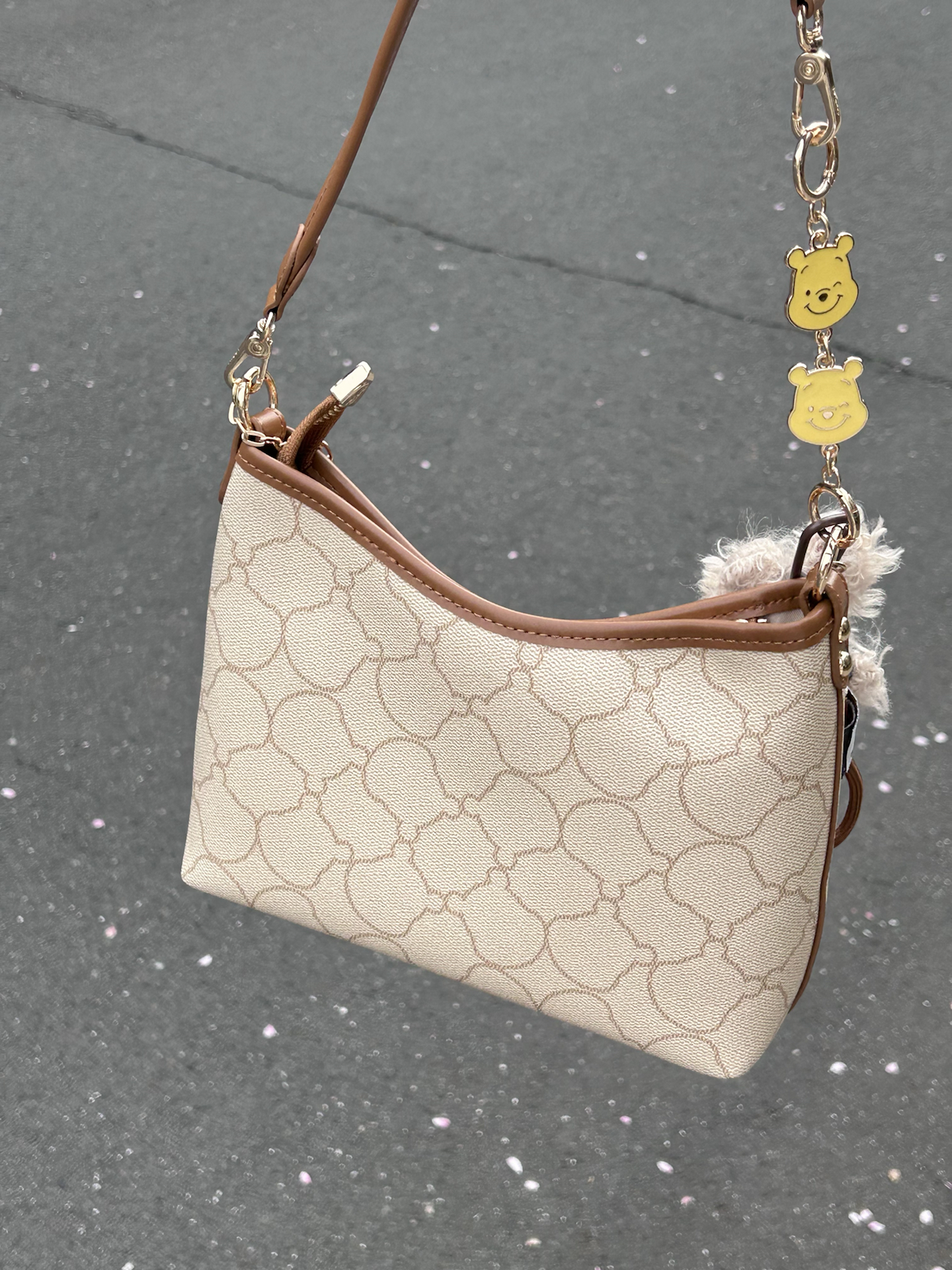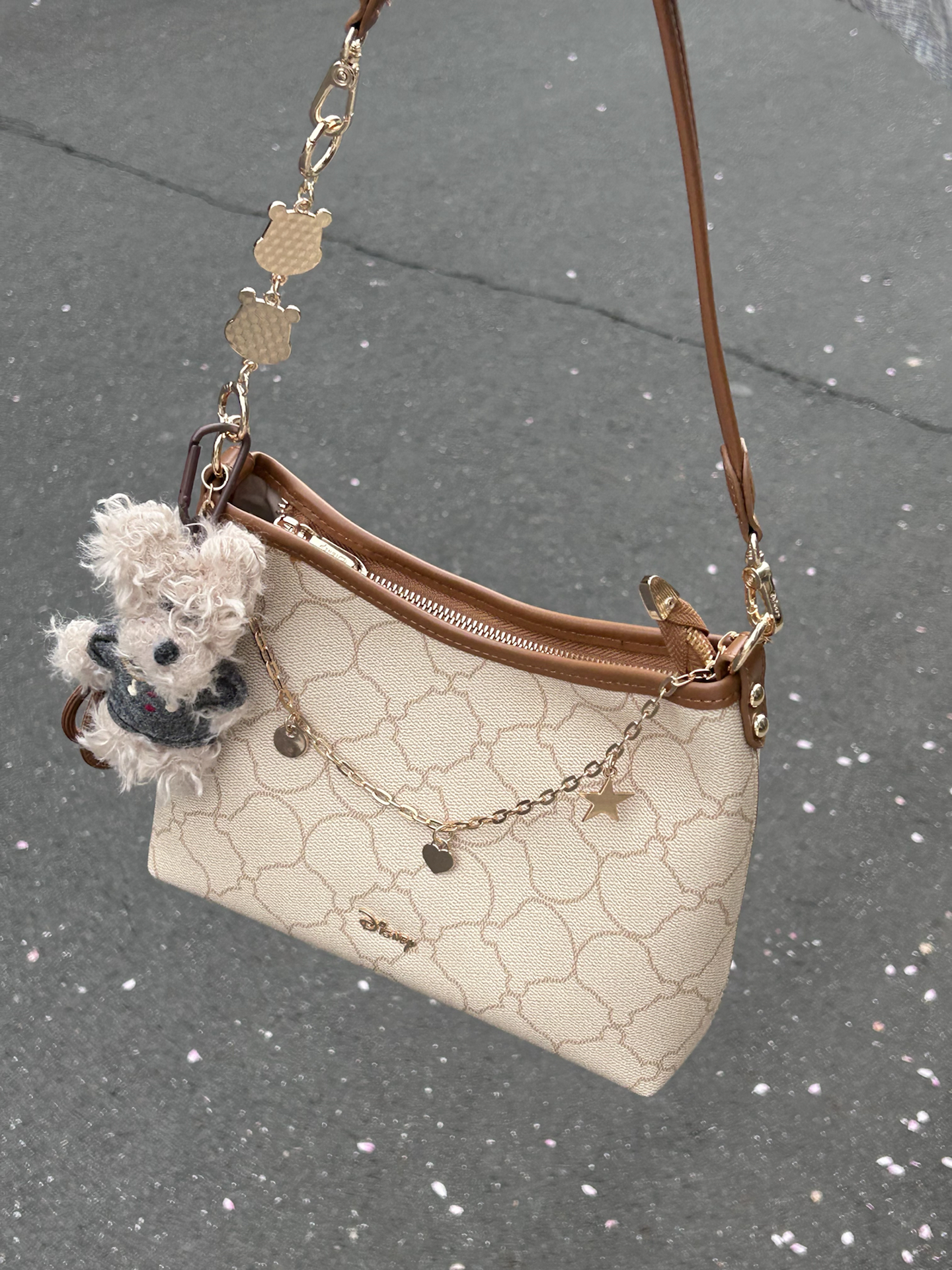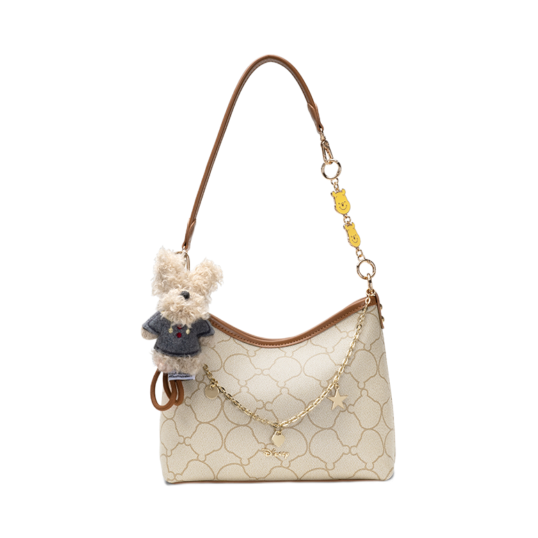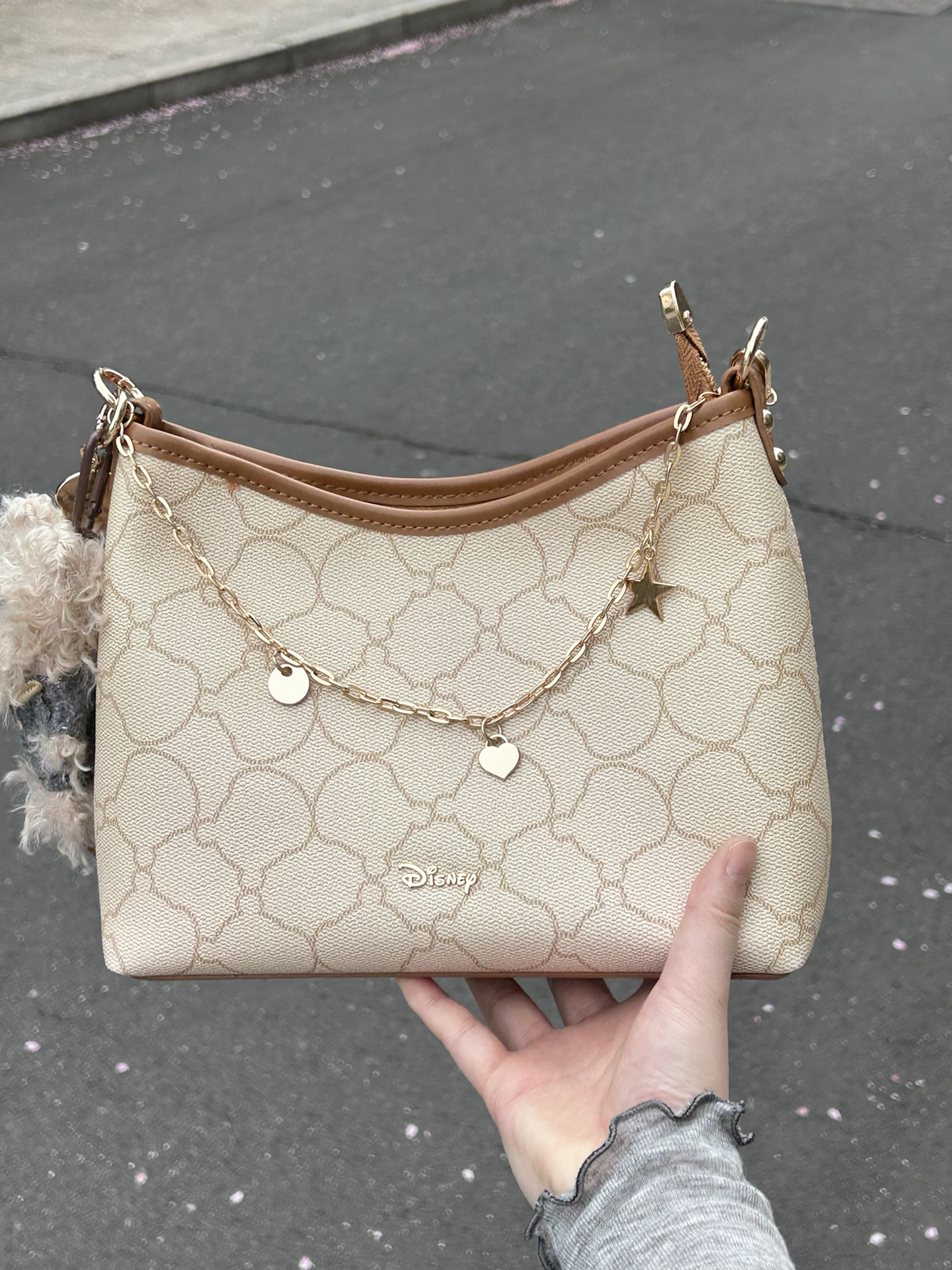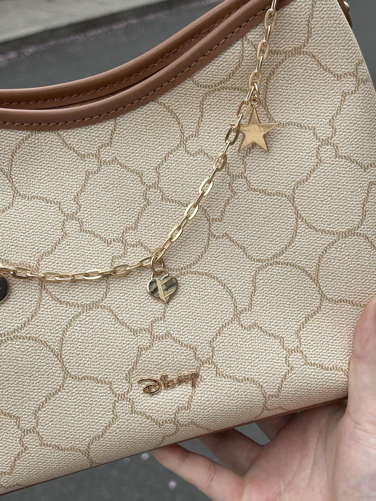 被这个迪士尼联名腋下包一眼戳中 米白老花搭配棕调包边 复古感还蛮好的 自带星星爱心链条和小熊挂饰 里面容量我觉得蛮大的 日常通勤装得下手机和杂物 肩带长度合适手提斜挎好好看 是我最近出门的好搭子没错啦