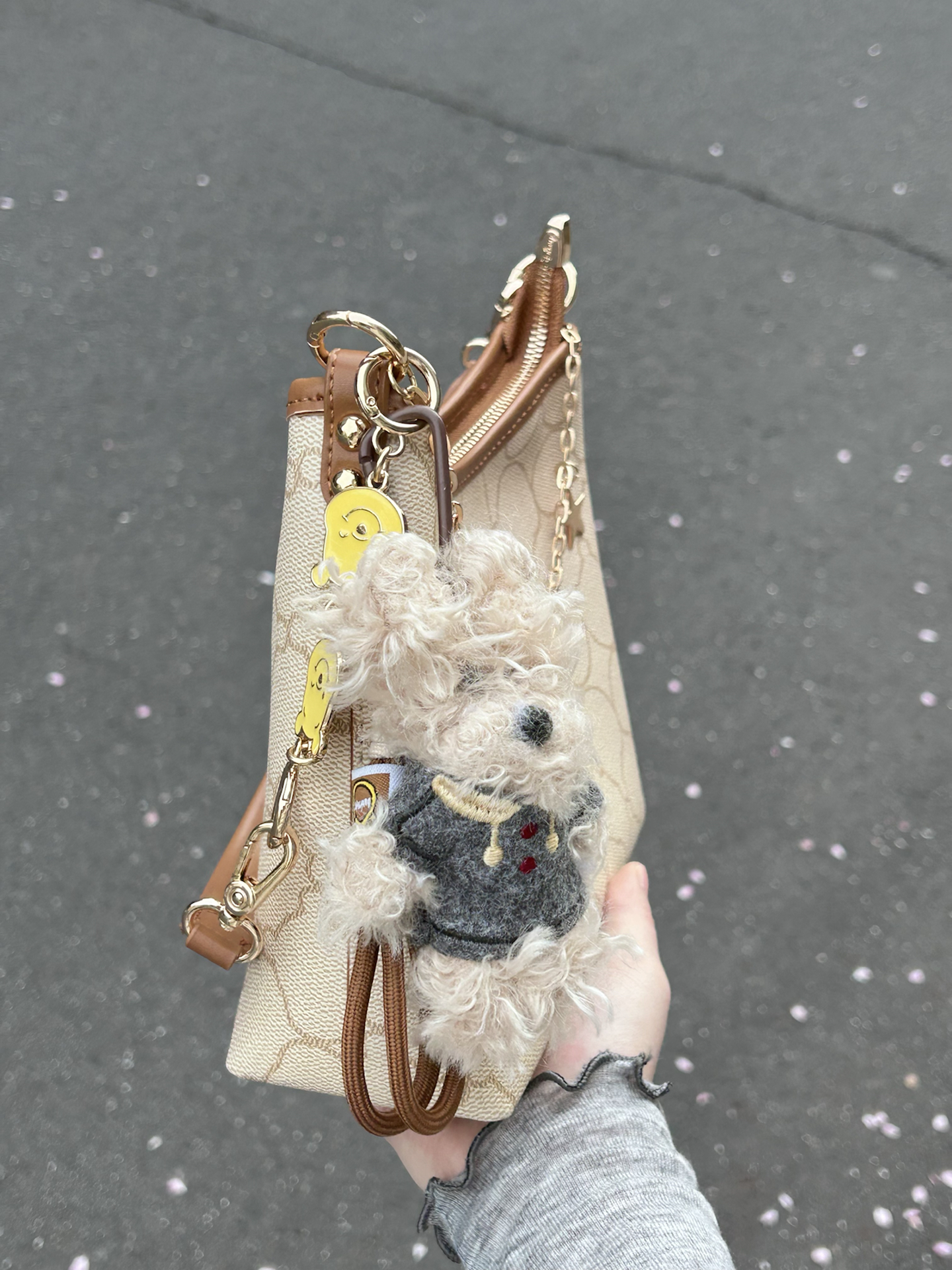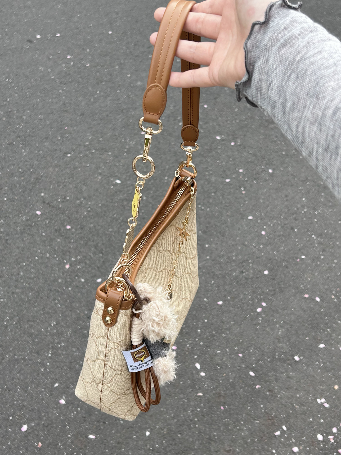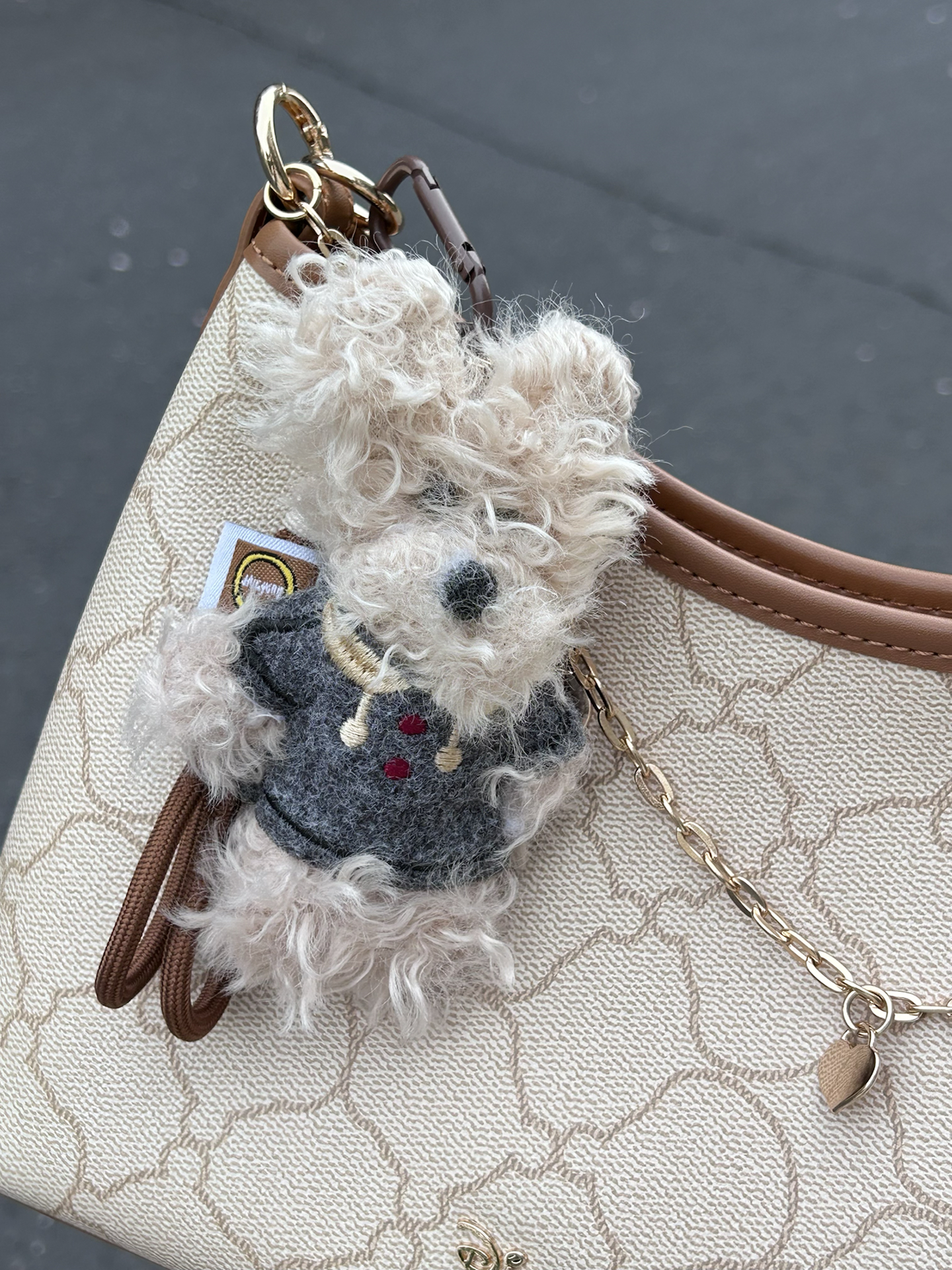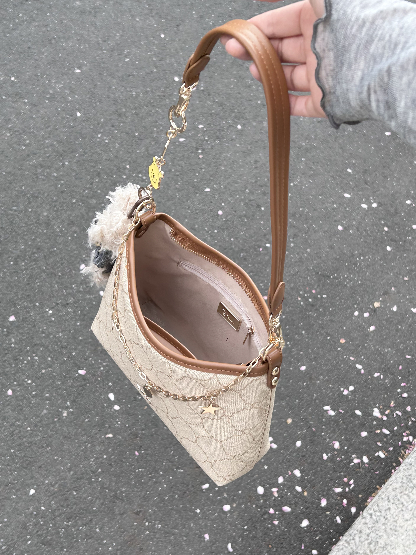 被这个迪士尼联名腋下包一眼戳中 米白老花搭配棕调包边 复古感还蛮好的 自带星星爱心链条和小熊挂饰 里面容量我觉得蛮大的 日常通勤装得下手机和杂物 肩带长度合适手提斜挎好好看 是我最近出门的好搭子没错啦