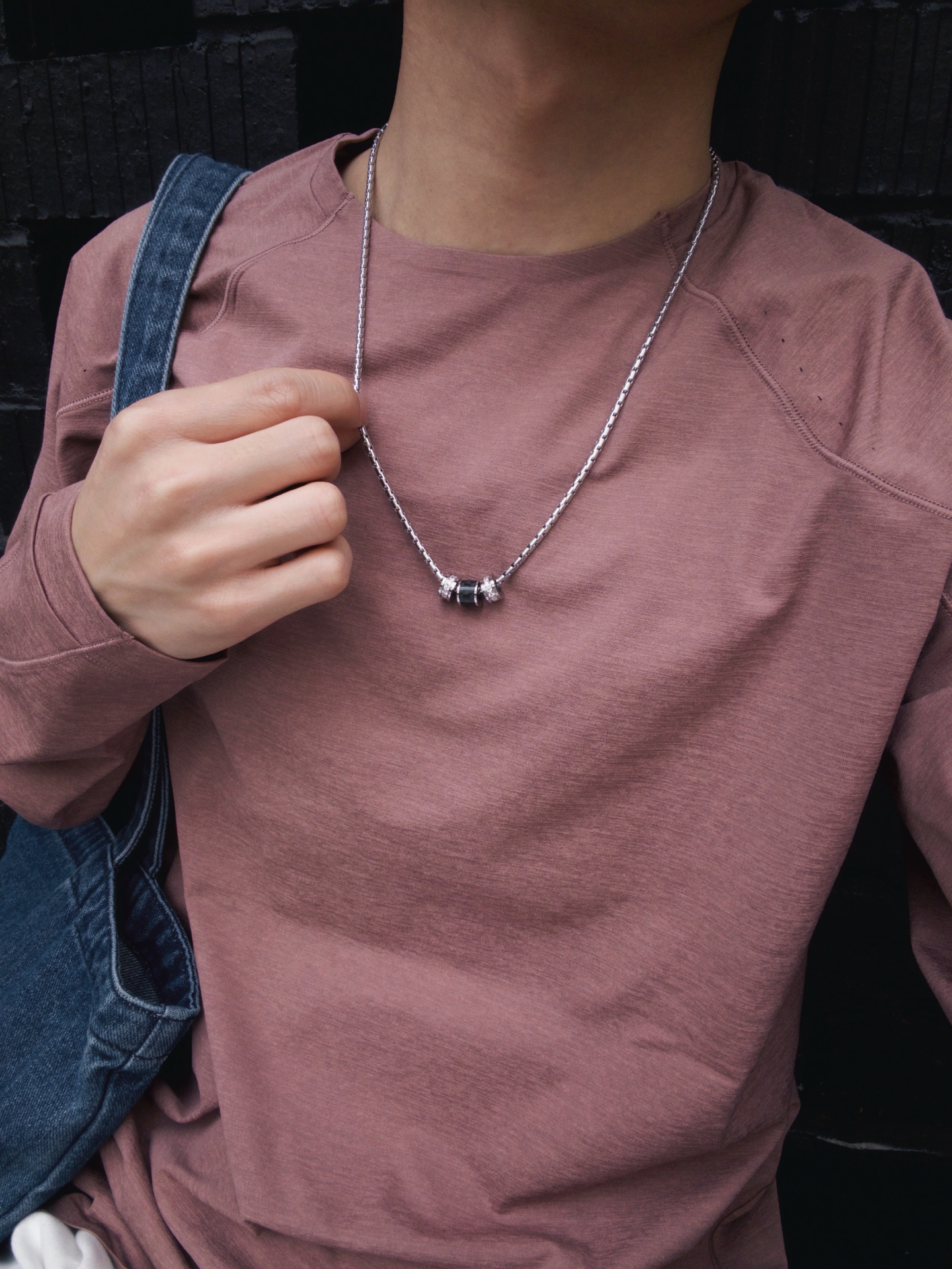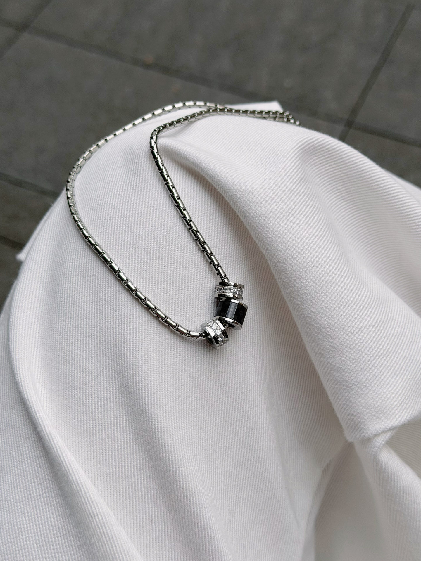 极简穿搭的灵魂配饰💡 一直觉得男生穿搭不用太复杂 一件基础款长袖+一条好看的项链就够了 这条银链真的戳我! 链条光泽感超棒,摸起来顺滑不刮肤 黑钻吊坠很有质感,低调不浮夸 搭浅色系衣服瞬间提升精致度 日常出门随手一戴,轻松拿捏氛围感~