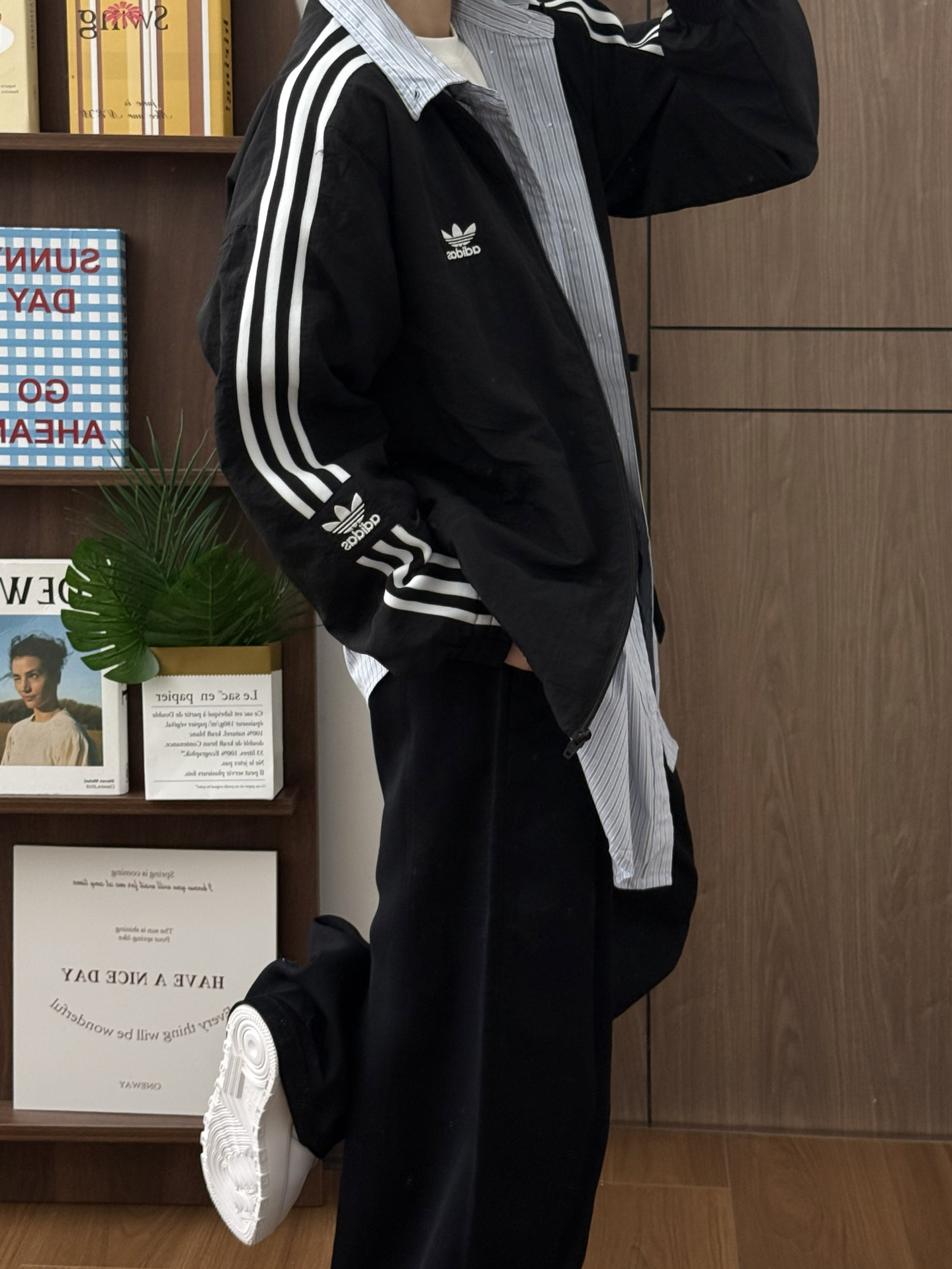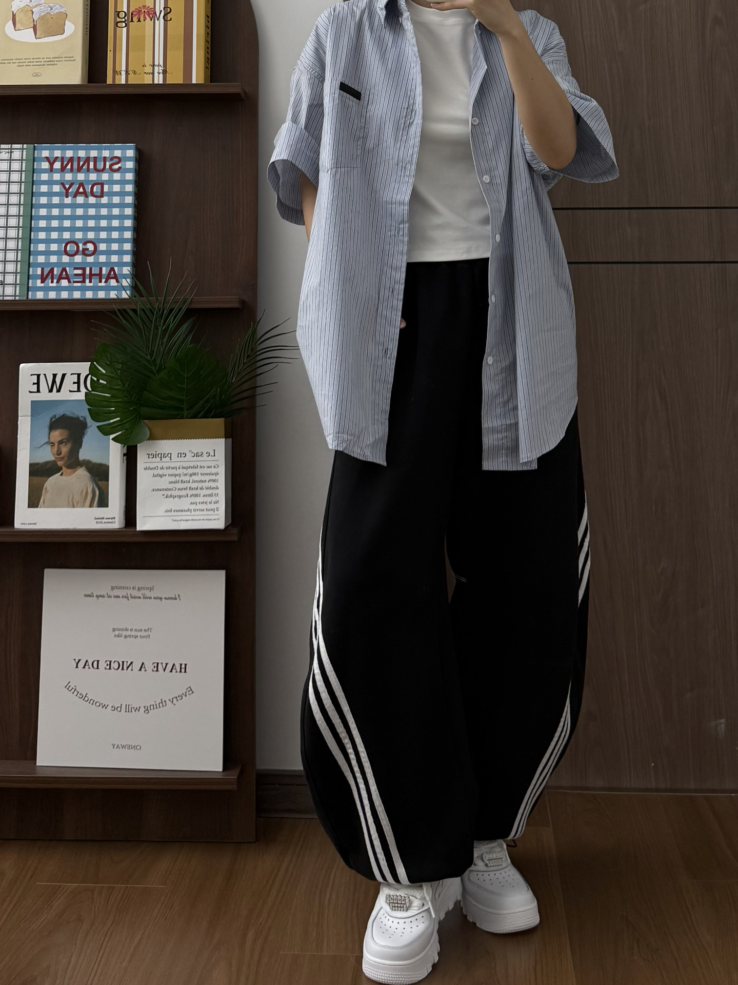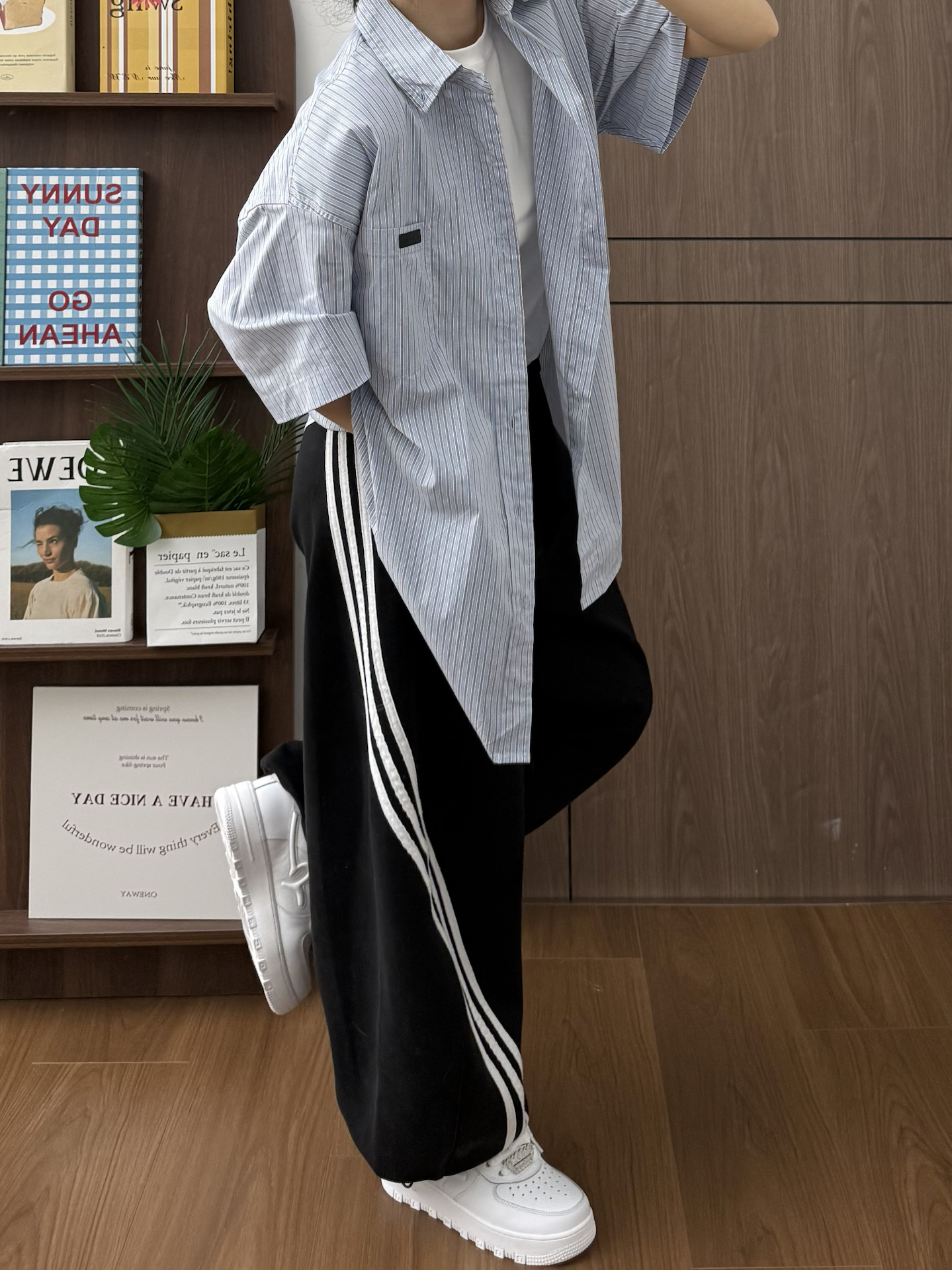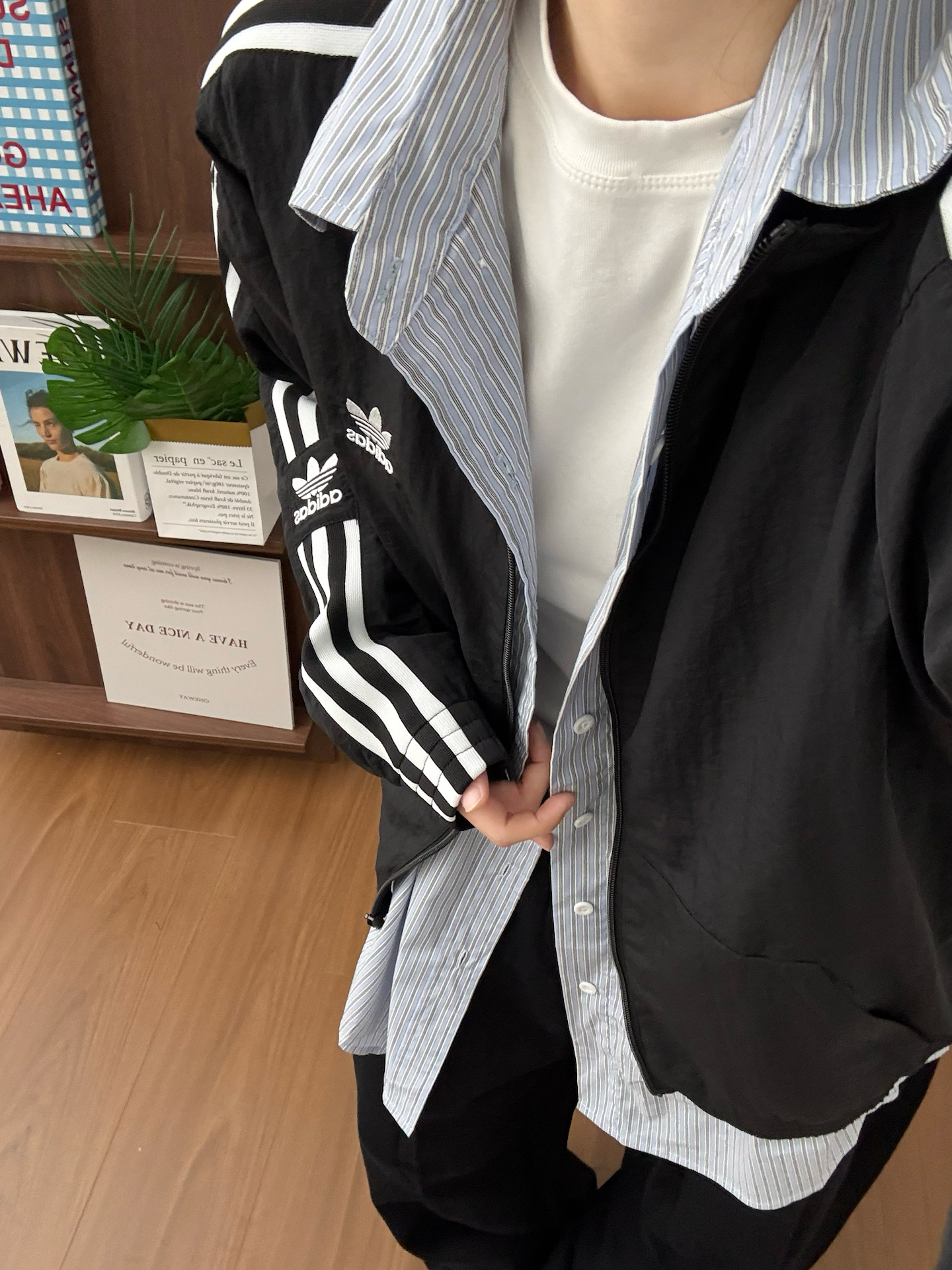 黑白阿迪+蓝白衬衫+黑色西装裤 一整个韩系松弛感 好喜欢今天一套Look 面料都是很亲肤的那种 本人160/49 穿m码感觉正好