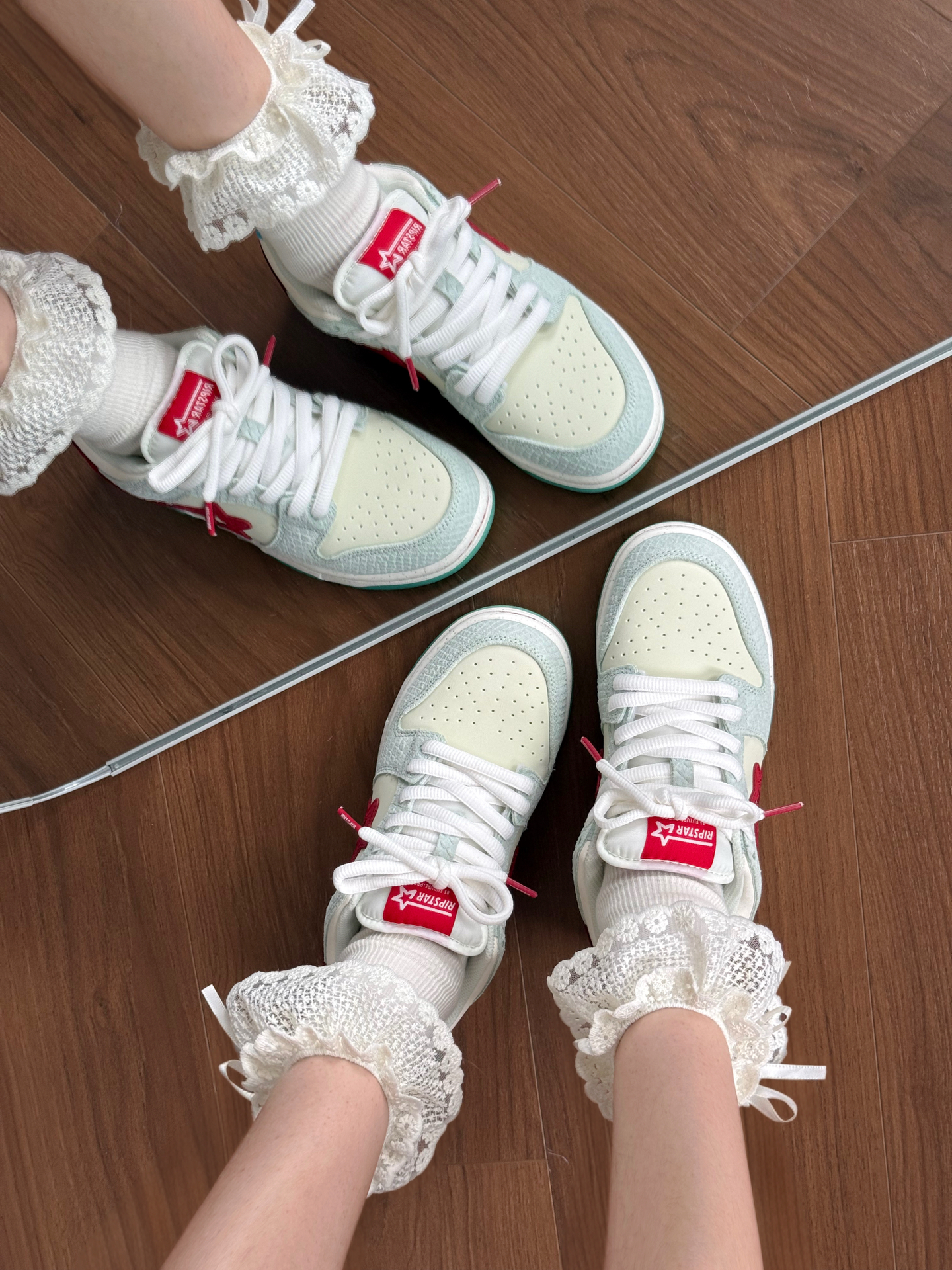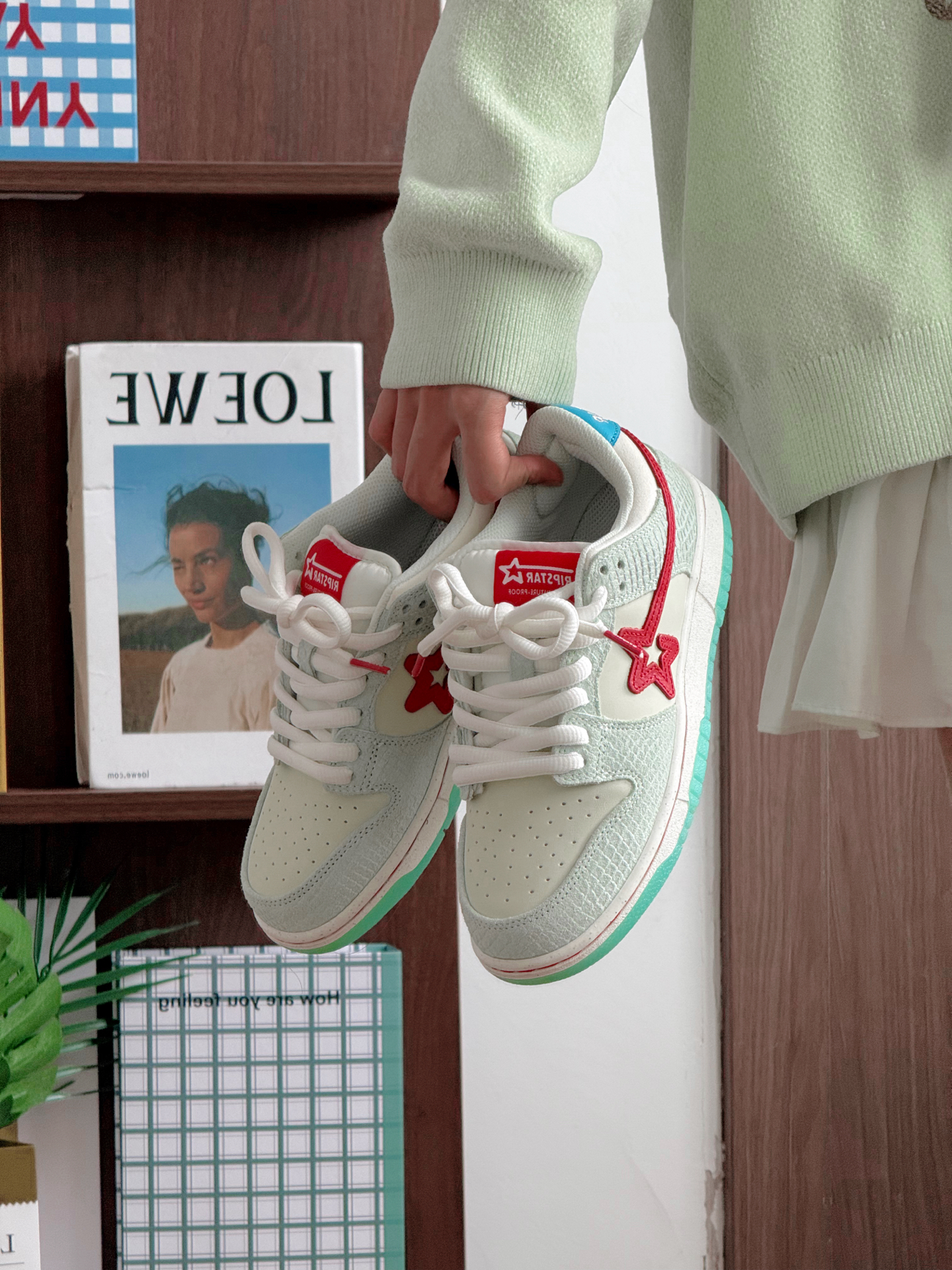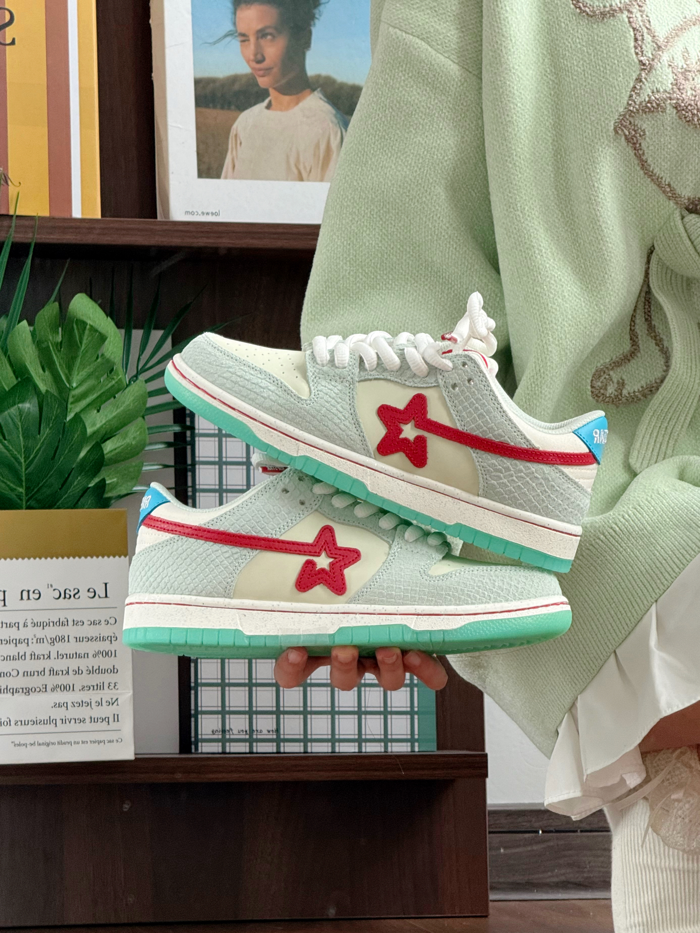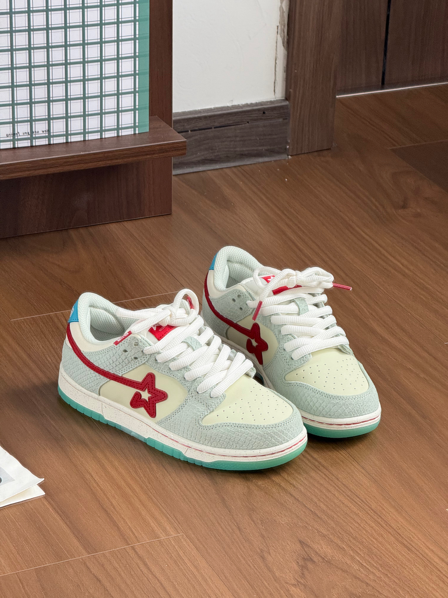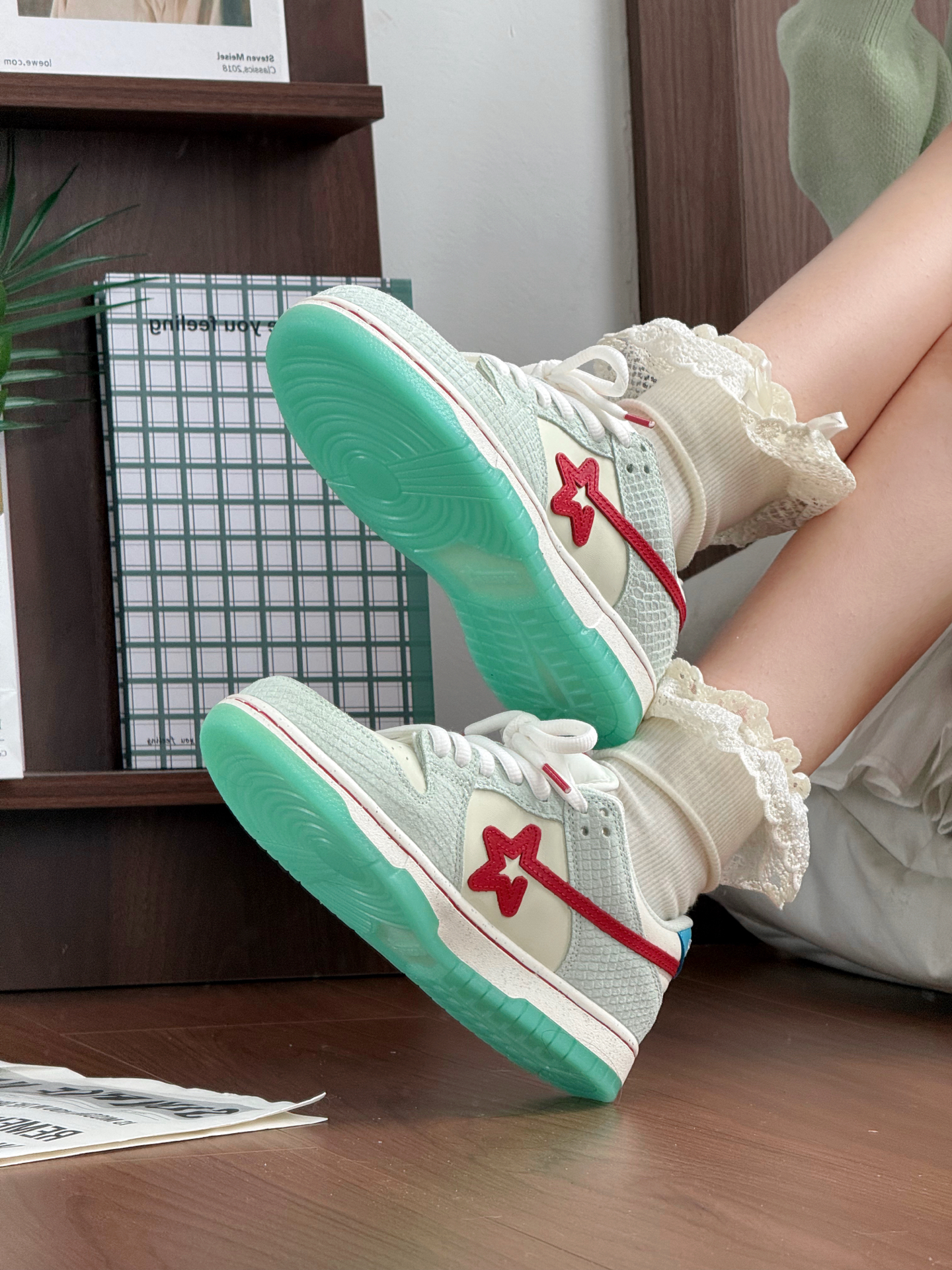 好清新的绿色板鞋! 这种颜色适合春天也适合夏天 而且蛇塑鳞甲设计好酷 侧边星星设计增加了不少街头氛围感 可甜可酷可塑性高 上脚抓地力强!鞋码✅没有什么偏差 赛车鞋
