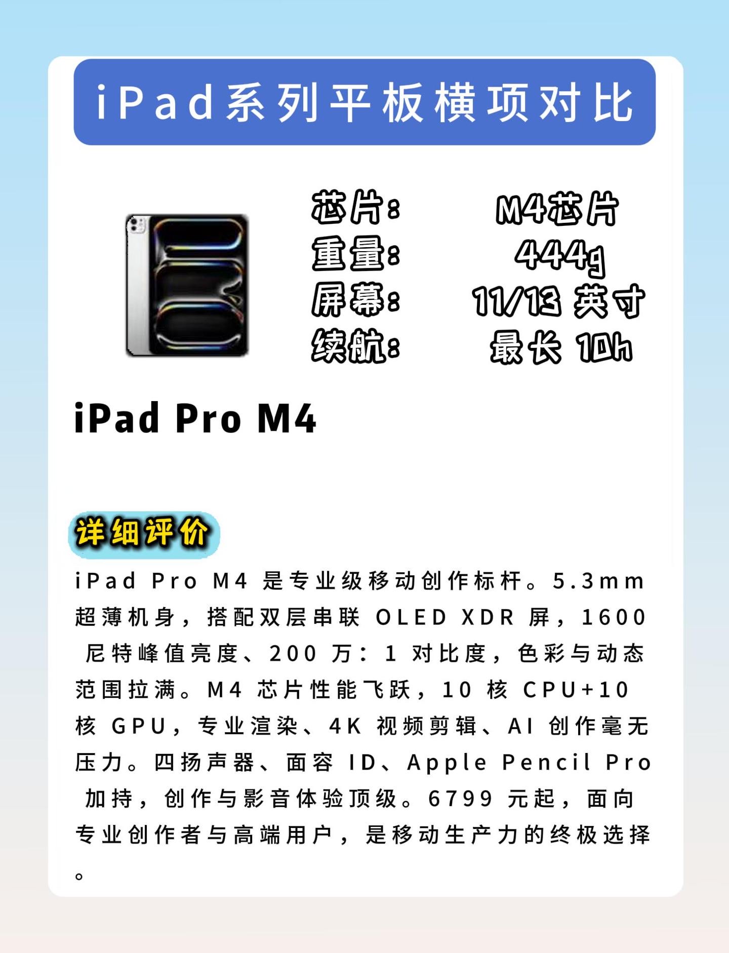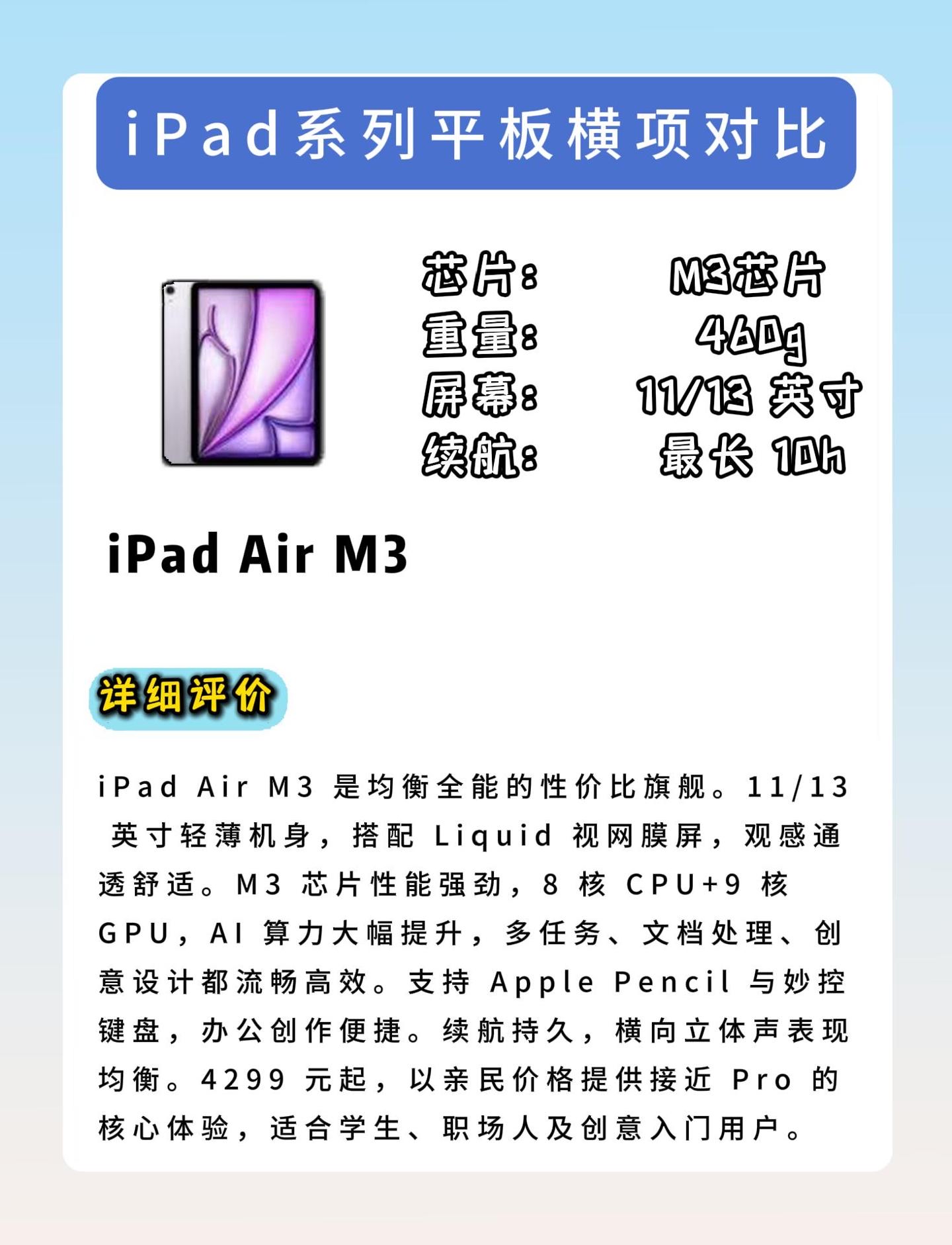 iPad Air M4、iPad Air M3、iPad Pro M4三款机型同台登场,覆盖从性价比到专业创作的全需求,把平板生产力体验卷到了新高度。不管你是预算有限的学生党、追求均衡实用的办公党,还是痴迷专业创作的设计师、剪辑师,这三款里总有一款能精准戳中你的需求点。 三款机型各有侧重,没有绝对的好坏,只看适配度。iPad Air M3堪称“性价比均衡王”,搭载M3芯片,8核CPU+9核G...