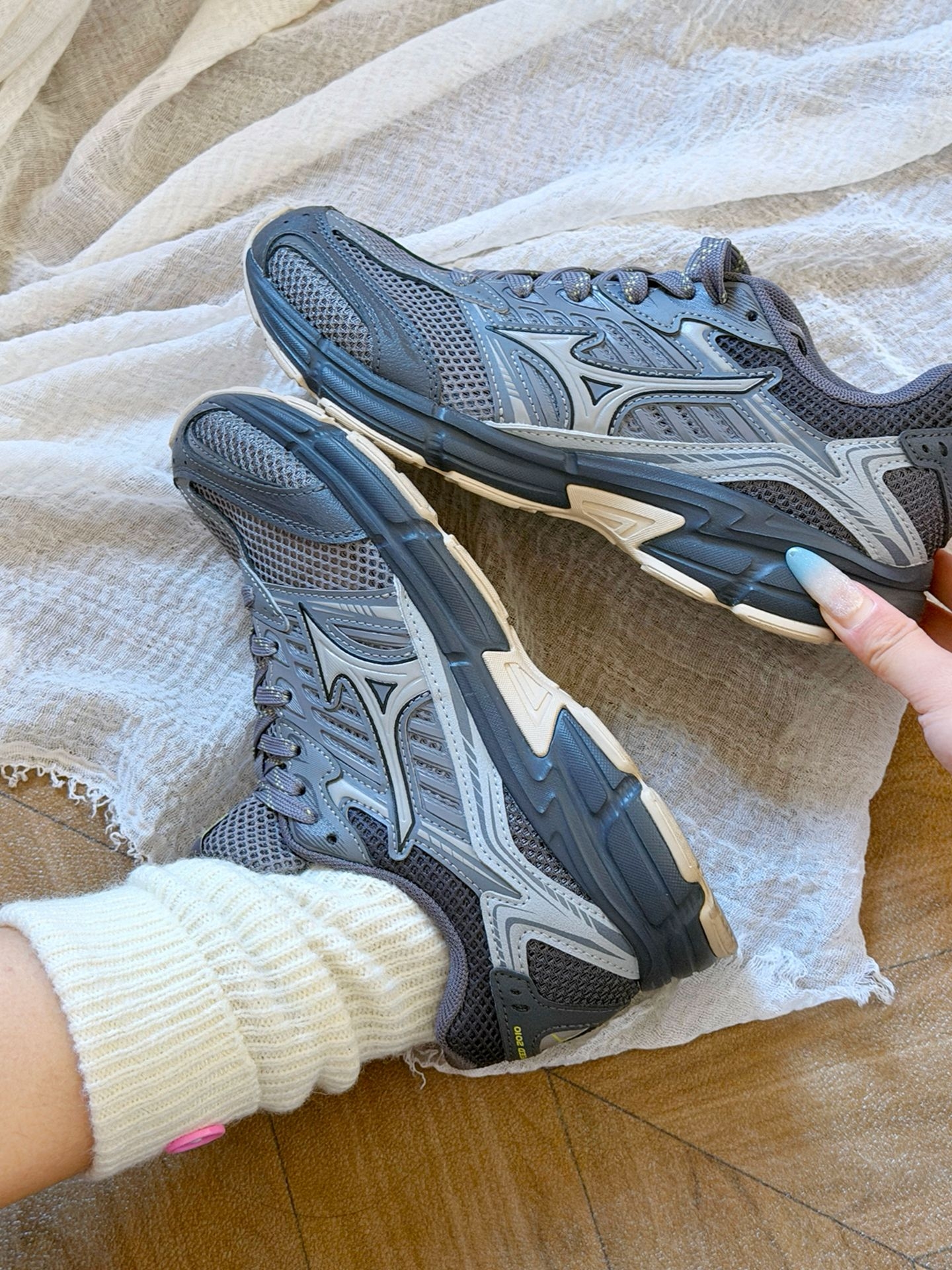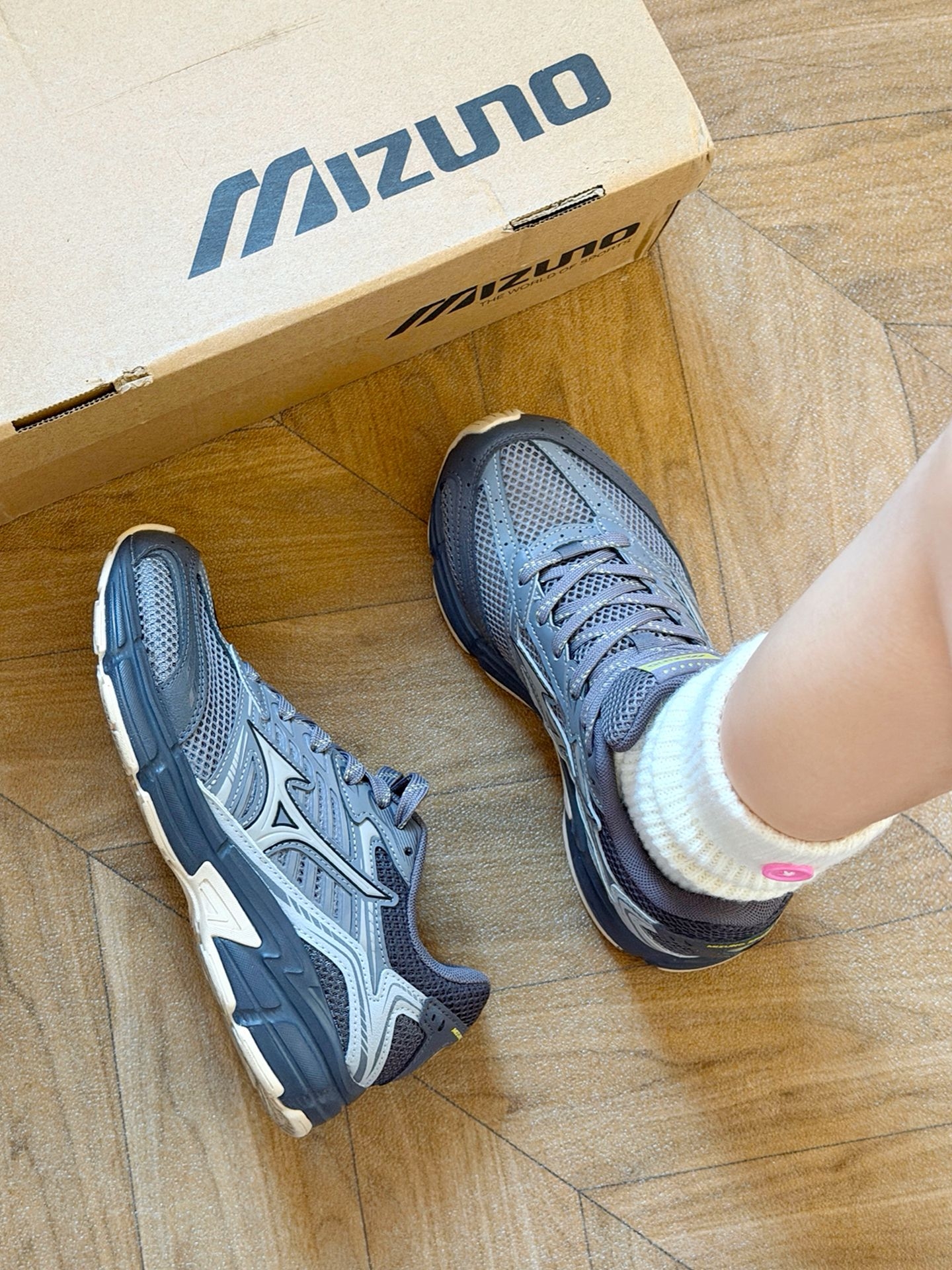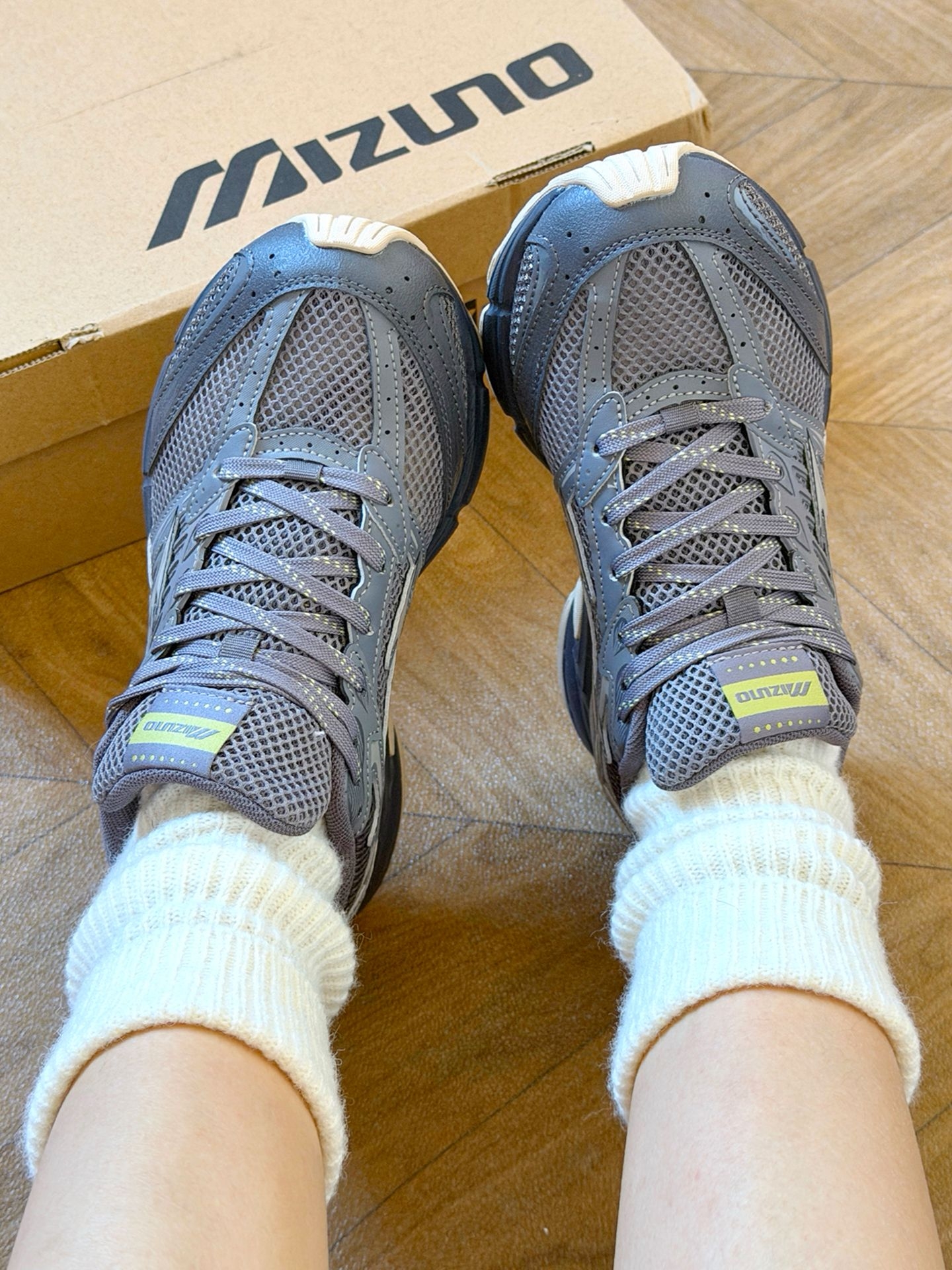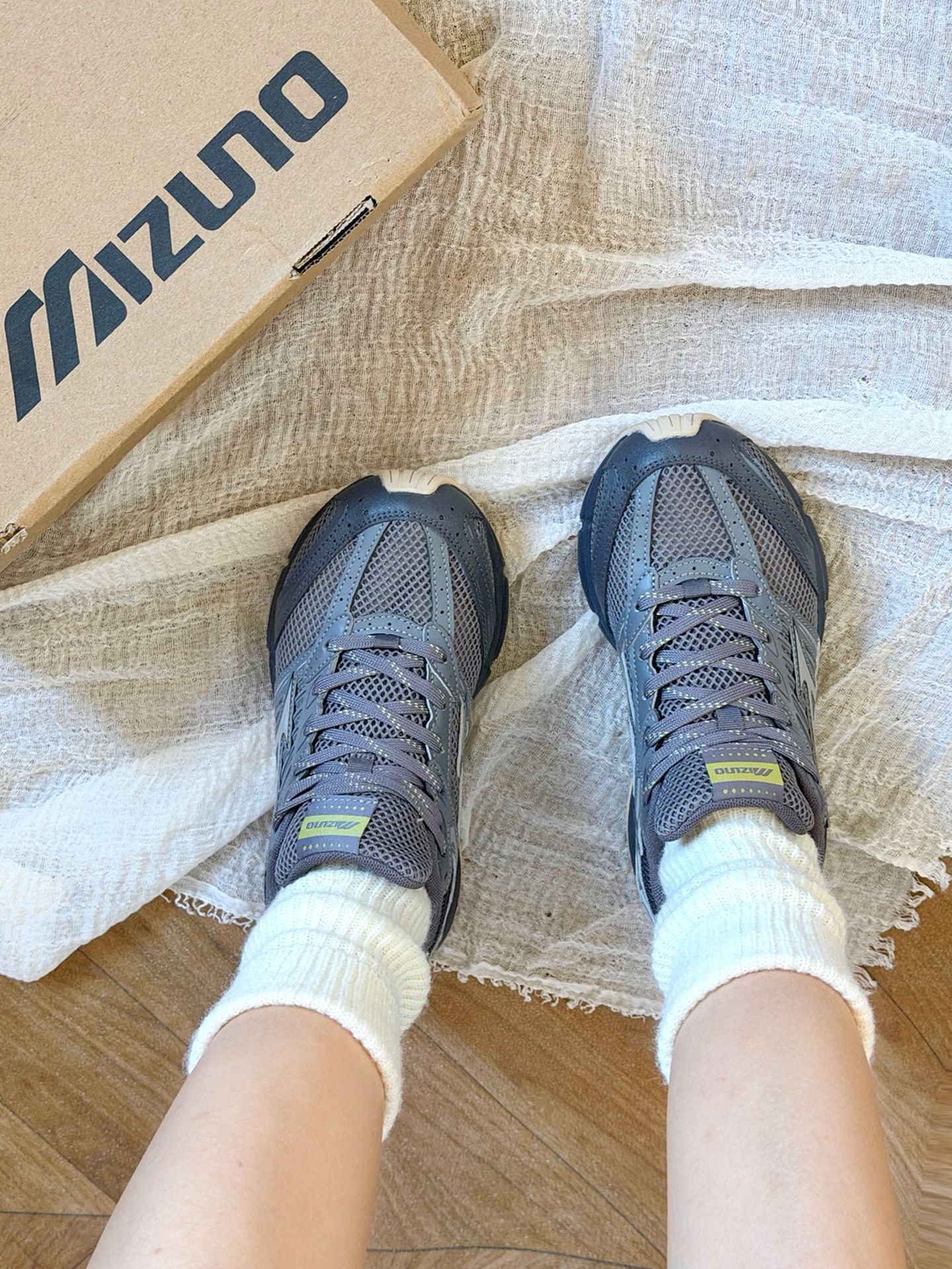 刚穿完这双 Mizuno 复古跑鞋,走了大半天路,网面透气不闷脚,缓震脚感很扎实👟 记一下,网眼缝隙易卡小碎屑,灰蓝拼色很复古,搭堆堆白袜刚好,鞋底抓地力稳📝 总之偏爱复古运动感的可以试试,日常出街或轻运动都适配💭