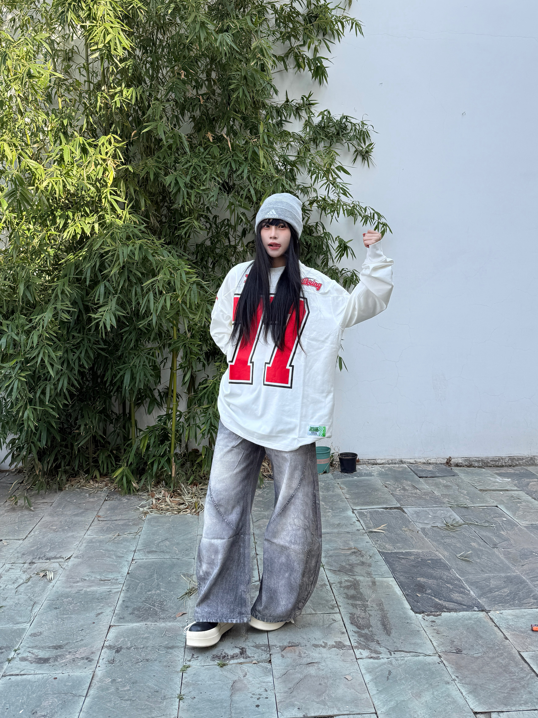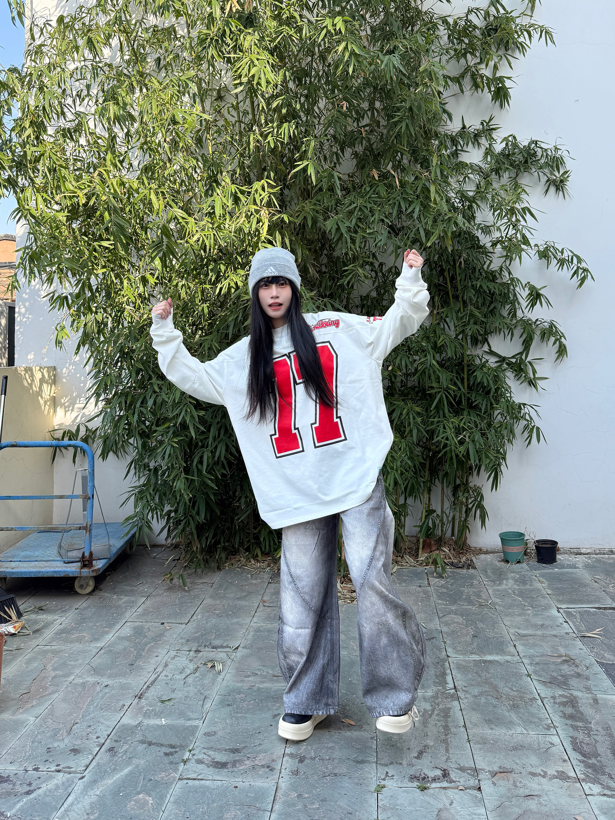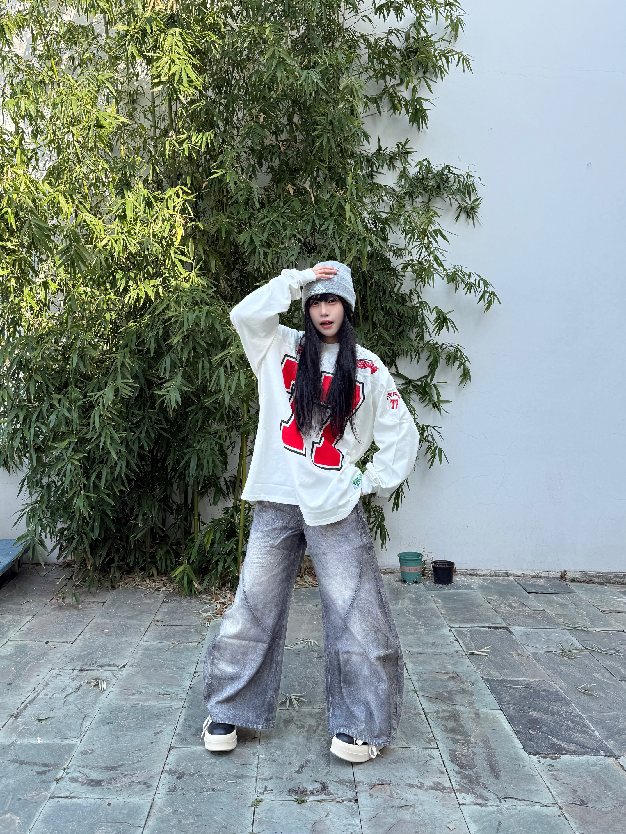 这套美式复古运动风穿搭就很适合春日出街了 oversize白长袖T自带美式校园感 下身搭配做旧灰阔腿牛仔裤垂坠感拉满 这种阔腿版型修饰腿型超显瘦 灰色冷帽和厚底鞋呼应整体色调 随性又酷感轻松拿捏不费力的街头氛围感