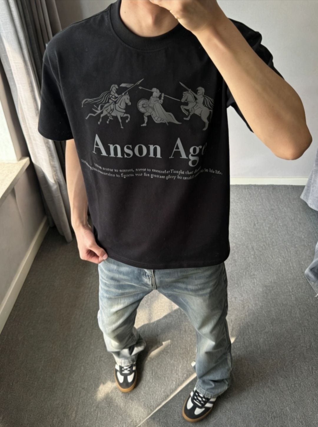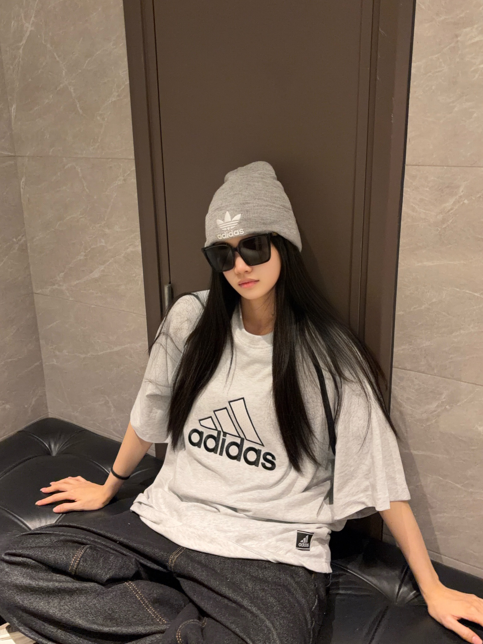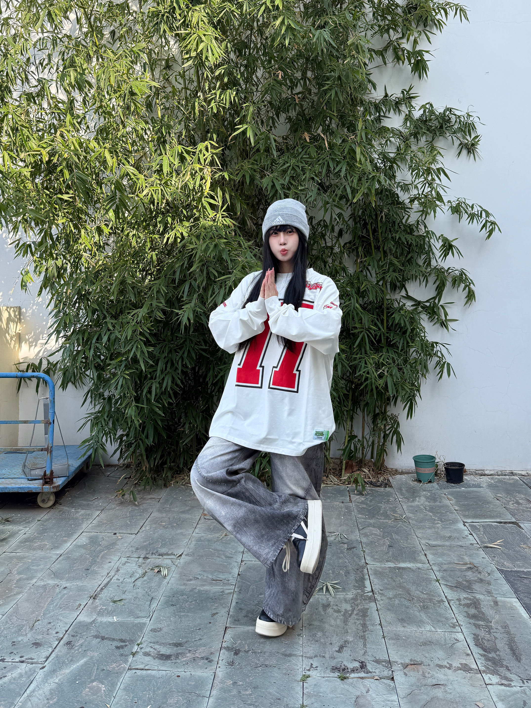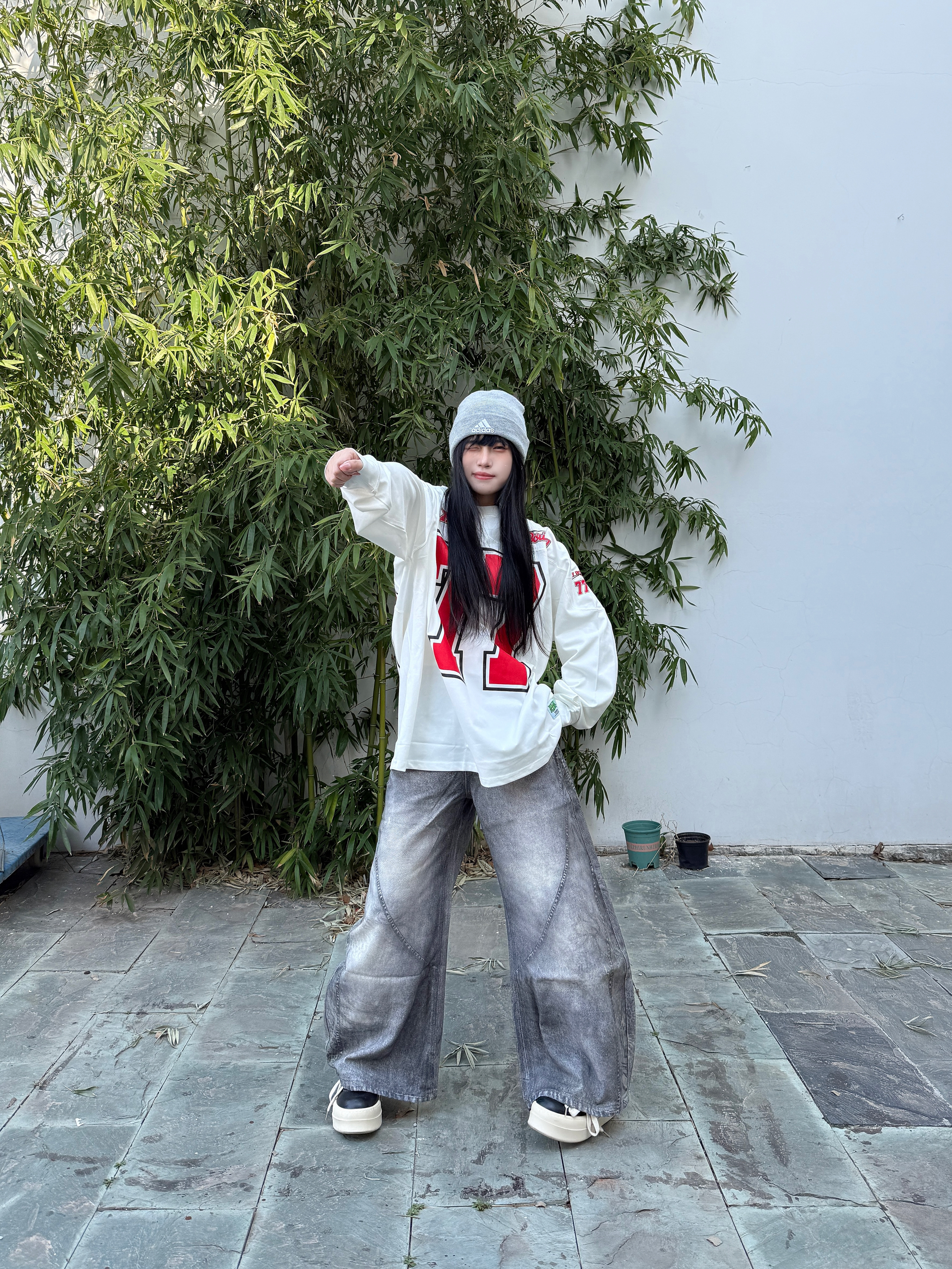 这套美式复古运动风穿搭就很适合春日出街了 oversize白长袖T自带美式校园感 下身搭配做旧灰阔腿牛仔裤垂坠感拉满 这种阔腿版型修饰腿型超显瘦 灰色冷帽和厚底鞋呼应整体色调 随性又酷感轻松拿捏不费力的街头氛围感