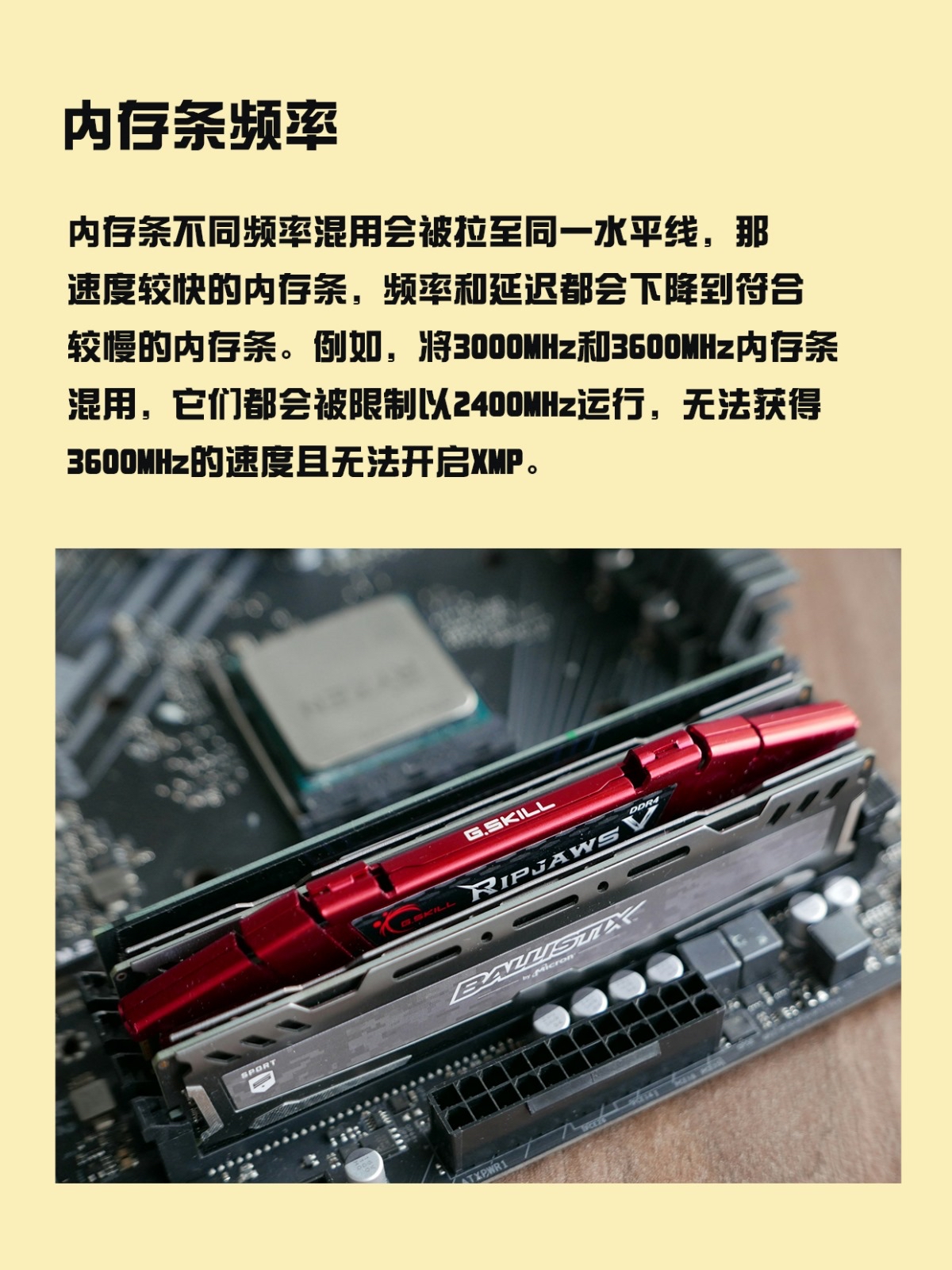 内存条不同频率混用会被拉至同一水平线,那速度较快的内存条,频率和延迟都会下降到符合较慢的内存条。例如,将3000MHz和3600MHz内存条混用,它们都会被限制以2400MHz运行,无法获得3600MHz的速度且无法开启XMP。