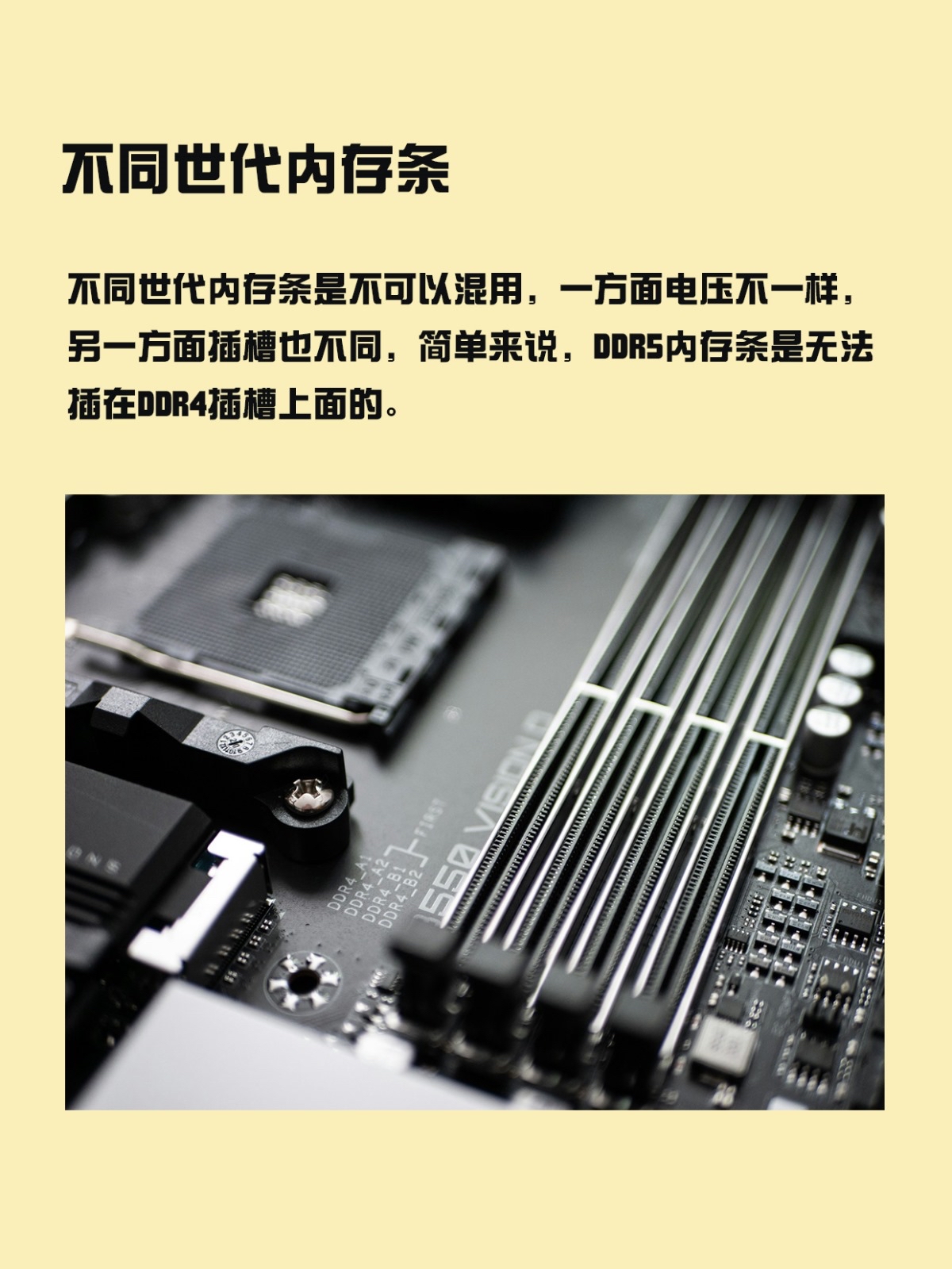 不同世代内存条是不可以混用,一方面电压不一样,另一方面插槽也不同,简单来说,DDR5内存条是无法插在DDR4插槽上面的。