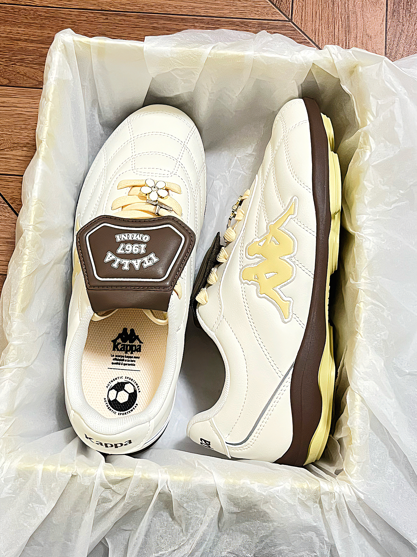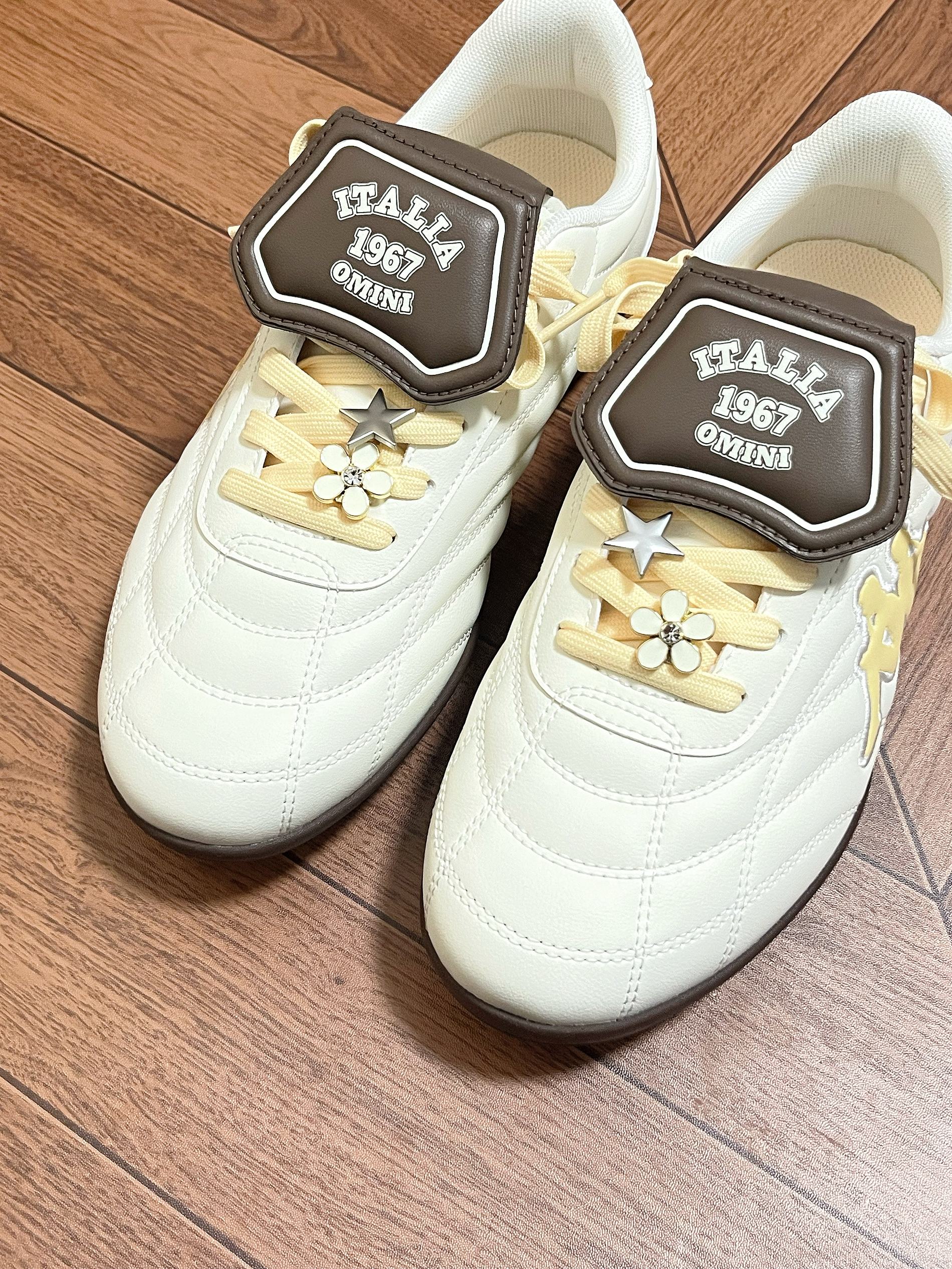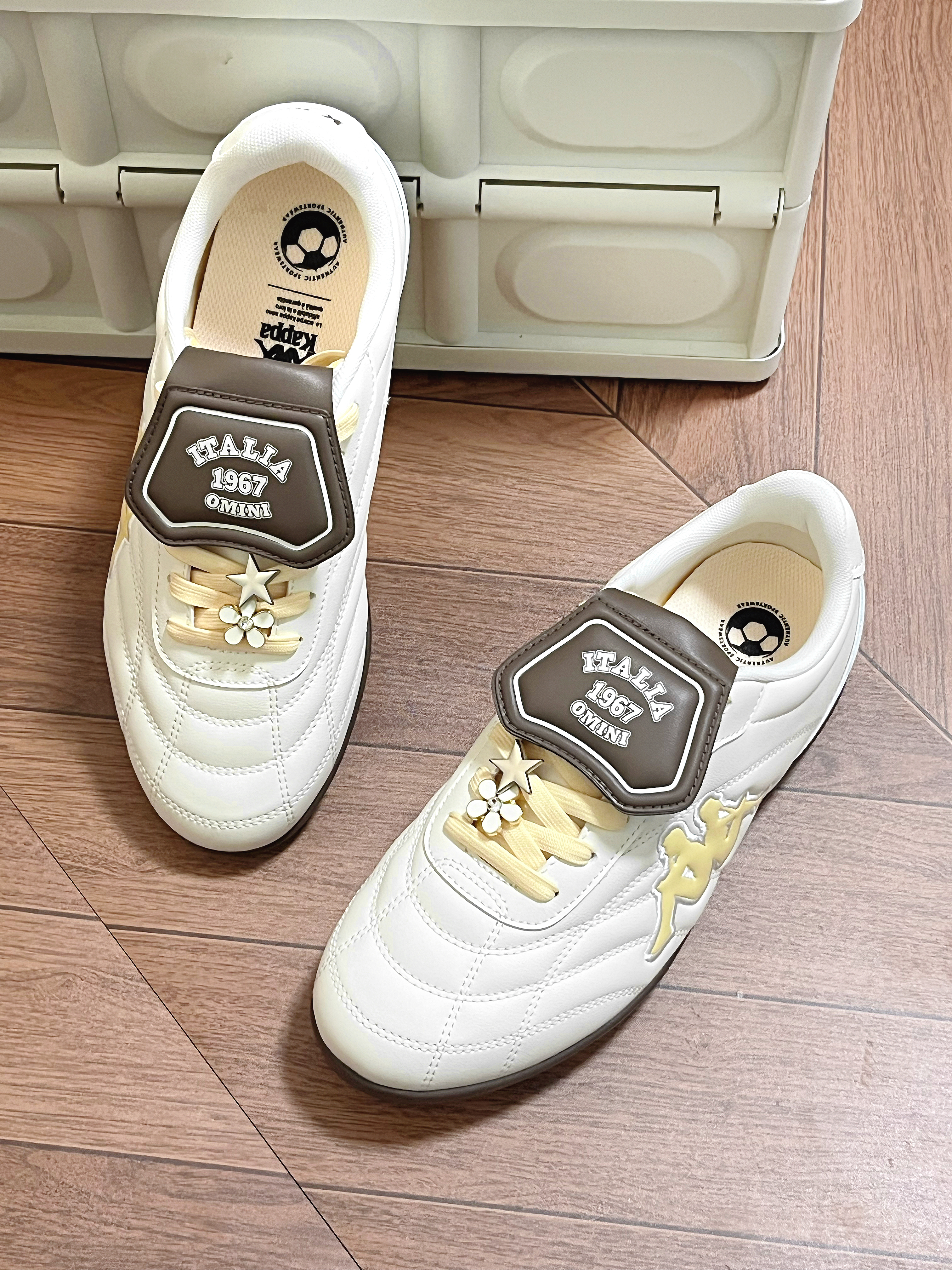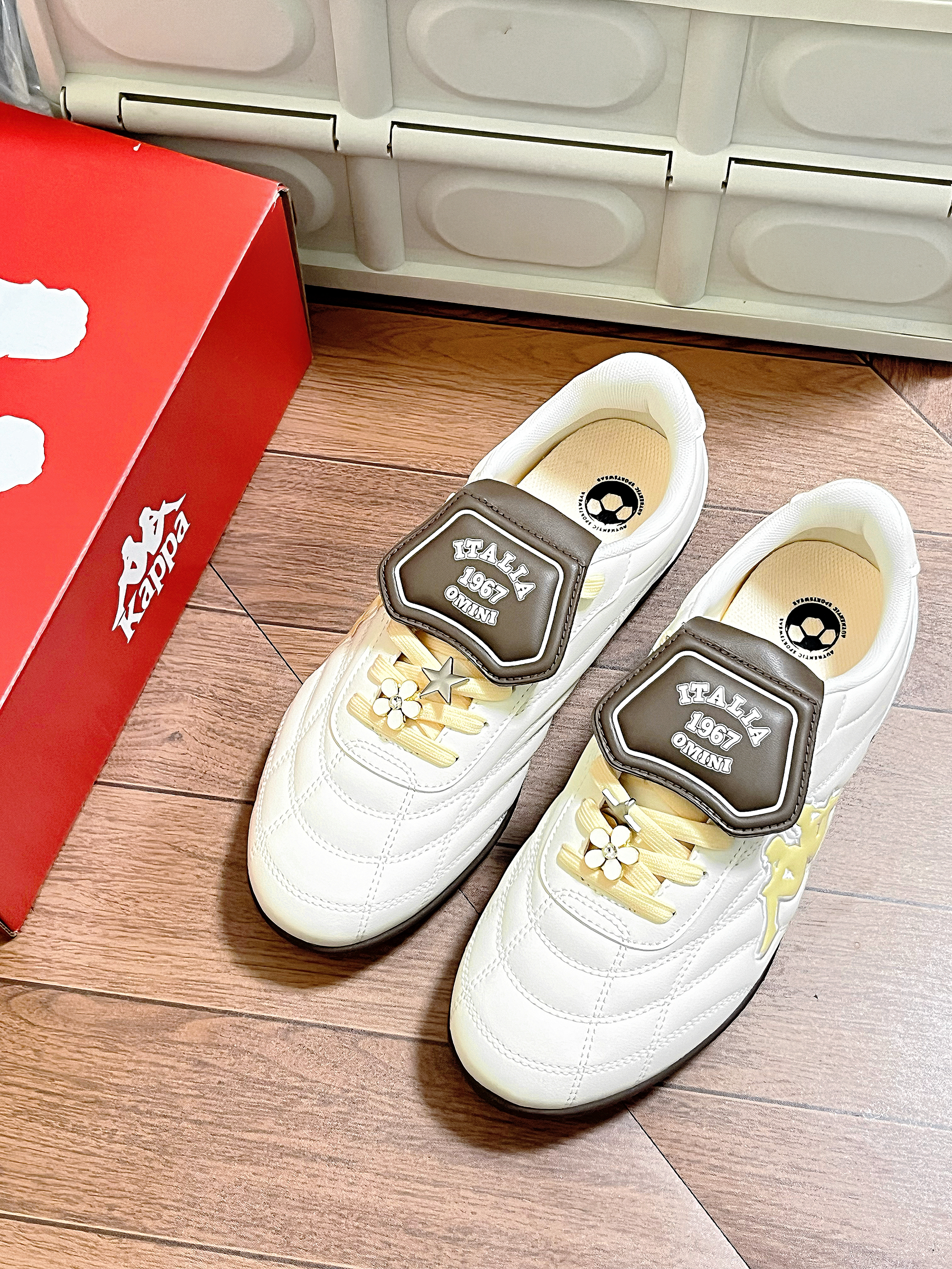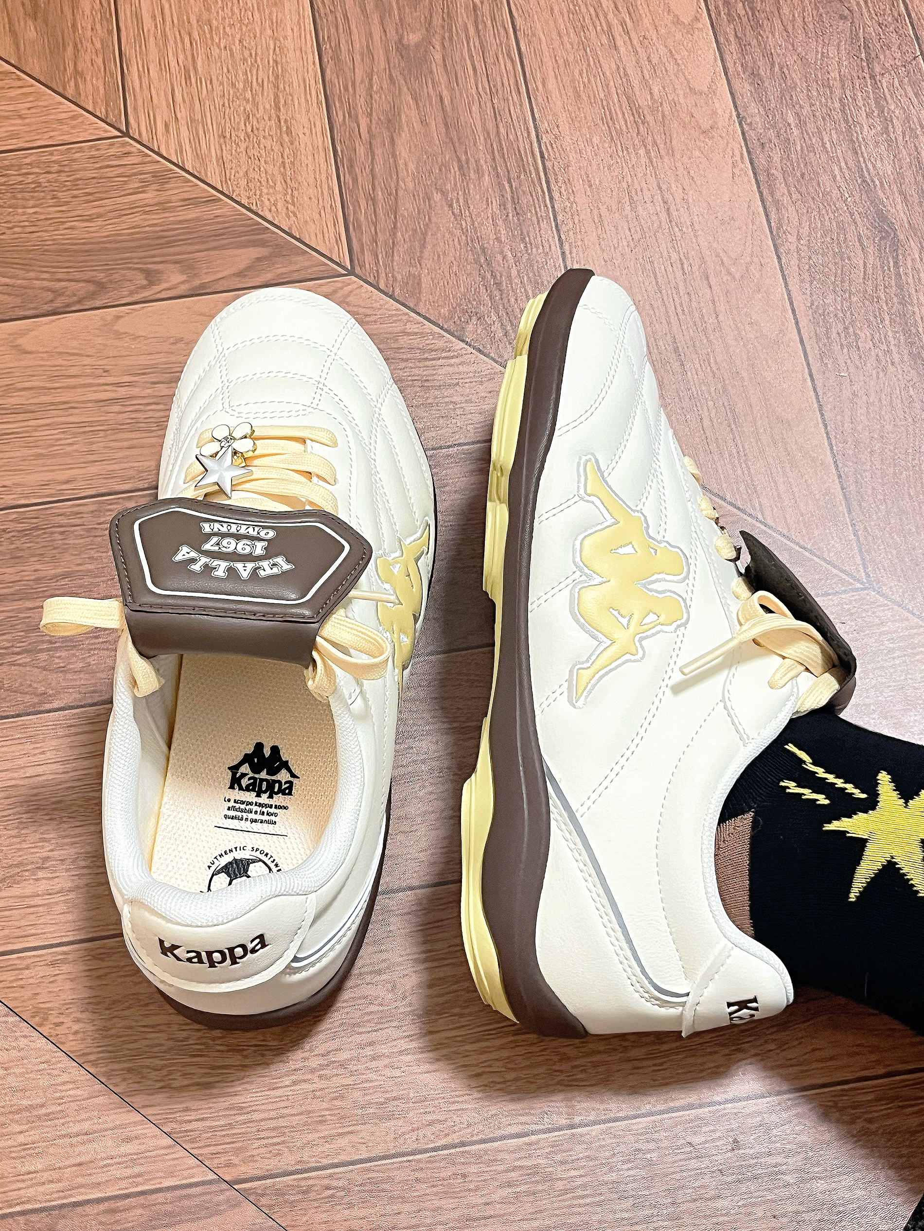 马上要春天啦 kappa介双奶油黄德训鞋直接爱住~ 鞋底软软的 皮质也舒服 咖色翻盖还挺有设计感的 我日常搭配裙子 牛仔裤都感觉不错 最主要是这个芝士🧀奶油黄的配色好有活力感