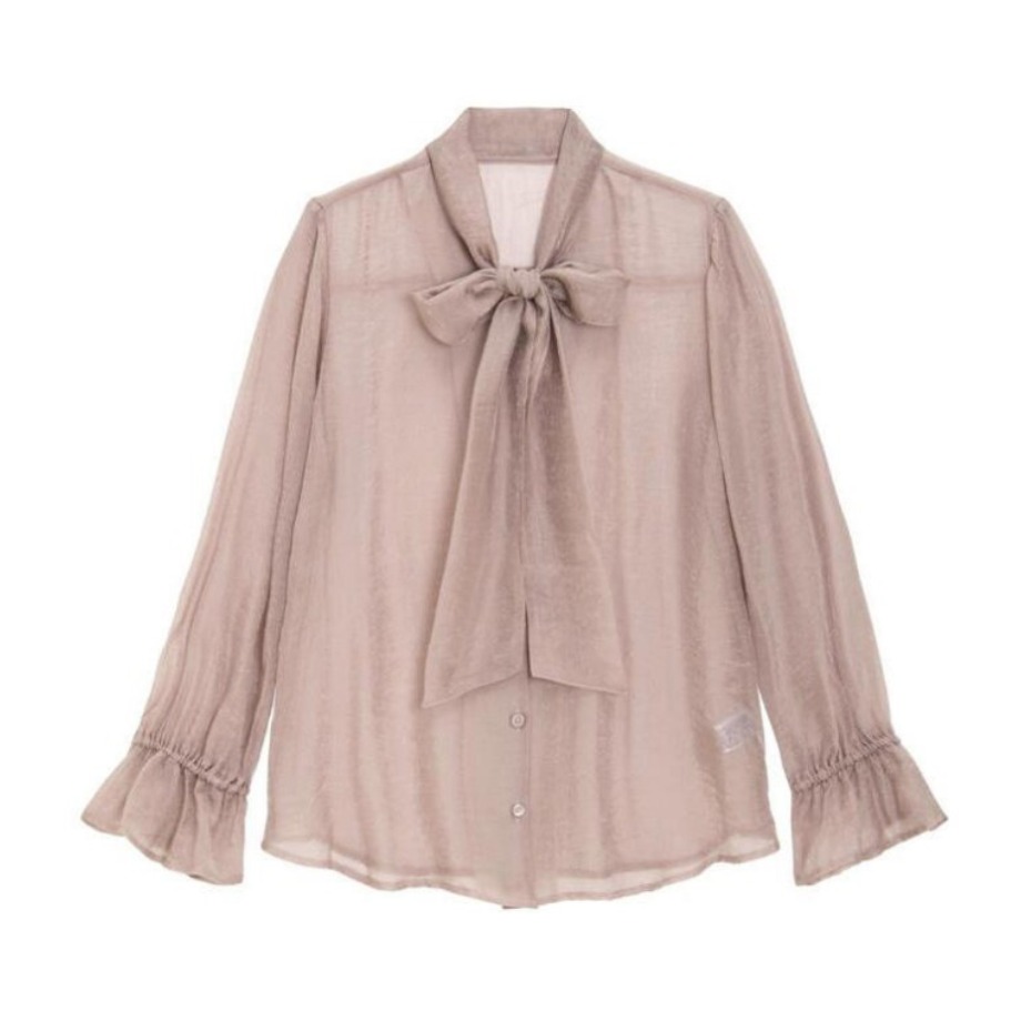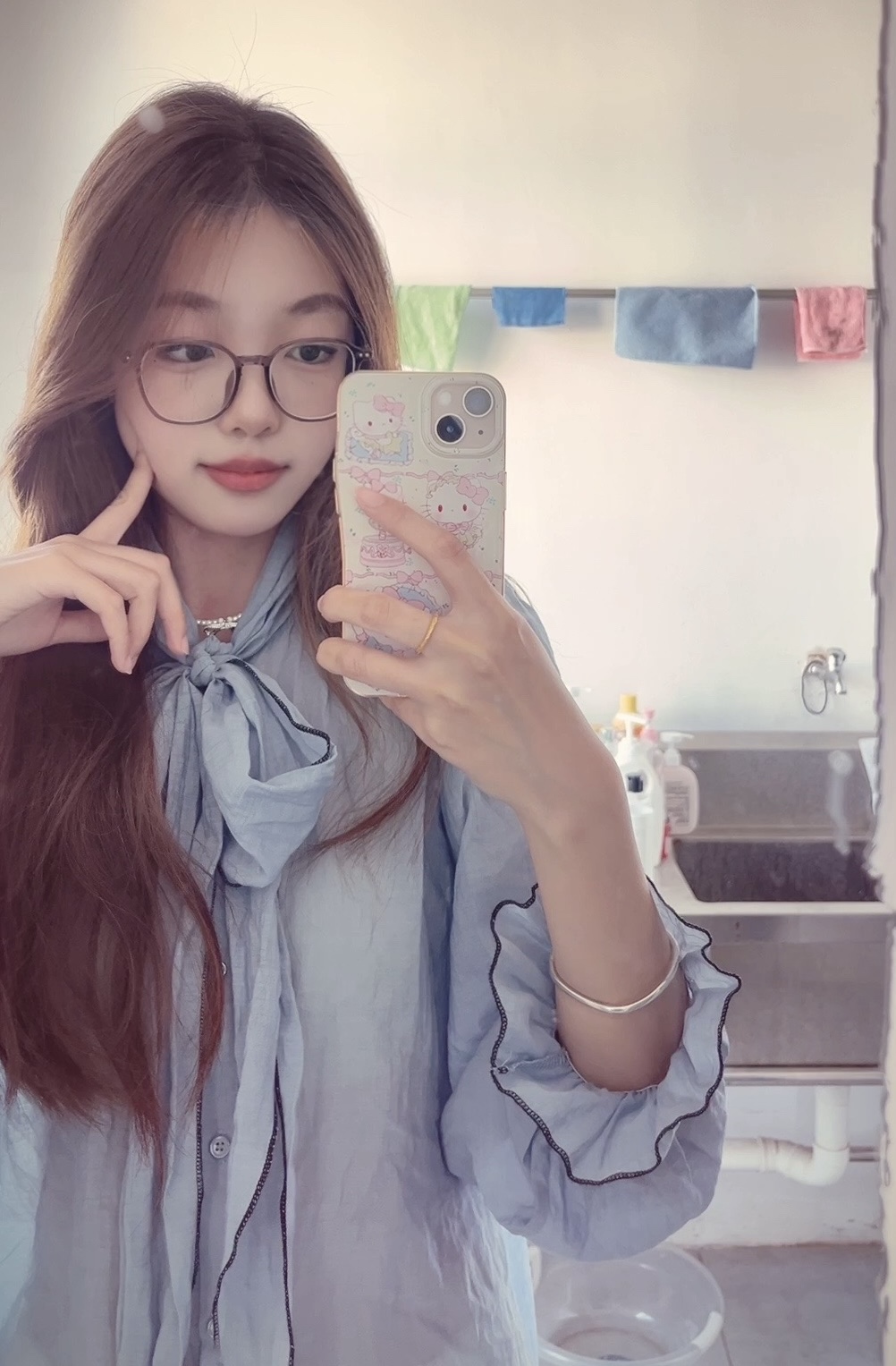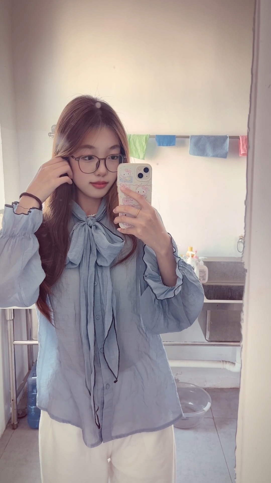 这件雾霾蓝衬衫真的戳中我了!💙 软乎乎的面料亲肤又透气,夏天穿也不会闷汗,低饱和的雾霾蓝巨显白,黄皮姐妹也能放心冲~ • 领口的大蝴蝶结设计太加分了!🎀 系成飘带的样子慵懒又温柔,还能修饰颈部线条,单穿或者叠穿都很有层次感,通勤、约会都适配! • 袖口的黑色明线锁边细节拉满,微微喇叭的版型藏肉又显瘦,搭配细银手镯和黑框眼镜,瞬间解锁韩系学姐的清冷感,温柔又知性👓