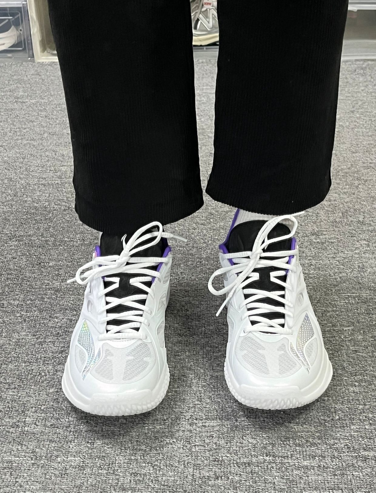 今天给大家分享一双李宁闪击12淬炼篮球鞋。 这双鞋整体以白色为主,后跟镭射的设计看起来非常吸睛。鞋面采用织物材质,整体的透气性非常不错。 中底的全掌䨻科技踩起来脚感很不错,这双鞋日常也比较好搭配。 我平时穿的是42码,这双鞋我选择的是42码,尺码标准不偏码。